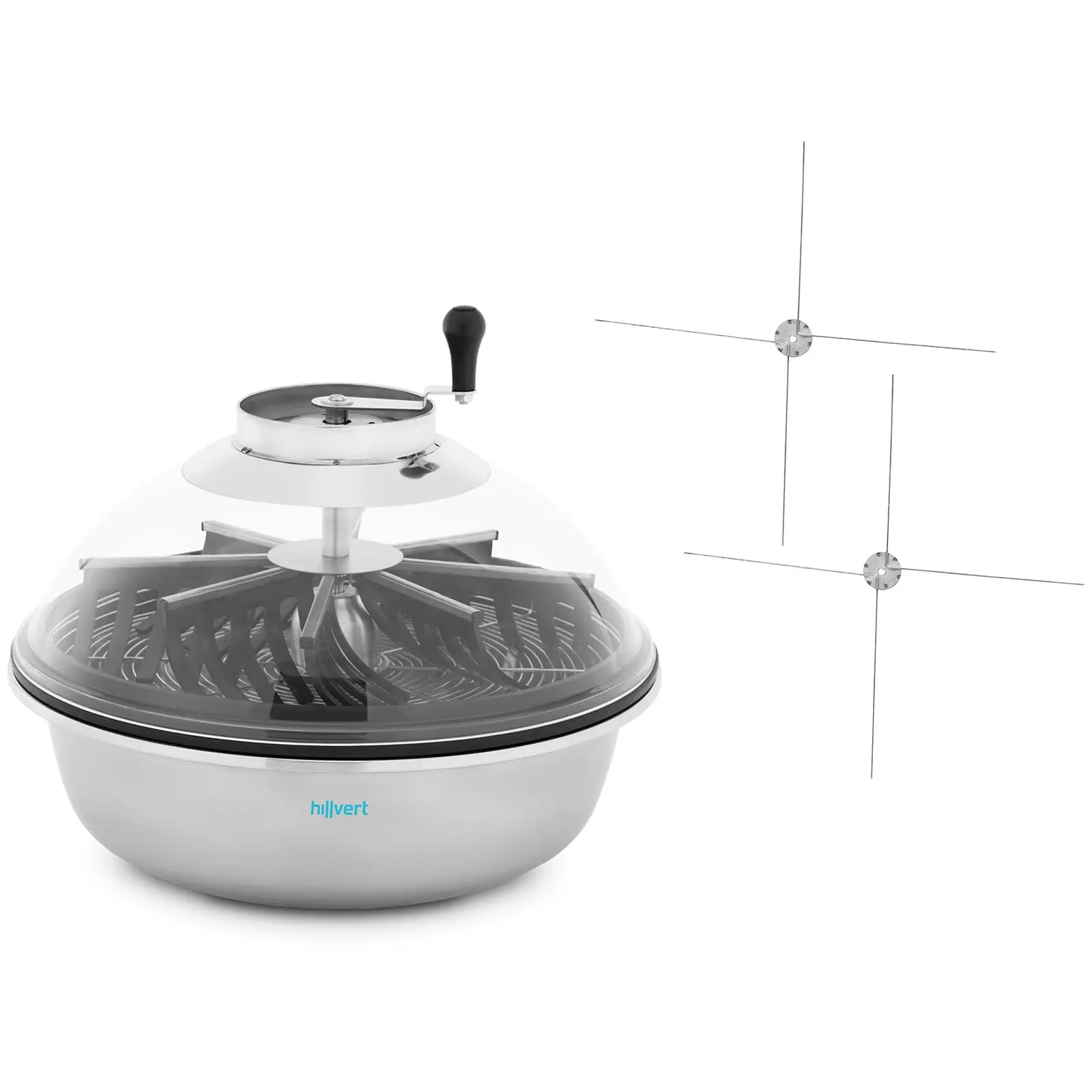 Haluatko leikata ja erottaa kasveja vaivattomasti? Nouda sitten HT-BT-24 -leikkuri myymälästä hillvert. Ne poistavat lehdet ja kukat kohdistetusti vain muutamalla käännöksellä ja pilkkovat lukuisten kasvien oksia ja oksia. Tai käytä kulhotrimmeriä eteeristen öljyjen, aromaterapiaöljyjen tai potpourrien ja pussien luomiseen kotikäyttöön. Löydät sadonkorjuutrimmerille laajan valikoiman käyttökohteita, etkä halua enää koskaan olla ilman sitä missään sadonkorjuussa! Sadonkorjuutrimmeri tarjoaa sinulle kaksi erityyppistä korkealaatuisesta ruostumattomasta teräksestä valmistettua veistä, joilla voit käsitellä monenlaisia kasveja. Suoran ja kahden lankaleikkurin vuorovaikutus antaa aina parhaan tuloksen. Halkaisijaltaan 600 mm kulhotrimmerin toiminnallisuus on hyvin yksinkertainen: Kasvit, joissa on tuoreita kukkia tai silmuja, asetetaan ritilälle, joka pysyy optimaalisesti paikallaan kumirenkaan avulla. Sopivat terät sijaitsevat arinan alla. Sulje laite kannella ja käännä kampea tasaisesti vasemmalle tai oikealle. Laitteen kannen yläosassa on kahdeksan joustavalla levittimellä varustettua vartta, joilla lehtiä tai silmuja voi liu’uttaa varovasti arinan läpi alla olevien terävien, ruostumattomien terien yli. Tämä erottaa lehdet ja silmut varovasti kasvista. Manuaalisella ajolla käytät trimmeriä virtalähteestä riippumatta, mikä tarkoittaa, että voit käyttää sitä joustavammin ja säästää rahaa. Ja hiljainen ajo ilman moottorin ääntä on myös paljon miellyttävämpi ympärilläsi oleville. Sinun tarvitsee vain kääntää kampea sinulle sopivalla nopeudella. Läpinäkyvän kannen ansiosta voit seurata työprosessia koko ajan ja arvioida tarkalleen, milloin kasvisi ovat saavuttaneet optimaalisen leikkaustason. Lisäksi voit puhdistaa muovisen kannen vain muutamalla yksinkertaisella vaiheella. Ruostumattomasta teräksestä valmistettu kotelo on erittäin vakaa ja vankka. Terälemmerin pieni paino helpottaa sen kuljettamista.