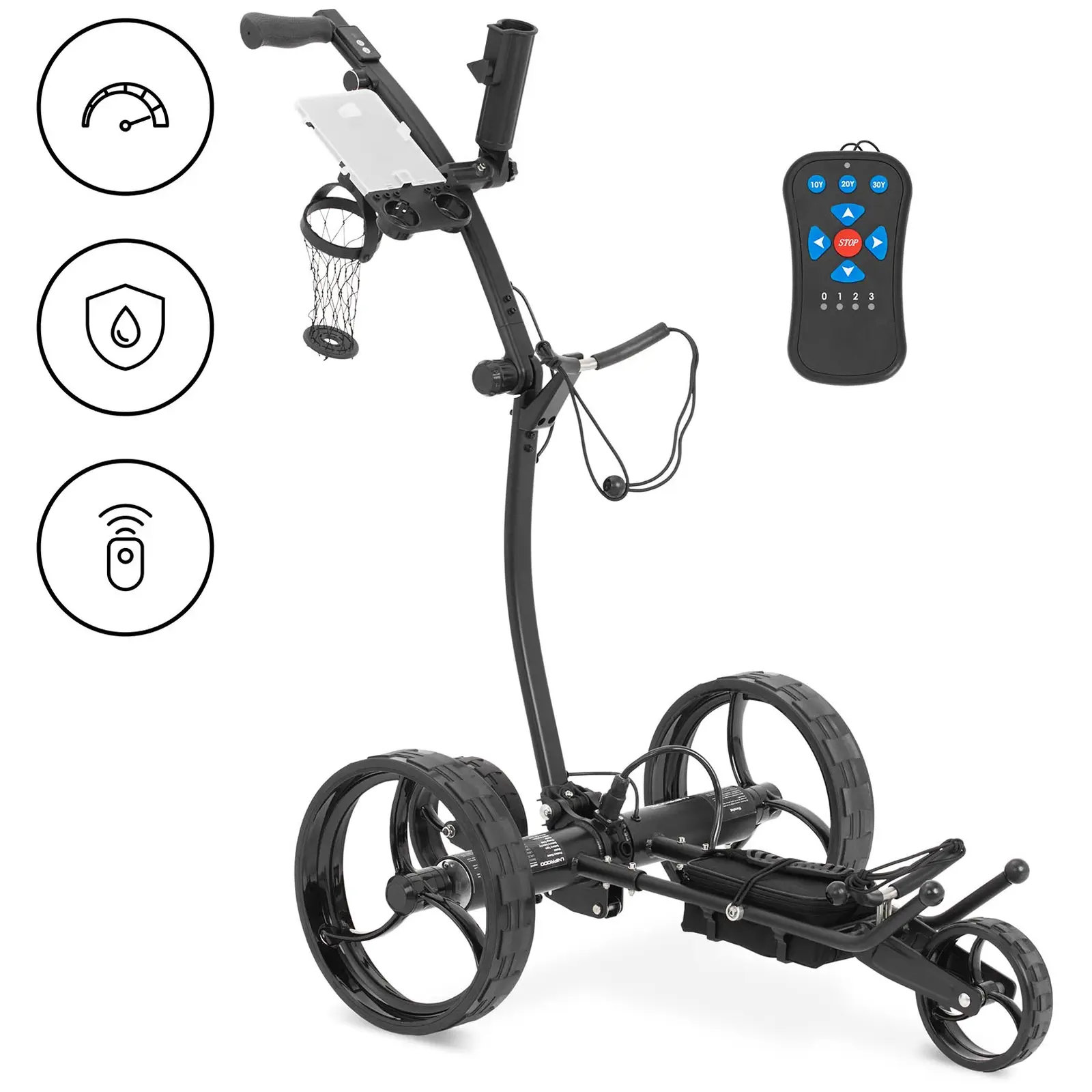 Oletko suuntaamassa golfkentälle? Uniprodon sähköinen golfkärry kantaa jopa 20 kg painavat varusteet ja kuljettaa ne reiältä toiselle. Kahden sähkömoottorin ansiosta voit helposti kuljettaa mailat, laukut, virvokkeet jne. golfkentän poikki, hotellin aulan läpi ja aina väylälle asti. Moderni golfkärry voidaan taittaa kompaktiin kokoon muutamalla yksinkertaisella toimenpiteellä, jolloin se mahtuu kätevästi pienimpäänkin tilaan. Kaksi voimakasta moottoria, joista kummankin teho on 90 W, liikuttavat golfkärryä tehokkaasti monenlaisilla alustoilla. Säänkestävien materiaalien ansiosta sähkö-golfkärry sopii käytettäväksi rankemmissakin olosuhteissa. Kaksi suurta, kumipäällysteistä pyörää takaavat, että kärry kulkee erityisen tasaisesti. Kaksi pienempää pyörää pitävät puolestaan nämä golf-sähkökärryt luotettavasti pystyssä. Kärry selviytyy jopa 20°:n kaltevuudesta. Valitse käyttöön mieleisesi hallintalaite: voit ohjata kärryä sen kahvassa olevalla ohjauspyörällä tai vaihtoehtoisesti kaukosäätimellä. Kaukosäätimen avulla voit liikuttaa kärryä eteenpäin, taaksepäin, oikealle tai vasemmalle. Lisäksi se toimii pidemmältäkin etäisyydeltä ja pysäyttää kärryn napin painalluksella. Sähkökärry golfkäyttöön sisältää jarrujärjestelmän, joka on myös täysin sähkökäyttöinen. Näin hallitset kärryn nopeutta tarkasti ja jarrutat sitä pehmeästi. Tehokas litiumioniakku toimii jopa 20 tuntia. Kukin lataus kattaa n. 20 km matkan. Latausaika on 4 tuntia. Kevyestä alumiinista valmistetut sähkökärryt golfkäyttöön ovat moderni, hiljainen ja ympäristöystävällinen apuväline. Voit ladata kärryn akun jopa 600 kertaa.