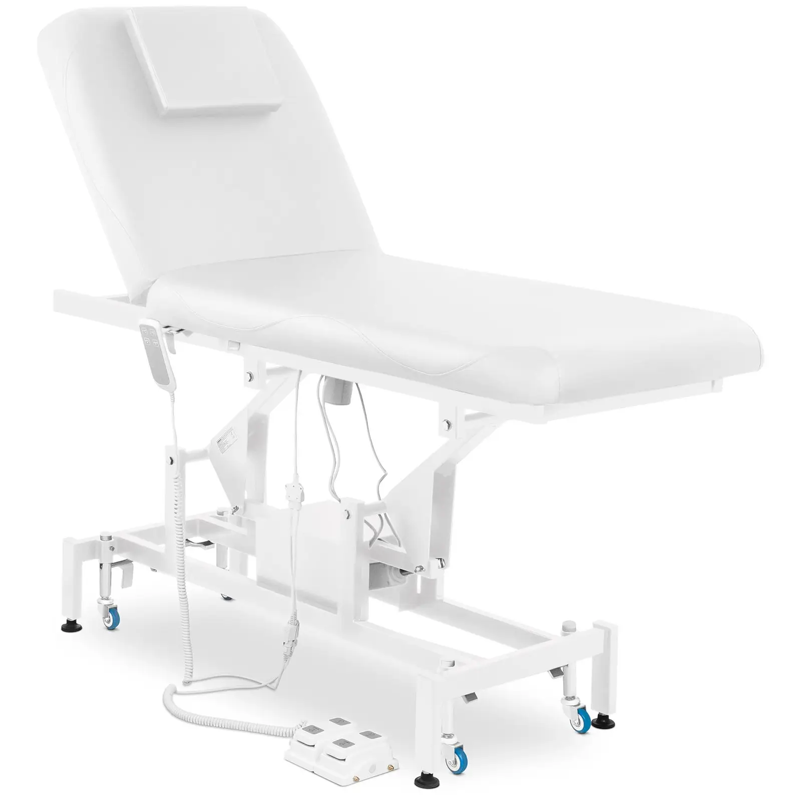 Physan korkeudesta säädettävä sähköinen hierontapöytä PHYSA LYON WHITE on ihanteellinen varuste erityisesti fysioterapeuteille, hierojille tai kosmetologeille käytettäväksi vastaanotoilla, studioissa tai kylpylä- ja hoitolatiloissa. Erityinen rakenne erilaisine toimintoineen, kuten esimerkiksi selkänojan säädettävä kallistuskulma ja ergonomiset edellytykset sekä asiakkaiden, kuten myös terapeuttien tarpeet on otettu ihanteellisesti huomioon hierontapöydän suunnittelussa. Täten rentoutuminen ja selkäystävällinnen hoito on taattu. Tämä pöytä erottuu edukseen erittäin vankalla rakenteellaan ja tukevuudellaan ja se on varustettu polkimella ja kaukosäätimellä. Selkänoja voidaan kallistaa 6 – 60 astetta – hoitomuodosta riippumatta tarvittava asento on aina valittavissa täydellisesti. Selkänojan ja päätuen haluttu kulma, kuten myös pöydän korkeus on erittäin helposti säädeltävissä polkimella tai kaukosäätimellä. Päätukeen on integroitu tuuletusaukko, joka voidaan tarvittaessa sulkea tyynyllä – mahdollistaa hoitotoimenpiteen suorittamisen riippumatta siitä, onko asiakas selällään vai mahallaan toimenpiteen aikana. Selkänojan pehmeä, 8 cm paksu vaahtomuovitäytteinen pehmuste ja vastaava istuimen/makuualustan 10 cm paksu pehmuste takaavat mukavuuden. Päällyste on kestävää keinonahkaa ja takaa helpon ja hygieenisen puhdistuksen. Helposti liikkuvat, 360° pyörivät kumipyörät helpottavat pöydän liikuttelua ja ehkäisevät lattian naarmuuntumisen – pyörien seisontajarrut takaavat sen sijaan pöydän paikallaan pysymisen varmasti ja tukevasti hoitotoimenpiteen aikana. Näin ollen sekä liikuteltavuus että vankkuus on taattu. Lisä lujuutta pöytään tuovat sen teräsrunko ja neljä vankkaa jalkaa. Pöytä on säädettävissä sopivaksi toimenpiteen vaatimusten ja asiakkaiden tarpeiden mukaan. Esimerkiksi liikuntarajoitteiset tai selkävamman omaavat asiakkaat tarvitsevat eri korkeuden asettuakseen pöydälle kuin asiakkaat, joilla vastaavia rajoitteita ei ole. Kahden tehokkaan 50 watin moottorin avulla pöydän korkeutta voidaan säätää 18 sekunnin sisällä 68 ja 90 senttimetrin välillä. Selkänojan tapauksessa säätö onnistuu 16 sekunnissa. Ja tämä kaikki helposti polkimen tai kaukosäätimen avulla. Physan sähköinen hierontapöytä kantaa jopa 200 kg. Täydellisesti yhteensopivat ja hyvälaatuiset valmistusmateriaalit antavat hierontapöydälle elengantin ulkonäön ja tekevät siitä helppohoitoisen ja helposti puhdistettavan, koska keinonahkapäällyste on täysin nestettä ja pölyä hylkivä. Kestävä teräs ja lujatekoinen rakenne mahdollistavat hierontapöydän pitkäikäisyyden myös jatkuvassa käytössä.