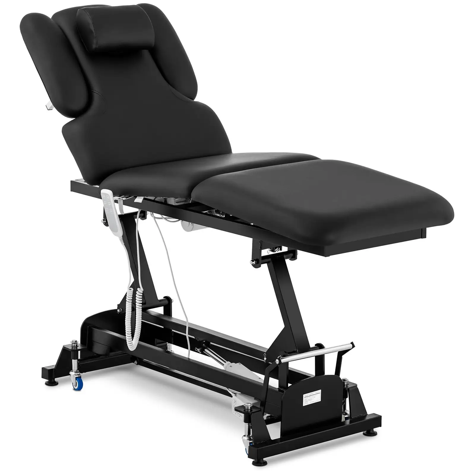 Fysioterapia- ja hierontavastaanotot, kosmetiikkastudiot tai jopa kylpylä- ja wellness-tilat saavat tästä korkeussäädettävästä, sähköisestä hierontapöydästä ihanteellisen työvälineen. Mustan hierontapöydän erittäin vakaa rakenne, erilaiset toiminnalliset asetukset ja tason erinomainen ergonomia on suunniteltu täydellisesti asiakkaiden ja terapeuttien tarpeisiin. Säädettävää selkänojaa (-20° – 65°) voidaan säätää kauko-ohjauksella vaihtelevasti kaikkiin hoitotarpeisiin. Voit valita istuma-asennosta makuuasentoon, hoitotyypistä riippuen. Hierontapöydän pääosaan on sisäänrakennettu aukko, joka voidaan tarvittaessa sulkea mukana toimitetulla tyynyllä – selällään tai mahallaan tapahtuvien hoitojien perusvaatimus. Kolme tehokasta 100 W:n tehoista moottoria tekee hierojan työstä erittäin miellyttävää ja helpottaa jokapäiväistä elämää. Selkänojan lisäksi hoitopöydän työskentelykorkeutta (53-94 cm), istuinkulmaa ja jalkatukea (0-20 °) voidaan myös säätää optimaalisesti. Tämä tarkoittaa, että saavutat aina juuri tarvitsemasi asennon eri terveys- ja kauneushoitoja varten. Pehmeän vaahtomuovitäytteen (6-8 cm), pääosan tyynyn ja tekonahkapäällisen ansiosta tarjolla oleva hierontapöytä on erittäin miellyttävä. Se takaa korkean mukavuuden koko hoidon ajan. Tarvittaessa käsinojat voidaan kiinnittää pöytään. Physan kompakti hierontapöytä tarjoaa 200 kg:n maksimikuormituskyvyn. Täydellisesti toisiaan täydentävien materiaalien ansiosta hieromataso näyttää tyylikkäältä, on helppo puhdistettava ja ylläpidettävä. Vettä ja öljyä hylkivä synteettinen nahkapäällyste ei ime nesteitä eikä pölyä. Hierontapöytään on rakennettu paperipyyheteline parhaan hygienian takaamiseksi. Laadukas metalli ja kestävä rakenne takaavat myös hierontapöydän pitkäikäisyyden. Hoitopöytää voidaan tarvittaessa siirtää vaivatta taitettavien pyörien ansiosta.