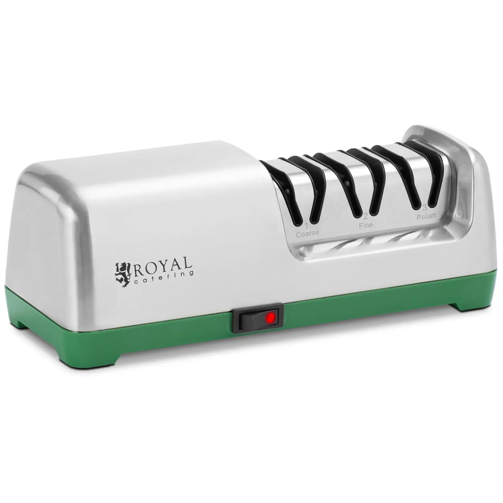 Laadukkainkin veitsi tylsyy ajan myötä. Royal Cateringin ammatti-veitsileikkuri saa veitsen kuin veitsen terään muutamassa sekunnissa. Integroidut timanttikiekot takaavat tarkan teroituksen sekä tavallisille keittiöveitsille että ravintolakäyttöön suunnitelluille veitsille. 20 W:n moottorilla varustettu laite poistaa teroituksen yhteydessä vain vähän materiaalia, jolloin veitset kestävät käytössä pitkään. Paras veitsenteroitin sisältää useamman kuin yhden teroitustason: tässä teroittimessa onkin karkea esiteroitus, hienoteroitus ja kiillotus. Tämä takaa sinulle tarkasti ja ammattimaisesti teroitetut veitset missä tahansa käyttökohteessa. Laitetta on helppo käyttää myös ilman aiempaa kokemusta. Aseta vain veitsi teroitusloveen. Vedä se sitten varovasti pyörivien hiomalaikkojen läpi muutaman kerran. Teroittimen kuminen pohja pitää laitteen tukevasti paikallaan. Laite tekee vaikutuksen kestävällä ruostumattomasta teräksestä valmistetulla kotelollaan ja on sen ansiosta erittäin vakaa ja helppo puhdistaa. Laite kerää teroitustähteet lokeroon sen alaosassa sijaitsevan magneetin avulla.