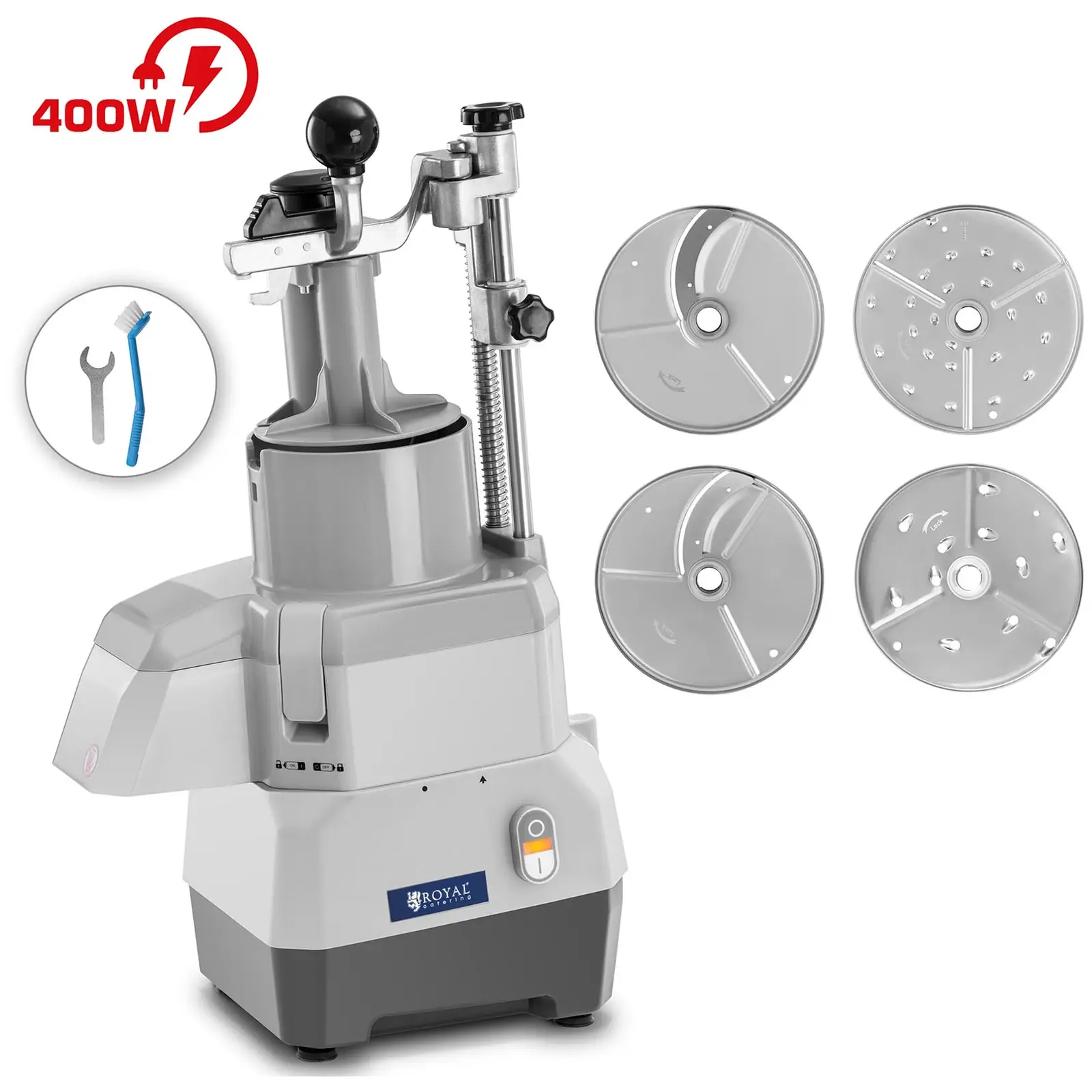 Jos leikkaat suuria määriä vihanneksia tai hedelmiä, valitse korkealaatuinen korroosionkestävistä materiaaleista valmistettu tuote, joka on helppo puhdistaa ja jota voidaan käyttää myös jatkuvasti ilman ongelmia. Royal Catering:n sähköinen vihannesleikkuri täyttää nämä kriteerit ja nopeuttaa merkittävästi työprosessejasi ravintola-alalla niin ravintolassa, ruokalan keittiössä kuin välipalabaarissa. Tällä tehokkaalla vihannesleikkurilla voit pilkkoa porkkanoiden, sipulien tai sellerin lisäksi erilaisia hedelmiä ja jopa pehmeitä juustoja. Kone, jota voidaan käyttää intuitiivisesti, tarvitsee vain yhden kytkimen – sen kytkemiseksi päälle ja pois. Valtavalla 400 W teholla moottori varmistaa, että veitsenterävät leikkuulevyt pyörivät nopeudella 1500 rpm. 174 mm:n halkaisijan ansiosta voit leikata tai raastaa suuria määriä vihanneksia ja hedelmiä erittäin lyhyessä ajassa. Laite on aina vakaa ja vähävärinen työpöydälläsi neljällä kumijalalla. Erityisen käytännöllinen: Käytä pitkänomaisille vihanneksille työntimellä varustettua sivuuraa ja täytä normaalin muotoiset lajikkeet vihannesleikkuriin aukon kautta. Muovisen peukaloinnin ansiosta mikä tahansa ruoka voidaan puristaa aukkoon ja käsitellä kokonaan ilman riskiä. Tämä suojaa käsiäsi teriltä. Nokka on suunniteltu siten, että sen alle on helppo laittaa kulho. Neljä mukana toimitettua tukevasta ruostumattomasta teräksestä valmistettua terälevyä, joista kaksi on ritilälevyjä (3/7 mm) ja kaksi viipalointilevyjä (2/4 mm), voidaan vaihtaa muutamassa yksinkertaisessa vaiheessa. Levyt, kuten muovikotelo (ABS), ovat elintarviketurvallisia ja täyttävät myös tiukimmat kansainväliset hygieniastandardit. Jos vaihdat viipaleita, vihannesleikkuri sammuu automaattisesti.