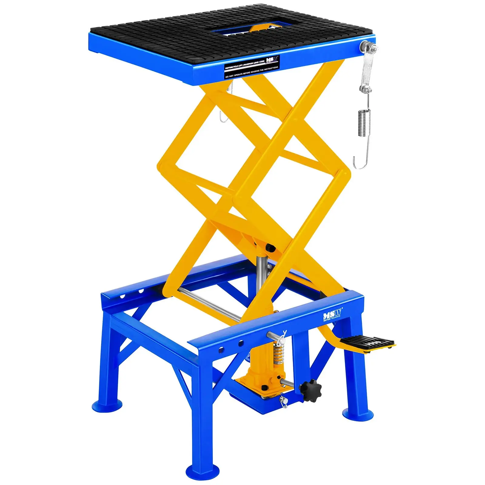 MSW Motor Technics:n MSW-MHB-135 kompakti saksinostin 135 kg kantokyvyllään sopii erityisen hyvin motocrosspyörien, scoottereiden ja Enduro-moottoripyörien korjaukseen ja mahdollistaa pyörän noston korjausta tai huoltoa varten miellyttävälle työkorkeudelle 87 cm maksimikorkeudellaan. Nostolavan kumipäällysteinen 41 x 35 cm taso tarjoaa reilusti tilaa työkalujen säilytykseen kädenulottuvilla. Teräsrakenteen neljä tukevaa jalkaa takaavat nostimen tukevuuden ja motocrosspyörä voidaan kiinnittää sivuilla olevien u-kiinnikkeiden avulla tukevasti hihnalla nostimeen. Nostohissi nostaa pyörän haluttuun työkorkeuteen. Lavan nosto ja lasku ei vaadi sähköä, koska nostohissi on ohjattavissa helposti jalkapolkimella ja näin saavutetaan haluttu korkeus 35 ja 87 cm väliltä. Lukitustanko takaa nostimen paikallaanpysymisen valitussa korkeudessa. Kierrenupista säätämällä saksinostin voidaan laskea tasaisesti päästämällä ilmaa ulos hissistä. Helppokäyttöisyytensä ja kompaktin rakenteensa vuoksi saksinostimella voidaan nostaa enimmillään 135 kg painoisia kappaleita. Saksinostin toimitetaan yhtenä kappaleena lukuunottamatta nostopoljinta, joka voidaan yksinkertaisesti liittää nostimeen ruuveilla. Hydraulisen nostomekanisminsa ansiosta laitetta voidaan hyvin säilyttää myös matalissa lämpötiloissa.