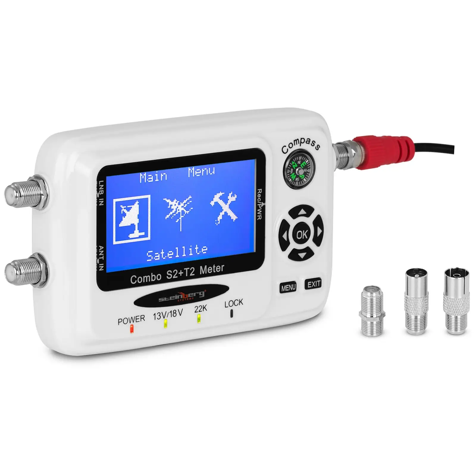 Satelliittiantennin suuntausmittari SBS-SF-300 määrittää satelliittilautasten tai antennien vastaanottamaa signaalinvoimakkuutta. Mittalaite on täten välttämätön apu TV-teknikoille, mutta helpottaa myös vastaanottimen suuntausta kuvanlaadun parantamiseksi esimerkiksi leirintäalueella lomailtaessa. Mittalaite maanpäällisten signaalien ja satelliittisignaalien mittaamiseen on varustettu selkeällä LCD-näytöllä, jolla erilaisten signaalien voimakkuus esitetään erittäin selkeästi. Satelliittiantennin suuntausmittari havaitsee signaalimuodot DVB-S, DVB-S2, DVB-T ja DVB-T2. Täten satelliittilautaset ja antennit voidaan suunnata optimaalisesti aina parhaimman kuvanlaadun vastaanottamiseksi. Mittari mittaa lukuisten satelliittien paikkatiedot parhaan satelliittiyhteyden varmistamiseksi. Standardien DISEqC1. 0 ja USALS avulla laite vastaanottaa suunnasta riippuen optimaalisesti erilaisia satelliittisignaaleja. Spektrianalysaattori mahdollistaa vastaanotettavan signaalin hienosäädön. Tämän lisäksi myös transponderitietoja voidaan työstää signaalien parantamiseksi. Satelliittimittari on varustettu USB-liittimellä, jonka avulla laitteen ohjelmisto voidaan tarvittaessa päivittää. Satellittimittarissa on vakiona kaksi F-liitintä. Sisäänrakennettu kompassi helpottaa suuntaamista vastaanotinta asetettaessa.