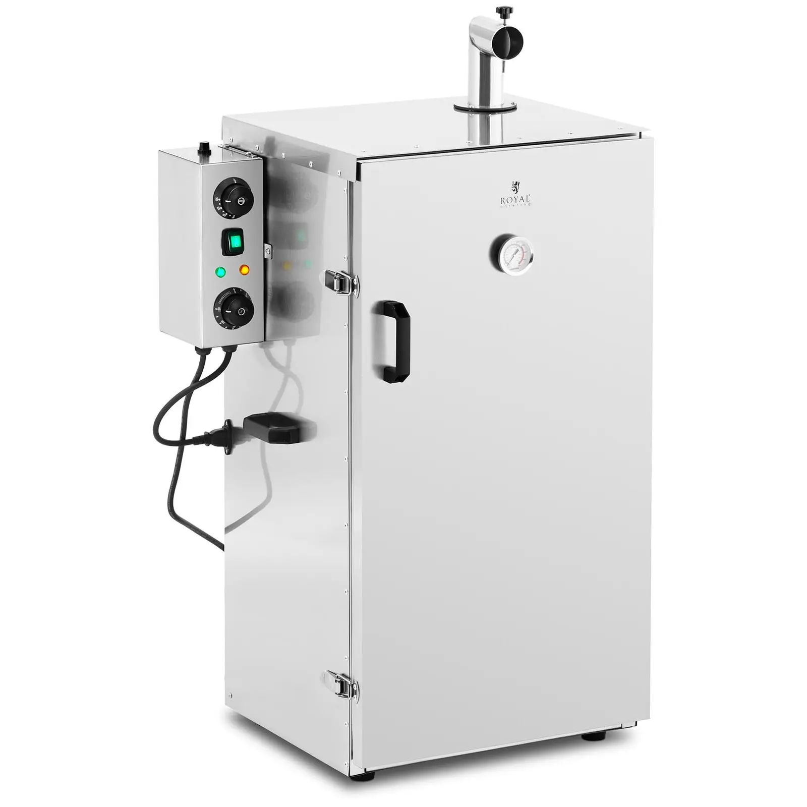 Tyylikäs savustin RC-FS870 on suunniteltu ammattikäyttöön ravintoloissa, majataloissa, hotelleissa ja maatilamatkailuyrityksissä. Savustinta käytetään erilaisten tuotteiden, kuten juuston, makkaroiden, siipikarjan ja riistan, sekä kalan lämmin- ja kuumasavustukseen. Laite on suunniteltu jatkuvaan käyttöön sekä käytettäväksi ajastimella, jotta voit saavuttaa sillä haluamasi tulokset. Voit valita savustusajan 0 – 120 min väliltä, joten savustus onnistuu minuutin tarkkuudella. Hälytyssignaali ilmoittaa asetetun ajan umpeutumisen. Jos tavoiteltua kypsyysastetta ei ole vielä saavutettu ensimmäisen ajastusajan umpeutuessa, on ajastin helppo asettaa uudelleen päälle. Suosituksemme: anna kalan kuivua hyvin ennen savustamista. Tämä on ainoa tapa antaa savustetulle tuotteelle tyypillinen kullanruskea väri. Savustimen ovessa on lämpömittari, joka näyttää koko savustusprosessin ajan lämpötilan savustimen sisällä väliltä 0 – 135 °C. Sen ansiosta pystyt tarkkailemaan lämpötilaa kypsennyksen aikana ja voit tarvittaessa muuttaa sitä. Lämpötila-alue mahdollistaa lämminsavustuksen 52 – 80 °C lämpötilassa tai vielä kuumemmassa. Lämpötila voidaan valita helposti kätevällä kiertosäätimellä. Täten savustat ja kypsennät luotettavasti kalaa, riistaa, rimpsuluita jne. tai annat juustolle, tofulle tai kananmunille maukkaan savuaromin. Lämpötila ilmoitetaan Celsius-asteina ja Fahrenheiteina. Mukana tulevien lisävarusteiden ansiosta kalaa, juustoa ja lihaa voi savustaa sekä pysty- että vaakasuunnassa. Voit ripustaa ruuan koukkuihin pystysuuntaista savustusta varten. Savustimen mukana saat 4 ritilää, joille voit asettaa herkät ja pienet ainesosat savustumaan vaakasuunnassa. Kahden ritilän välinen vähimmäisetäisyys on 11 cm. Ruostumattomasta teräksestä valmistetun luukun kautta voit helposti lisätä haketta savustimeen ilman, että sinun tarvitsee avata ovea. Syntyvä tuhka laskeutuu tulipesän alapuolella sijaitsevaan tuhka-astiaan. Valuva rasva keräytyy rasva-astiaan, josta se voidaan helposti hävittää. Turvallisen savustusprosessin ja helppohoitoisuuden varmistamiseksi savustin on valmistettu kestävästä ruostumattomasta teräksestä. Materiaali on korroosion- ja kuumuudenkestävä sekä helposti puhdistettava. Savustimen ovi suljetaan metallikiinnikkeillä. Täten se pysyy varmasti kiinni koko savustuksen ajan. Olipa kyseessä sitten possun sisäfilee vahvalla savuaromilla tai lohi hienolla yrttiaromilla – Royal Cateringin RC-FS870-savustin ei aseta rajoja kulinaariselle mielikuvituksellesi. Kokeilun iloa savustukseen!