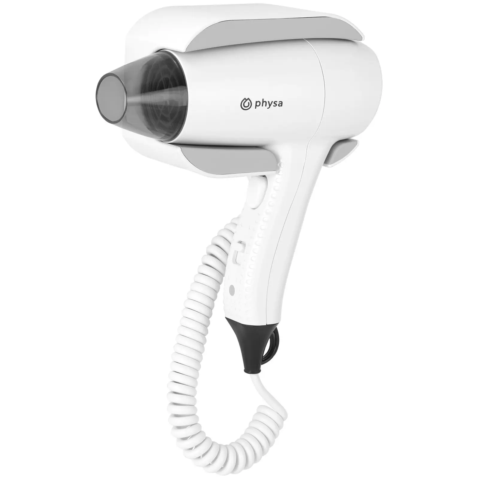 Physan korkealaatuisen hotellitarvikevalikoiman seinään kiinnitettävä hiustenkuivaaja on suunniteltu kaupalliseen käyttöön hotelleihin, uimahalleihin tai kylpylöihin. Hiustenkuivaajaa voidaan käyttää kaikkialla yleisissä tiloissa, joissa hiustenkuivauksen on sujuttava helposti ja nopeasti. Tehokas moottori toimii 1 200 W teholla ja lämmittää ulos virtaavaa ilmaa kahdella valittavalla tasolla jopa 100 °C lämpötilaan. Miellyttävä ilmavirtaus saavuttaa 10 m/s olevan puhallusnopeuden. Tämä lämpötila ja nopeus ovat ihanteellisia hiustenkuivaukseen niitä vaurioimatta. 0,9 m pitkä spiraalijohto tarjoaa riittävän liikkumavapauden, kun taas ritilä suojaa laitetta ja hiuksia vaurioilta. Hiustenkuivaajan voi kiinnittää mihin tahansa seinään yksinkertaisella toimenpiteellä, jolloin sillä on aina kiinteä paikka ja sitä voi käyttää myös pienemmissä tiloissa. Hiustenkuivaimen pidike ja kotelo oli valmistettu erityisestä ABS-muovista, jotta fööni kestäisi hyvin ulkoisia vaikutteita.