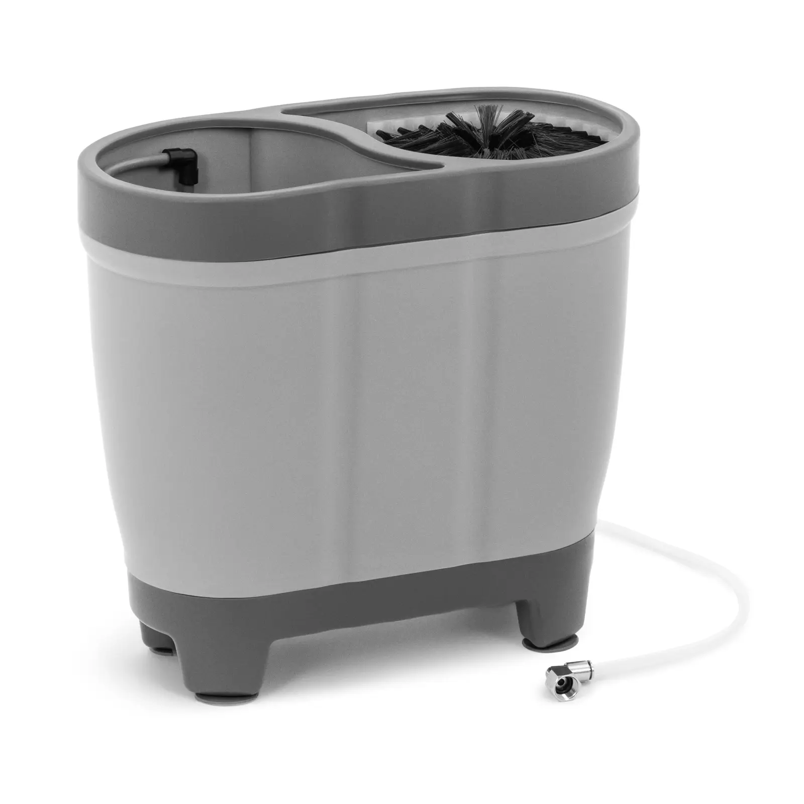 Royal Cateringin lasienpesukoneen avulla voit puhdistaa lasit, kupit ja muut astiat hetkessä. Laite säästää aikaa ja rahaa astianpesun yhteydessä. Se on erittäin monipuolinen ja siksi korvaamaton apuväline pubeissa, baareissa ja ravintoloissa. Et tarvitse lainkaan sähköä lasinpesukoneen käyttämiseen. Laite toimii vedenpaineen avulla, ja sopii käytettäväksi sekä kylmällä että kuumalla vedellä. Vie lasi muutaman kerran pesurin harjasten yli. Älykkäästi sijoitettujen harjojen ansiosta voit puhdistaa astiat sisä- ja ulkopuolelta samanaikaisesti, ja päästä käsiksi myös vaikeasti saavutettaviin paikkoihin. Muutama sekunti riittää poistamaan lian laseista ja kupeista, ja valmistelemaan ne seuraavia asiakkaitasi varten. Laite soveltuu halkaisijaltaan 5-16 cm suurille, sekä kahvallisille että kahvattomille astioille. Huuhtele puhdistettu astia jälkihuuhtelualtaassa raikkaalla vedellä saippuajäämien poistamiseksi. Lasinpesukoneessa on 90 cm pitkä letku, jonka avulla voit kytkeä laitteen vesiliitäntään nopeasti ja helposti. Pesuri on valmistettu korkealaatuisesta muovista, joten se on helppo puhdistaa ja kevyt kuljettaa haluttuun paikkaan – ihanteellinen ratkaisu liikkuvaan käyttöön ravintola-alalla! Laitteen kompaktit mitat sopivat hyvin mihin tahansa työtilaan. Asenna lasisuihku lähelle tiskipöytää tai käytä sitä työtason päällä. Näin henkilökuntasi ei tarvitse kävellä edestakaisin sen puhdistamiseksi.