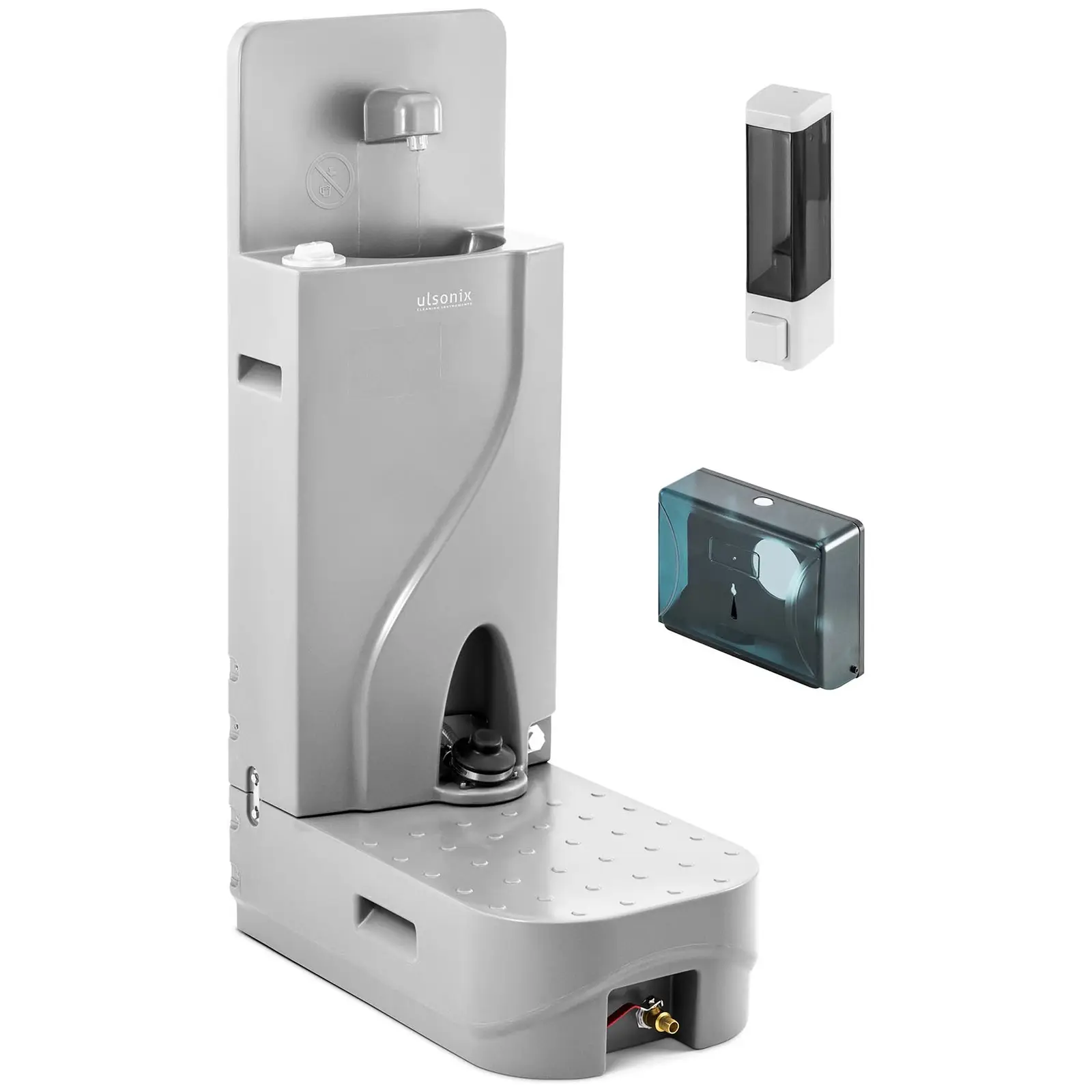 Kaikilla markkinoilla ei ole vesiliitäntää, mutta haluat silti pestä kädet tai puhdistaa jonkun välineen työn aikana. Siinä tapauksessa tee itsestäsi suurelta osin itsenäinen veden suhteen ja käytä ulsonixin liikuteltavaa pesuallasta! Olitpa retkellä, markkinoilla tai pienessä katukojussa, pesuallas mahdollistaa veden saannin lyhytaikaista pesua varten ilman ulkoista vesiliitäntää. Tai tarjoa asiakkaillesi mahdollisuus käsienpesuun välillä! Voit asentaa liikuteltavan käsipesualtaan minne haluat. Pesuvesi täytetään suureen 65 l astiaan ja on näin käytössäsi jopa 1 000 pesukertaa varten. Jätevettä varten 77 l litran säiliö on integroitu altaaseen, joten voit käyttää tätä järjestelmää pesemiseen ilman ulkoista tulo- tai poistovirtausten liitäntää. Vesisäiliöiden liitännät ovat kuitenkin mukana, jos haluat lisätä vettä tai tyhjentää jätevedet. Hanaa käytetään jalkapolkimella. Tämä ei ole pelkästään kätevä, vaan myös erittäin hygieeninen. Kontaktiton toiminta on puhtain ratkaisu, etenkin useiden ihmisten käyttäessä pesuallasta. Integroitu, tilavuudeltaan 200 ml saippua-annostelija ja paperiteline, parantavat hygieniaa entisestään. Allas on tilava, jotta voit pestä itsesi vesisuihkun alla rajoituksetta. Viemärisuodatin on valmistettu ruostumattomasta teräksestä ja korostaa liikkuvan käsienpesualtaan hygieenisuutta. Pesualtaan kotelo on valmistettu kestävästä muovista (HDPE) ja sisältää lisäksi seisokkeen, jolla voit turvallisesti seistä pestessäsi käsiä. Kompakti rakenne voidaan koota ja ottaa käyttöön nopeasti. Integroidut kahvat helpottavat pesualtaan kuljettamista ja tekevät siitä vakuuttavan, liikuteltavan pesupisteen.