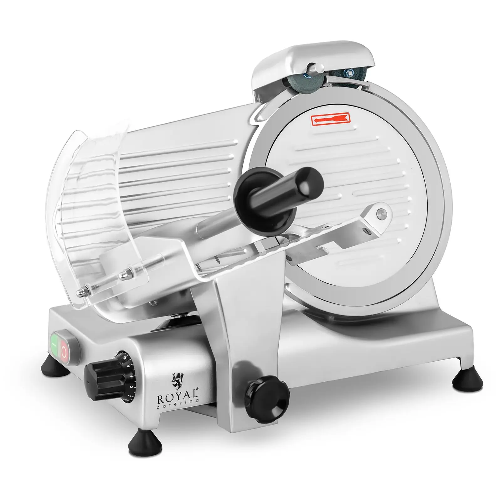 Makkaraa, juustoa tai luutonta lihaa – ei ole mitään, mitä Royal Cateringin ravintolalaitteista löytyvä laadukas siivutuskone RCMS-250MM ei leikkaisi millimetrintarkoiksi siivuiksi. Anodisoitu ja kiillotettu alumiini tekee viipalointikoneesta korroosionkestävän, helposti puhdistettavan ja kansainvälisten hygieniastandardien mukaisen. Tämä laite on ihanteellinen elintarvikemyymälöihin, lihatiskeille, ravintoloihin, hotelleihin tai laatua arvostaville käyttäjille kotikeittiöön. Suorituskykyinen 320 W:n sähkömoottori pyörittää siivutuskoneen terää nopeudella 426 r/min, mikä takaa erittäin nopeat ja tarkat leikkaustulokset. Terävä, halkaisijaltaan 250 mm:n leikkuuterä liukuu jopa kovan juuston läpi vaivattomasti. Siivutus on erityisen vaivatonta RCAM 250PRO -teflonterällä, jonka voit ostaa verkkokaupastamme. Voit säätää siivun paksuuden säätönupista portaattomasti välille 0 – 8 mm. Täten voit tarjota asiakkaillesi ja vieraillesi kaikkea, mitä he haluavat, ohuen ohuista siivuista reilun paksuisiin viipaleisiin. Uritettu pinta ja sormiasi suojaava työnnin estävät leikattavan tuotteen liukumisen paikaltaan. Läpinäkyvän suojuksen ansiosta näet aina, minkä verran siivuja olet jo leikannut. Kone voi työstää enintään 155 mm leveitä ja 150 mm korkeita makkaran- ja juustonpaloja. Päivittäisen työskentelysi helpottamiseksi viipalointikoneen luistissa on kitkattomat ja hiljaiset kuula- ja liukulaakerit. Näin luisti liukuu kevyesti pyörivän terän ohi ilman, että sinun tarvitsee käyttää paljon voimaa. Leikkurin erityisen kallistuskulman ansiosta leikattavaan kappaleeseen kohdistuu optimaalinen paine. Pyöreä leikkuuterä on erikoisvalmisteista ruostumatonta terästä. Se erottuu edukseen terävyydellään ja pitkäikäisyydellään. Käyttöturvallisuuden lisäämiseksi ja onnettomuusriskin pienentämiseksi siivutuskone on varustettu teräsuojalla. Koska kaikki terät tylsyvät ajan mittaan, siivutuskoneessa on tekninen huippuominaisuus: sen yläosassa on puoliautomaattinen teroitin, jolla saat leikkuuterän nopeasti taas teräväksi. Suunnittelussa on panostettu turvallisuuteen: vankka rakenne ja neljä liukumatonta kumitassua pitävät koneen varmasti paikallaan siivuttamisen aikana. Lisäksi tassut ehkäisevät työtason naarmuuntumisen. Kookas virtakytkin on sijoitettu laitteen sivuun, jotta se on myös hätätapauksessa nopeasti ja mukavasti käden ulottuvilla.