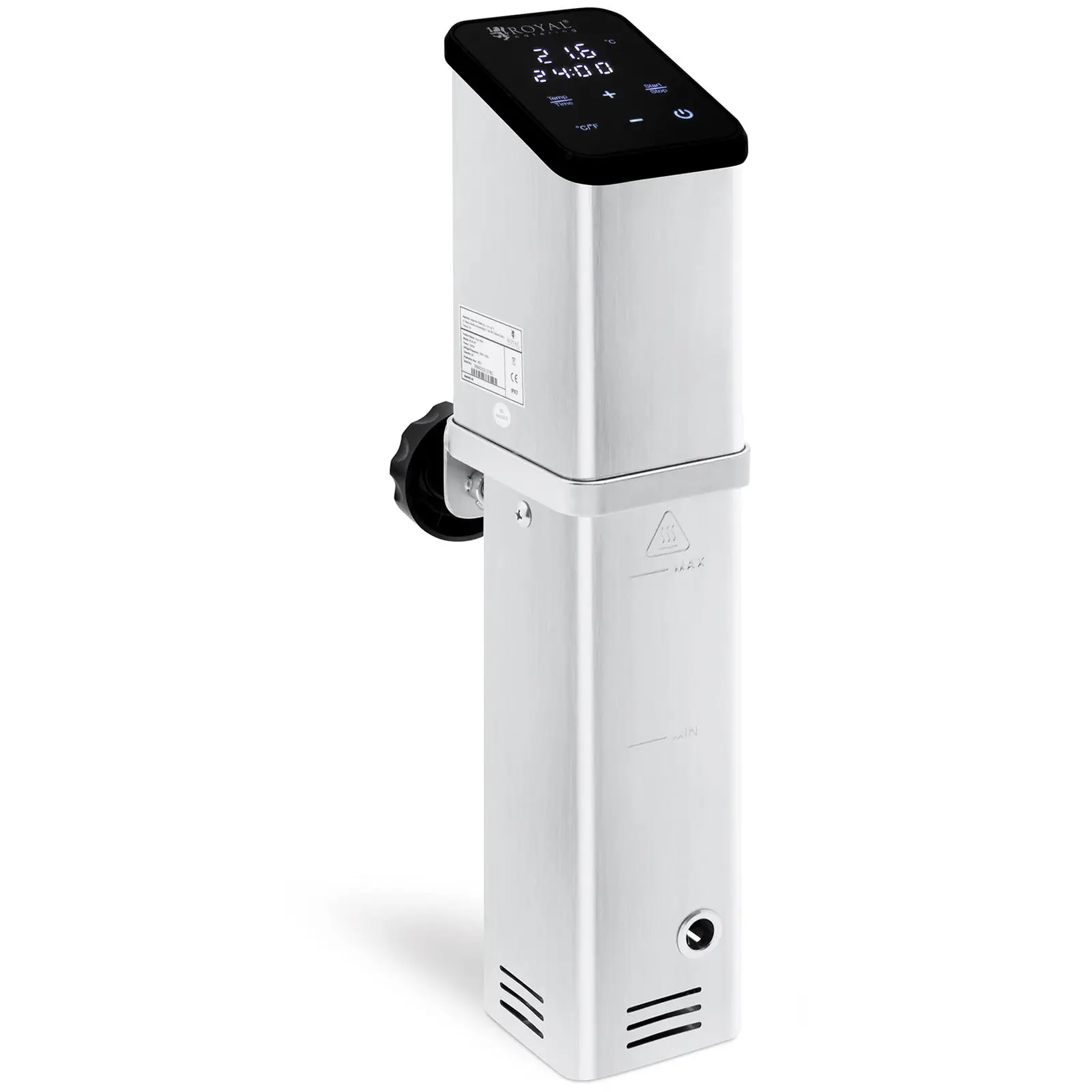 Sirkulaattorin RCVG-45 avulla voit kypsentää ruokaa hellävaraisesti minuutin tarkkuudella tasaisessa lämpötilassa. Laite soveltuu kompaktilla muodollaan ja helpolla kiinnityksellään kattiloihin ja ruoka-astioihin kaupalliseen käyttöön ravintoloissa, bistroissa tai hotellikeittiöissä, mutta myös yksityiskäyttöön kotona. Liitä se yksinkertaisesti kattilaan tai astiaan, aseta aika ja lämpötila ja sirkulaattori hoitaa lopun. Tyhjiökypsennys mahdollistaa erilaisten ruokien valmistamisen hellävaraisesti ja tasaisesti. Olipa kyseessä sitten vihannekset, liha, äyriäiset tai jopa keitot – ruoka säilyttää tuoreen aromin ja vahvan maun kypsennyksen aikana tyhjiöpussien sulkemisen ansiosta. Täytä ensin kattila tai syvä astia 20 tai enintään 30 litralla vettä. Ruostumattomasta teräksestä valmistetun kotelon leimatun tason osoittimen ansiosta voit tehdä täytön silmämääräisesti. Kiinnitä nyt sirkulaattori säiliön reunaan. Helposti tarttuva säätöruuvi varmistaa varman istuvuuden. Määritä sitten haluttu kypsennyslämpötila ja -aika. Molemmat voidaan asettaa intuitiivisen kosketuslevyn ja LCD-näytön avulla tarkasti ja lämpötila 0,5 °C tarkkuudella välille 5 – 90 °C. Energiatehokas sirkulaattori lämmittää vesihauteen automaattisesti 1 500 watin lämmitysvastuksen ansiosta. Se liikuttaa vettä kauttaaltaan tasaisen lämpötilan varmistamiseksi. Laita nyt ainekset astiaan. Sisäänrakennettu digitaalinen termostaatti takaa tasaisen lämpötilan koko kypsennysprosessin ajan ja sen voi asettaa 0 minuutista 99 tuntiin. Kun asetettu aika on kulunut, sukelluskiertovesipumppu kytkeytyy automaattisesti pois päältä. Näin voit hallita kypsennysprosessia. Koti- ja ravintolatarpeisiin tarkoitettu keittiölaite on valmistettu hygieenisestä ja korroosionkestävästä materiaalista, ruostumaton teräs, ja sitä voidaan käyttää ravintoloissa, välipalabaareissa, baareissa tai kotikeittiöissä.