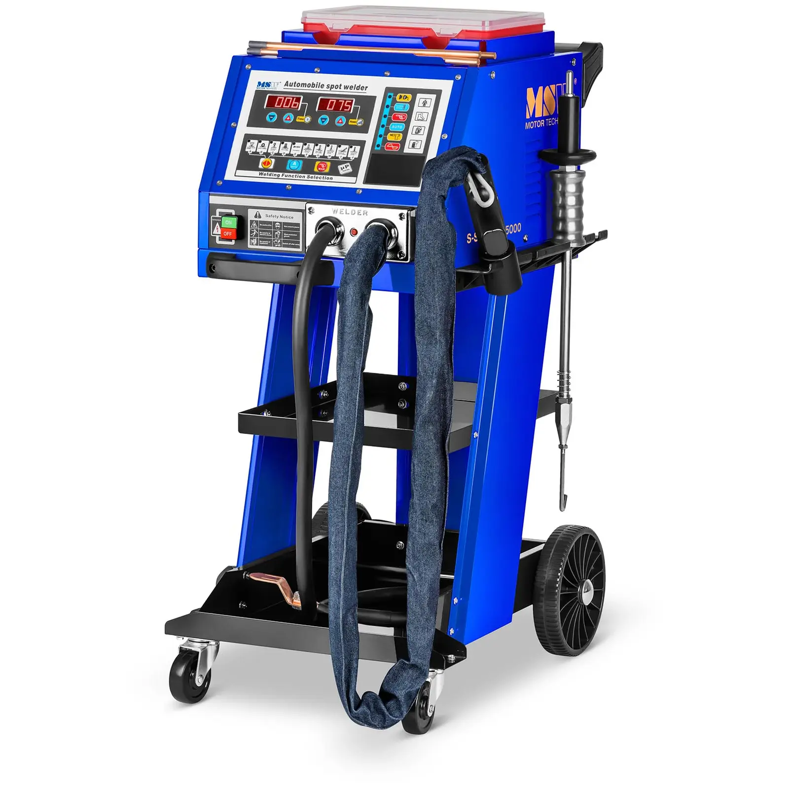 Kun autossasi on ikävä lommo, on MSW:n S-SPOTTER 5000 spotteri 400 V jännitteellään nopea apu. Tällä spotterilla, sekä siihen kuuluvilla monipuolisilla lisävarusteilla jopa monimutkaisten peltivaurioiden korjaaminen onnistuu. Tämän vuoksi laite on autokorjaamojen välttämätön apulainen, jolla auton lommot ja kolhut suoristuvat kätevästi. Spotterin toimintaperiaate perustuu pistehitsaukseen. Levyt ja aaltolanka hitsautuvat pistetarkasti pellin pullistumakohtaan, joka suoristetaan tämän jälkeen oikaisuvasaralla. S-Spotter 5000 spotterissa on 10 eri toimintoa erilaisiin vaatimuksiin hitsaustöissä. Laitteeseen kuuluu erilaisia suuttimia, joilla hitsaat kolmiokärjet tai pyöreät aluslevyt, tapit, ruuvit tai aaltolangan ongelmakohtaan, jonka jälkeen voit oikaista lommon koukulla tai muulla oikaisutyökalulla. Muilla toiminnoilla laajennat peltiä elektrodin avulla tai hitsaat reunoja. Lisäksi tämä pistehitsauskone soveltuu yksipuoliseen painehitsaukseen tai leikkaamiseen käytettäessä hiililankaa. Toimintojen tarkat parametrit ja niiden arvot voidaan asettaa nopeasti digitaalisesta kosketusohjauspaneelista, josta arvojen saavutusta on miellyttävää seurata LED-valaistuksen ansiosta. Automaattitilassa hitsausvirta on jopa 5000 A esiajastetussa ajassa. Manuaalitilassa hitsausvirta on säädettävissä ajasta riippumatta, jolloin hitsausaika voidaan valita 0,01 ja 999 sekunnin väliltä. Spotteri on varustettu hitsauspistoolilla, jota monipuolistaa hiilielektrodille, aluslevyille tai tapeille sekä oikaisuvasaralle sopivat suuttimet, jolloin lommojen suoristus onnistuu. 1,75 metrin letkupaketti ja 1,6 metrin maakaapeli tarjoavat erityisen paljon liikkumisvaraa useimmille oikaisutöille. Lisäliikkuvuutta tuo 4 pyörällä varustettu työkärry, jonka pyöristä 2 on vapaasti liikkuvaa. Spotteri ja sen lisävarusteet voidaan työn aikana laskea kärryn kahdelle hyllytasolle. Monipuoliset lisävarusteet säilyvät kätevästi laitteen mukana toimitettavassa salkussa.