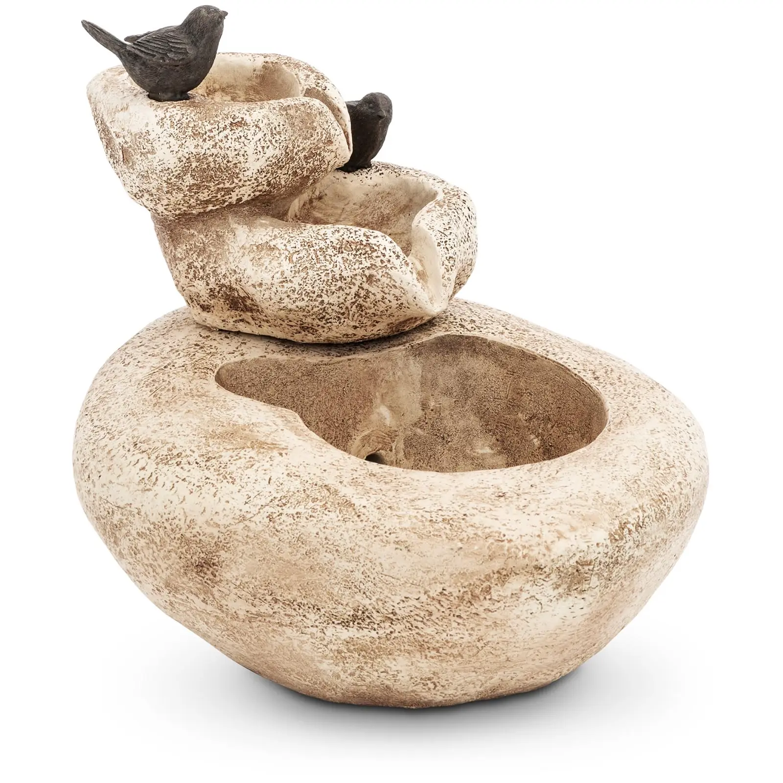 Puuttuuko puutarhastasi viimeinen silaus? Tyylikäs suihkulähde kukkapenkkiin tai terassille täydentää minkä tahansa pihan yleisilmeen! Suihkulähde toimii verkkovirralla. Lempeä veden liplatus luo miellyttävän tunnelman, ja näyttää samalla tyylikkäältä. Kolmen altaan vesiaihe näyttävällä kivirakenteella on vaikuttava katseenvangitsija ja tuo puutarhasi ilmeeseen täydellisen korostuksen. Suihkulähteen kohokohta ovat sen kaksi viehättävää lintuhahmoa sekä kaunis tekokasvi. Vesielementti saa myös aikaan miellyttävän mikroilmaston, jolla on positiivinen vaikutus sitä ympäröiviin kasveihin. Lisäksi juokseva vesi houkuttelee pikkulintuja luokseen. Suihkulähde toimii verkkovirralla, joten sen toiminnasta ei tarvitse kantaa huolta pilviselläkään säällä. Tehokas pumppu tuottaa virtausnopeuden 120 l/h ja nostaa vettä jopa 40 cm:n korkeuteen. Laitteessa on 150 cm pitkä johto, jonka avulla voit sijoittaa sen joustavasti puutarhaan tai sisätiloihin. LED-valaistuksen ansiosta se on erittäin näyttävä myös pimeällä. Puutarha-suihkulähde on valmistettu synteettisestä hartsista. Materiaali ei ole ainoastaan vedenpitävää, vaan myös erityisen pitkäikäistä. Tästä syystä suihkulähde onkin erityisen säänkestävä. Lähteen pumpussa (JN200) on IPX8-suojaus, ja sen virtalähde on suojattu roiskevedeltä kaikista suunnista IP44-suojauksen ansiosta. Näin se toimii luotettavasti myös ulkokäytössä.