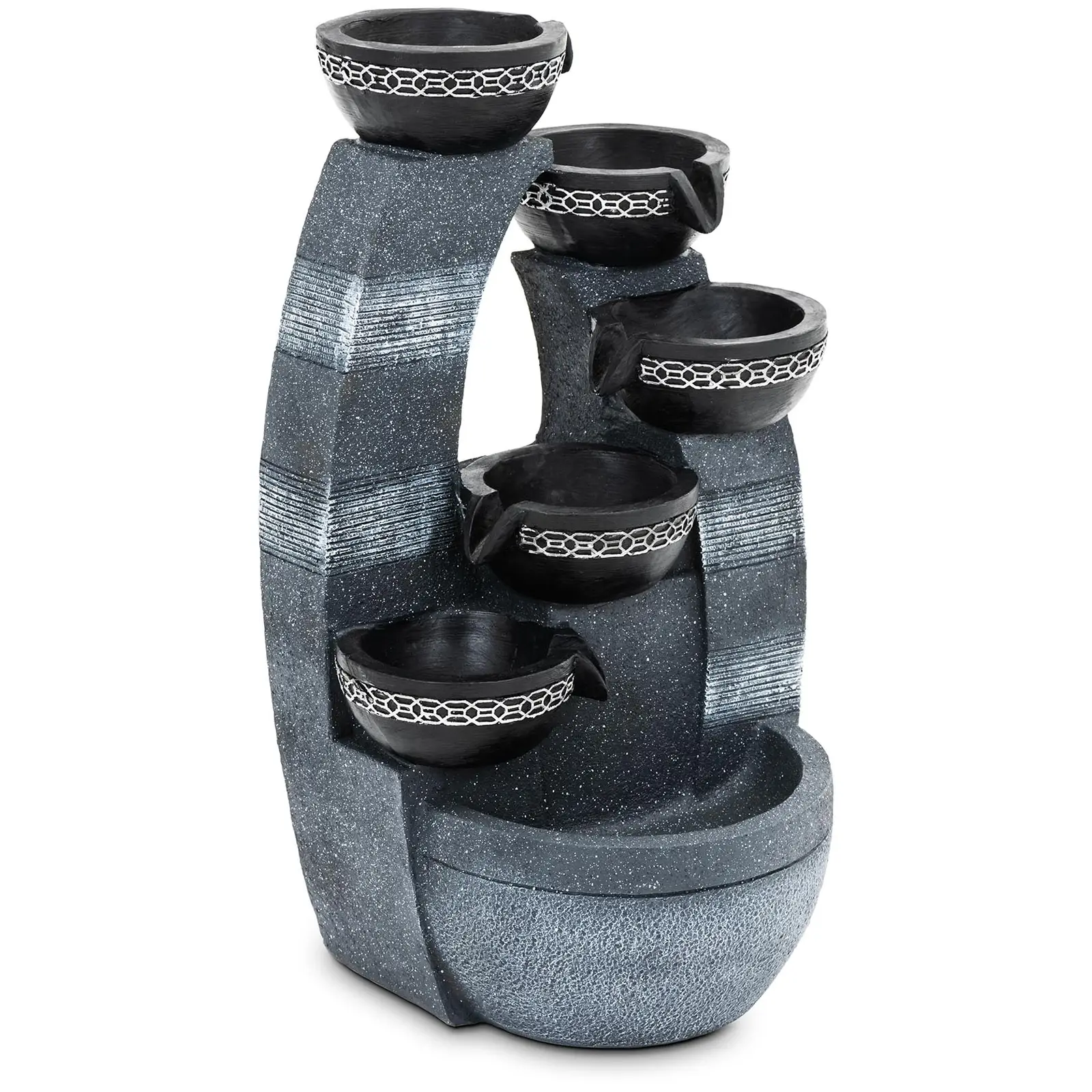 Puuttuuko puutarhastasi viimeinen silaus? Tyylikäs suihkulähde kukkapenkkiin tai terassille täydentää minkä tahansa pihan yleisilmeen! Suihkulähde toimii verkkovirralla. Lempeä veden liplatus luo miellyttävän tunnelman, ja näyttää samalla tyylikkäältä. Viisi mustaa kulhoa sisältävä vesiaihe on vaikuttava katseenvangitsija ja tuo puutarhasi ilmeeseen täydellisen korostuksen. Litteän takaosan ansiosta voit sijoittaa sen ongelmitta aidan tai seinän viereen. Vesielementti saa myös aikaan miellyttävän mikroilmaston, jolla on positiivinen vaikutus sitä ympäröiviin kasveihin. Lisäksi juokseva vesi houkuttelee pikkulintuja luokseen. Suihkulähde toimii verkkovirralla, joten sen toiminnasta ei tarvitse kantaa huolta pilviselläkään säällä. Tehokas pumppu tuottaa virtausnopeuden 180 l/h ja nostaa vettä jopa 50 cm:n korkeuteen. Laitteessa on 150 cm pitkä johto, jonka avulla voit sijoittaa sen joustavasti puutarhaan tai sisätiloihin. Neljän LED-lampun ansiosta se on erittäin näyttävä myös pimeällä. Puutarha-suihkulähde on valmistettu synteettisestä hartsista. Materiaali ei ole ainoastaan vedenpitävää, vaan myös erityisen pitkäikäistä. Tästä syystä suihkulähde onkin erityisen säänkestävä. Lähteen pumpussa (JN300) on IPX8-suojaus, ja sen virtalähde on suojattu roiskevedeltä kaikista suunnista IP44-suojauksen ansiosta. Näin se toimii luotettavasti myös ulkokäytössä.