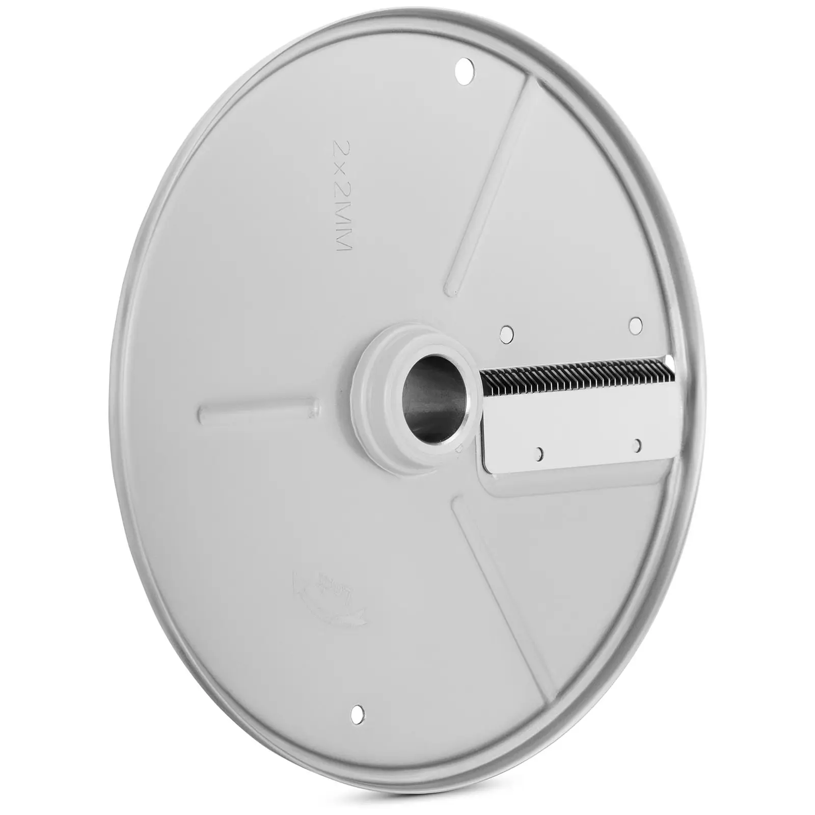 Onko sinulla vihannesleikkuri RCGS 400 tai RCGS 600 halkaisijaltaan 174 mm:n viipaleille? Käytä sitten Royal Cateringin mukautettua suikalointilevyä. Se leikkaa hedelmät ja vihannekset nopeasti ja vaivattomasti suikaleiksi, joiden paksuus on 2 x 2 mm. Käytä kestävää leikkuuterää ravintolassasi, ruokalassa tai omassa keittiössäsi! Laadukkaalla käsitellyllä leikkuulaikalla voit pilkkoa hedelmät ja vihannekset luotettavasti halutun paksuisiksi suikaleiksi. Terän materiaali on elintarviketurvallista ruostumatonta terästä, joka tekee vaikutuksen korkealla korroosionkestävyydellä. Levy tuskin menetä terävyydestään jatkuvassakaan käytössä ja soveltuu erinomaisesti suurten määrien käsittelyyn. Puhdistat sileät ruostumattomat teräspinnat helposti muutamalla liikkeellä. Raidallinen levy voidaan asentaa tai poistaa laitteesta yhtä helposti. Päivitä RCGS 400- tai RCGS 600 (10012929, 10012936 – 38) -vihannesleikkurisi Royal Catering -valikoiman korkealaatuisella raidallisella levyllä. Expondon verkkokaupasta löydät lisäteriä, kuten yhteensopivia kiekkoja ja ritilälevyjä.