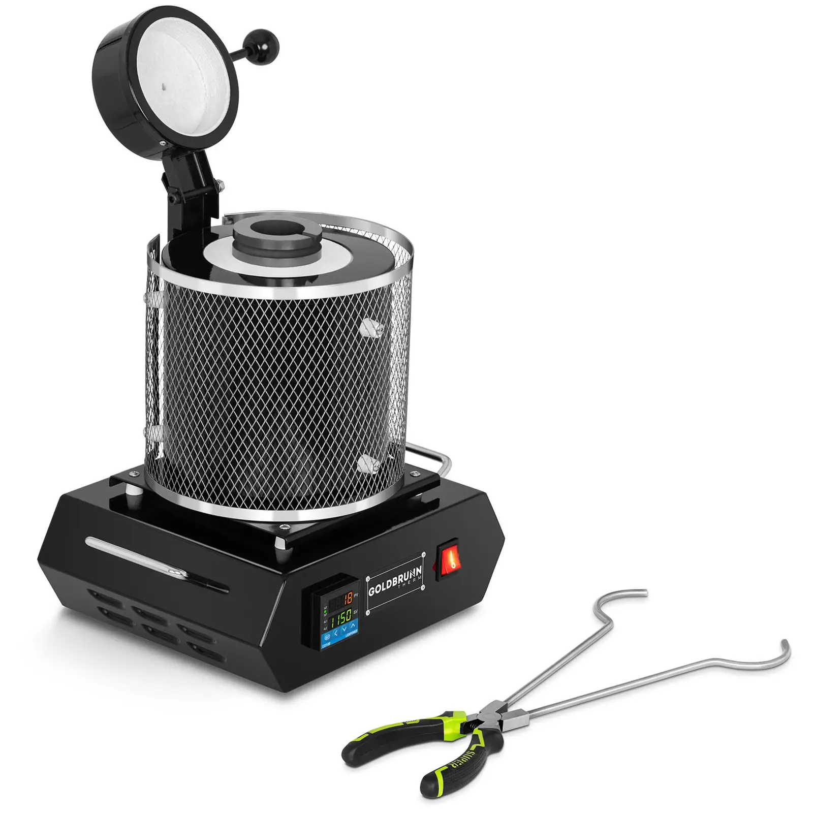 Goldbrunn 2000 -sulatusuuni on suunniteltu jalometallien ammattimaiseen käsittelyyn. Laite vakuuttaa kompaktilla ja kestävällä rakenteellaan, jossa on otettu huomioon jokapäiväinen käyttö. Koska Goldbrunnin tuotteissa käytetään vain korkealaatuisia materiaaleja, sulatusuuni täyttää teollisen metallinjalostuksen kaikki korkeimmat vaatimukset. Goldbrunn 2000 -laitteen maksimilämpötila on 1 150 °C ja teho 1 900 W, joten se soveltuu erinomaisesti jalometallien, kuten kuparin, hopean tai kullan sulattamiseen. Tehokkaan eristyksen ansiosta lämmityselementti saavuttaa nopeasti täyden tehon ja jakaa sen tasaisesti sulatusastiaan. Spiraalilämmityselementin käyttöikä on jopa kuusi kuukautta. Huomautus: Lämmityselementti on kulutusosa, eikä se kuulu laitteen takuun piiriin. Sopivia lämmityselementtejä voi ostaa verkkokaupastamme. Itse sulatusuuni on valmistettu grafiitista. Materiaalin erityiskäsittely takaa vakauden myös sulatusuunin sylinterimäisessä muodossa. Upokkaan yläreunassa oleva tyhjennysaukko takaa sulan helpon kaatamisen ja dekantoimisen. Upokkaan kapasiteetti on 2 kg kultaa. Nykyaikainen PID-moduuli takaa sulatusuunin intuitiivisen ja yksinkertaisen käytön. Asetetun lämpötilan digitaalinen säätö toimii asteen tarkkuudella. Lisäksi todellista lämpötilaa seurataan 2 s:n syklillä. Näin varmistetaan, että se pysyy vakiona ja on helppo tarkistaa LCD-näytöltä. Lämmönkestävästä materiaalista valmistetun kestävän eristeen lisäksi lämpöä eristävä suojasäleikkö suojaa myös tahattomalta kosketukselta lämmityskammioon. Laitteen sivuilla olevat turvalliset kahvat helpottavat sulatusuunin käsittelyä. Toimitukseen sisältyvät erityisesti tähän malliin suunnitellut upokaspihdit. Tämä käytännöllinen apuväline, joka sopii ihanteellisesti upokkaan pään ympärillä olevaan uraan, helpottaa huomattavasti kuumennetun upokkaan käsittelyä.