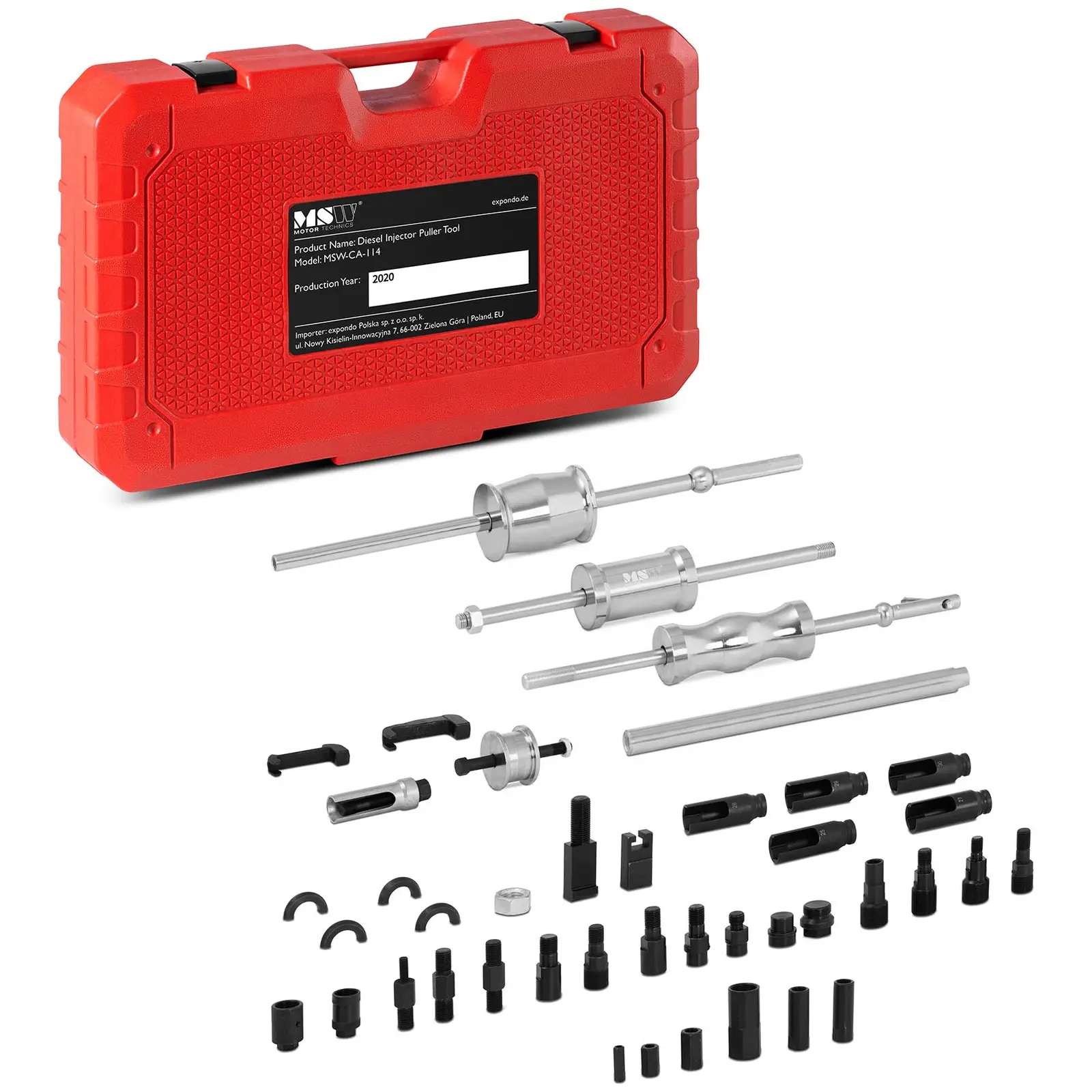 MSW: n ammattivalikoimasta suuttimen ulosvedinsarja MSW-CA-114 on erityinen työkalusarja diesel-injektorien turvalliseen poistamiseen ilman sylinterinkannen poistamista. Lukuisten sovittimien ansiosta tämä sarja sopii useimmille moottoriajoneuvojen diesel-suuttimille ja on erityisen hyödyllinen kaupallisissa korjaamoissa. Mutta myös itseoppineet autonkorjaajat pystyvät irrottamaan dieselsuuttimet tämän 40-osaisen sarjan työkaluilla aiheuttamatta vaurioita. Tähän ruiskutussuuttimen ulosvedinsarjaan kuuluu kolme erityyppisille venttiileille sopivaa liukuvasaraa. Liukuvasarat ovat eripituisia ja -painoisia ja soveltuvat erilaisille moottoreille ja erilaisia voimia vaativiin töihin. Koska tässä työkalusarjassa on lukuisia osia ja adaptereita, se soveltuu useimpiin dieselmoottoreihin. Tämän ammattikäyttöön tarkoitetun dieselsuuttimien ulosvedinsarjan ansiosta olet täydellisesti varustettu korjaamaan erityyppisiä ja -kokoisia suuttimia. Kaikki työkalusarjan osat on valmistettu kestävästä hiiliteräksestä, mikä takaa luotettavuuden silloinkin, kun työssä käytetään paljon voimaa. Voit irrottaa kiinni pikeentyneetkin suuttimet ammattimaisesti. Kolmen erikokoisen liukuvasaran materiaali on teräs. Ne vakuuttavat suurella korroosionkestävyydellään. Ammattitason ulosvedinsarjalla dieselsuuttimien irrotus on taatusti turvallista. Jos erikoistyökaluja ei käytetä, suutin ja moottori voivat helposti vaurioitua ja lisäksi työntekijä altistuu huomattavalle loukkaantumisvaaralle. Työskentele turvallisesti: käytä MSW:n dieselsuuttimen ulosvedinsarjaa. Sarja toimitetaan käytännöllisessä muovisalkussa, jossa on oma syvennyksensä jokaiselle yksittäiselle osalle Näin kaikki pysyy hyvässä järjestyksessä käyttökertojen välillä. Salkkua voidaan helposti kuljettaa kahvasta.