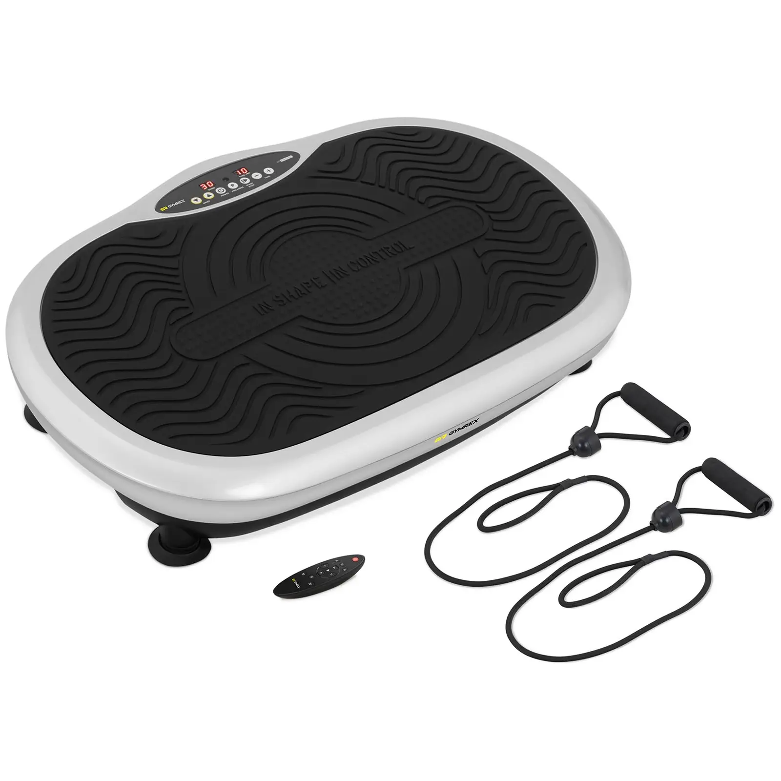 Haluatko vahvistaa syvälihaksiasi, taistella ärsyttäviä kiloja vastaan tai rentouttaa lihaksiasi: Gymrexin, urheilu ja terveys-asiantuntioiden värinäalusta GR- MG47 vaikuttaa kehoon ja kuntoon jo 10 minuutin käytöllä! Tärinä tukee verenkiertoa ja auttaa jopa selluliittia vastaan. Lihasten ja aivojen läheisen yhteyden takia hormonaalisia välittäjäaineita vapautuu liikunnan aikana, joilla on positiivinen vaikutus koko verenkiertoon. Tärinäalustan voimakas 200 watin moottori toimii 10 mm amplitudilla ja saa aikaan jopa 15 värähtelyä sekunnissa. Tärinäalusta kuntoiluun toimii moniulotteisella tärinällä. Tämänkaltaisen värähtelyn etuna on se, että ne sopeutuvat liikkeisiin, mikä takaa kokonaisvaltaisen kuntoiluvaikutuksen. Kaikki harjoitukset voidaan suorittaa optimaalisesti 54 x 30,5 cm suurella harjoituspinnalla, jossa on luistamaton kumimatto. Intuitiivisesta ohjauspaneelista tai kätevällä kauko-ohjaimella voit valita 30 nopeuden ja kolmen harjoitusohjelman välillä ja asettaa ajastimen 1-10 minuutiksi. Voit pitää aina kaikkia arvoja silmällä LED-näytöllä. Kahden elastisen kuntohihnan avulla voit myös tehdä tehokkaan treenin ylävartalollesi samalla kun vibroshaper-simulaattori ravistaa jalkojasi, vatsaasi ja pakarojasi yhtä aikaa. Tärinäalusta vie vain 61,5 x 40 cm tilan. Neljä kumijalkaa absorboi tärinää, joten voit treenata rauhassa häiritsemättä naapureitasi. Ne varmistavat myös alustan paikallaan pysymisen ja estävät naarmujen syntymisen lattiaan.