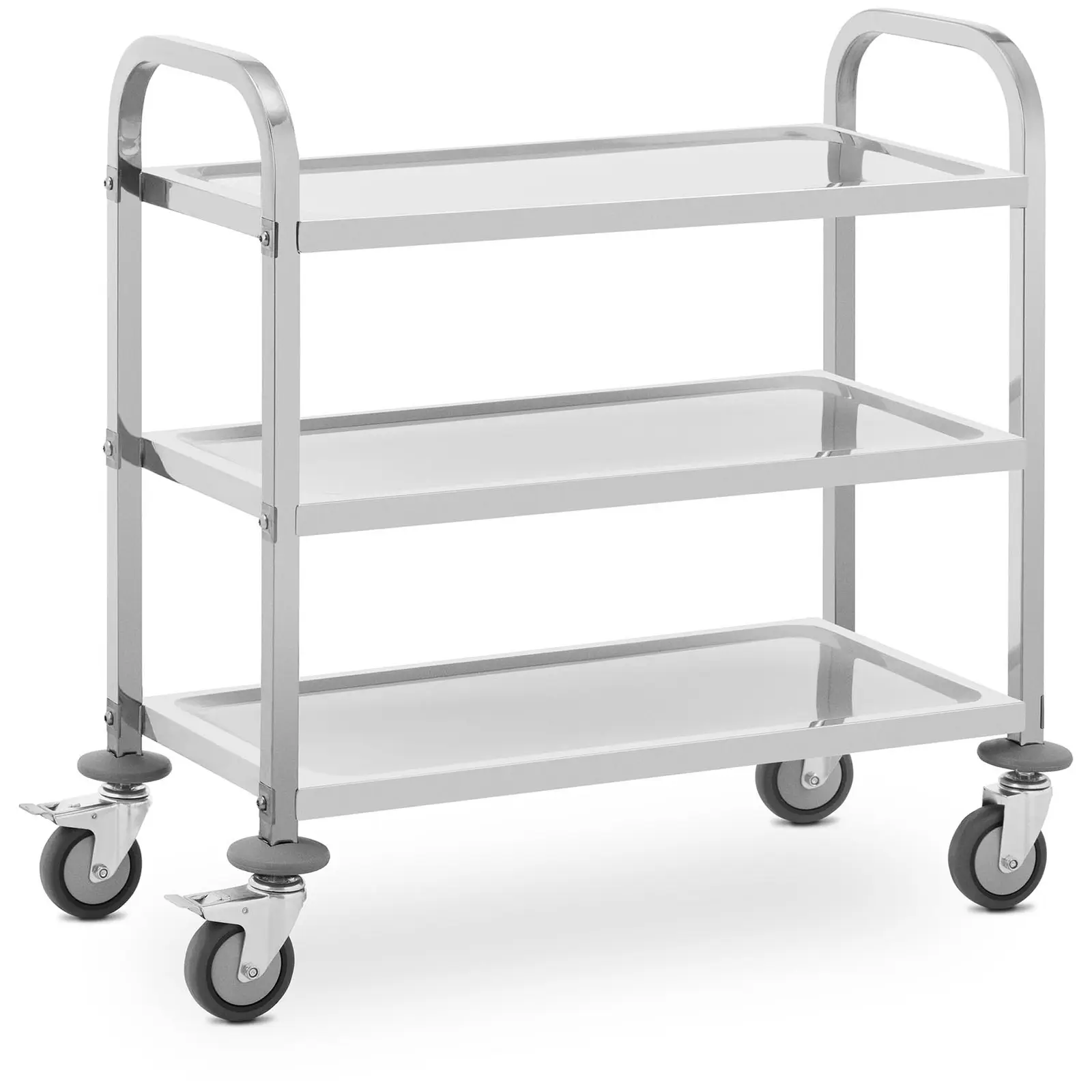 Korkealaatuisesta ruostumattomasta teräksestä valmistettu tarjoiluvaunu kantaa jopa 81 kg. Neljällä kääntyvällä ja tasaisesti pyörivällä pyörällä – joista kahdessa on jarrut – siirrät ruoat, juomat ja astiat nopeasti ja huomaamattomasti haluttuun paikkaan ravintoloissa, suurkeittiöissä ja ruokaloissa. Kolme helposti saavutettavaa tasoa ovat 73 x 38 x 3 cm:n kokoiset ja tarjoavat tarpeeksi tilaa suurillekin määrille ruokaa, varastotavaroita tai posliinia. Tarjoilukärry on valmistettu lähes kokonaan korkealaatuisesta ruostumattomasta teräksestä. Renkaiden materiaaliksi Royal Catering on valinnut termoplastisen kumin (TPR), minkä ansiosta vaunu on kevyt työntää ja hellävarainen lattiapinnoille. Keittiövaunu kestää hyvin ulkoisia vaikutuksia ja vakuuttaa pitkällä käyttöiällään. Vaunun sileät pinnat on myös erittäin helppo puhdistaa. Tällä keittiövaunulla Royal Cateringin ravintolalaitteista optimoit työprosessisi varastossa, keittiössä ja tarjoilutehtävissä!