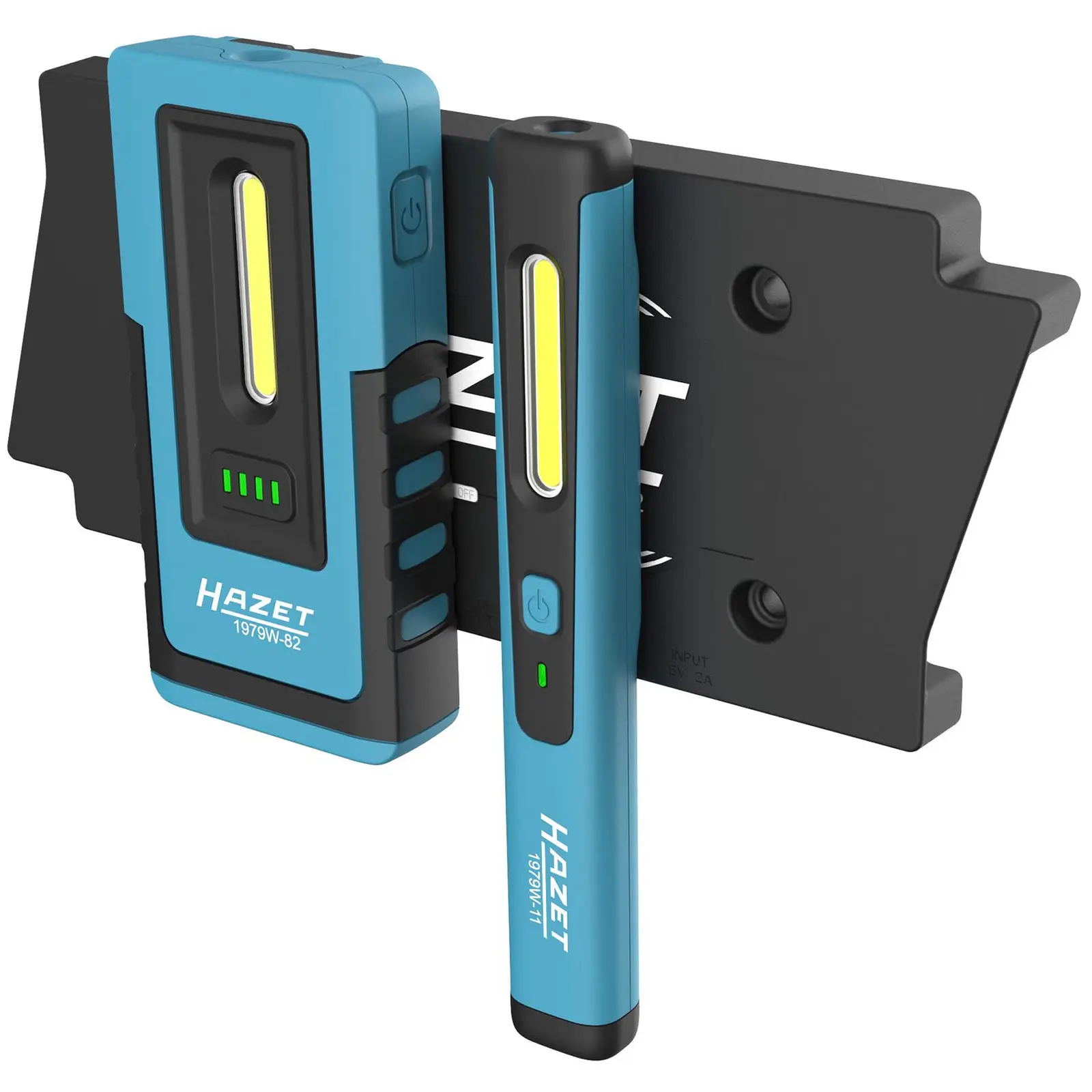 Kirkas, himmennettävä, langaton – tästä eivät lamput parane. Hazetin 3-osaisella tarkastuslamppusarjalla saat autoja korjatessasi valoa juuri sinne, missä sitä tarvitset – napin painalluksella. Kompaktit tarkastuvalaisimet voi paitsi ladata, myös säilyttää magneettisella latausalustalla. Lampuissa on laajalle valaiseva yleisvalo ja kärjissään taskulamppumainen kohdevalo. Tämän korjaamovalaisinsarjan osat ovat kapea sauvalamppu, kätevä käsilamppu ja latausalusta. Kummankin lampun kärjessä on pistemäisesti valaiseva kohdevalo ja pitkällä kyljellä laaja-alainen päävalo. Voit kytkeä lamput päälle ja pois päältä sekä vaihtaa kärjen ja sivun valon välillä kätevästi painamalla vain yhtä painiketta. Näppärä erikoisominaisuus: kyljessä olevaa päävaloa voi himmentää portaattomasti. Kaikissa sarjan osissa on magneetit, joiden ansiosta voit kiinnittää ne moniin paikoihin korjaamossasi, esim. nostimiin. Näin nämä käytännölliset apuvälineet ovat aina käden ulottuvilla. Latausalustan voi myös kiinnittää seinään ruuveilla. Voit ladata lamput näppärästi vain sijoittamalla ne latausalustalle. Ne alkavat heti latautua. Näet käytännöllisistä merkkivaloista yhdellä silmäyksellä, ovatko lamput käyttövalmiina. Kummassakin tarkastusvalaisimessa on kumipäällyste, josta saat hyvän otteen. Lisäksi niiden kotelointiluokka IP65 suojaa niitä pölyltä ja vesisuihkulta – mikä onkin tarpeen autokorjaamotöissä.