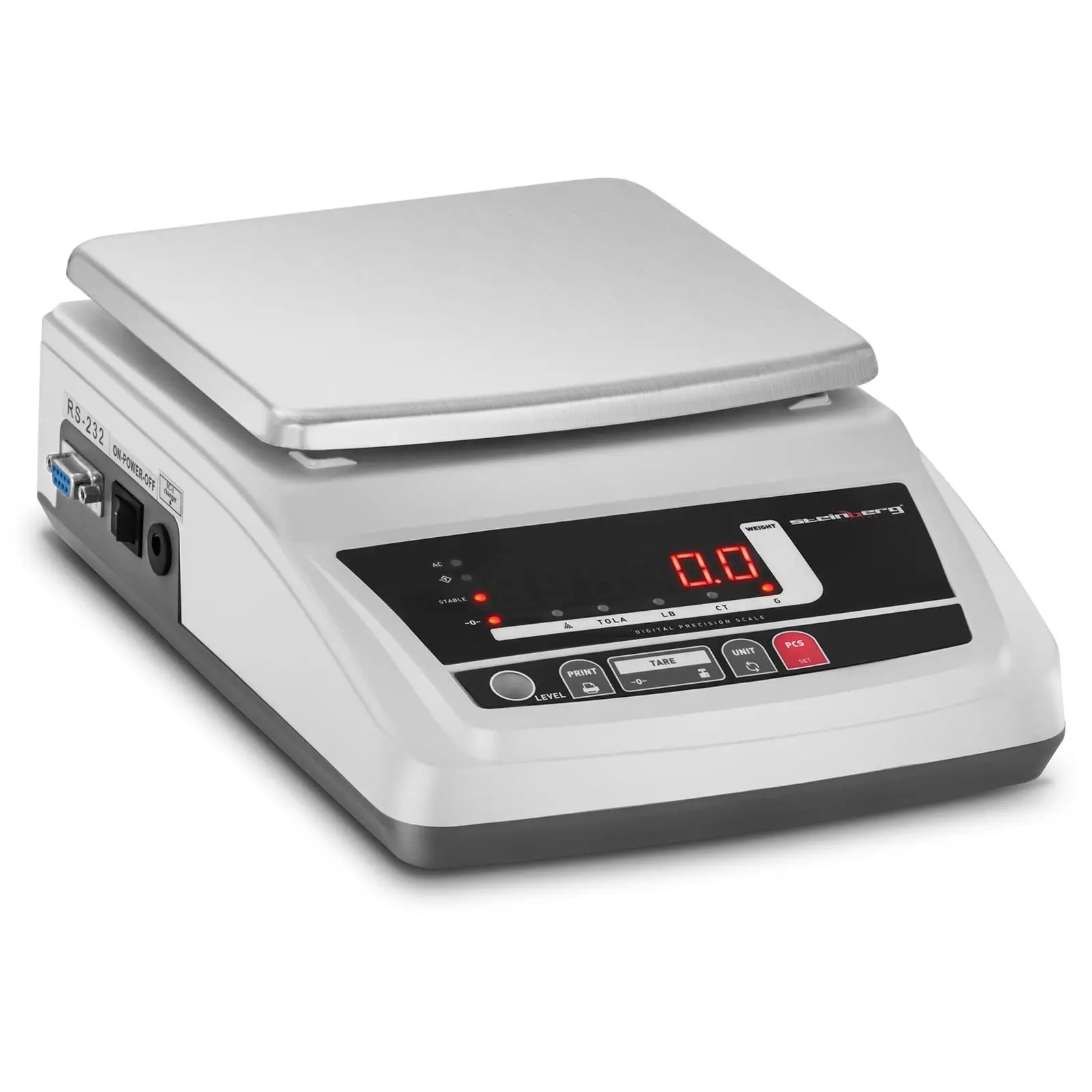 Steinberg Systemsin teollisuustarvikkeisiin kuuluva tarkkuusvaaka SBS-LW-300001 on ihanteellinen apulainen, kun halutaan saada tarkkoja mittaustuloksia – olipa kyseessä sitten laboratorio, teollisuus tai tutkimus. Hyvällä 0,1 g tarkkuudellaan digitaalinen tarkkuusvaaka punnitsee jopa 3 000 g painon. Voit tarvittaessa valita mittayksiköksi g, lb, ct tai tola. Tarkkuusvaa’an monipuolisiin toimintoihin lukeutuu yhteenlaskun ja nollauksen lisäksi myös taaraus pelkän esineen painon määrittämiseksi sekä kappalelaskentatoiminto (PCS). Helposti puhdistettava, 18 x 16 cm punnitustaso on valmistettu laadukkaasta ruostumattomasta teräksestä. Lisäetuna: intuitiivinen näppäimistö on veden- ja rasvankestävä. LED-näytön 14 mm korkeat, punaiset luvut mahdollistavat tulosten optimaalisen luettavuuden myös huonossa valaistuksessa. Tarkkuusvaaka 0,1 g varoittaa kahdella symbolilla sekä ylikuormituksen että akun matalan varaustilan. Akun tyhjentyessä voit ladata sen jälleen täyteen mukana toimitettavan laturin avulla. Tiedonsiirtoa varten voit liittää vaa’an tarvittaessa myös tietokoneeseen tai tulostimeen RS-232-portin kautta. Kompaktin tarkkuuvaa’an pienen painon ja jopa 24 tunnin akkukäytön ansiosta vaakaa voidaan käyttää kaikkialla riippumatta verkkovirrasta. Vaaka voidaan tasapainottaa aina vaivattomasti neljän säädettävän kumitassun ja sisäänrakennetun vatupassin ansiosta, jolloin se toimittaa aina luotettavat tulokset. Lisäksi liukumattomat kumitassut suojaavat työalustaa naarmuilta ja takaavat vankan pidon. Huomio: Tätä vaakaa ei voi virallisesti varmentaa, joten se soveltuu yksinomaan tarkistusvaa’aksi tai sisäiseen käyttöön.