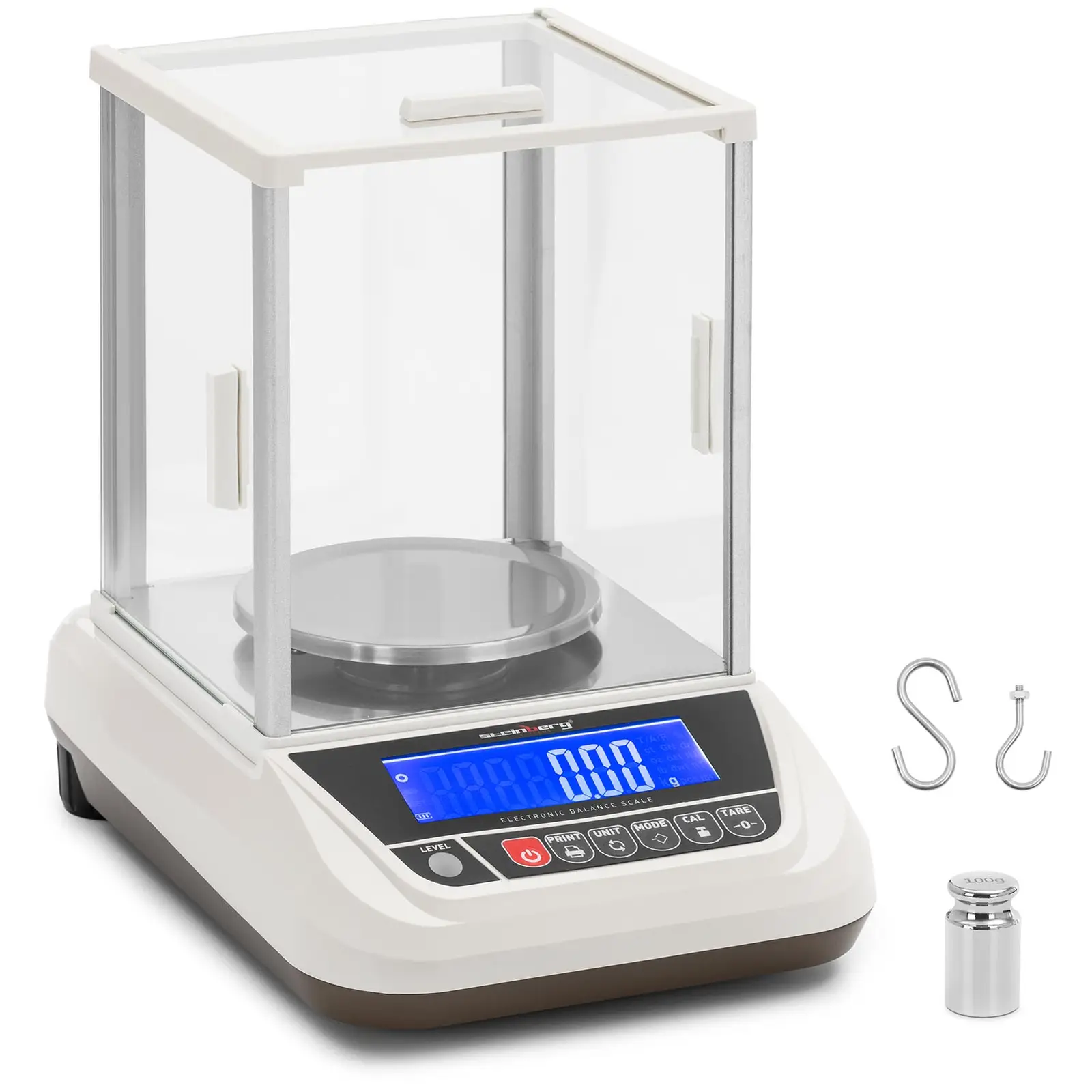 Työskenteletkö laboratoriossa, teollisuudessa tai tutkimuksessa ja punnitusten on tapahduttava gramman tarkkuudella tai oikeastaan vielä tarkemmin? Steinberg Systemsin teollisuustarvikkeisiin lukeutuvalla tarkkuusvaa’alla saat tarkan mittalaitteen, joka täyttää 100 % tarkkuusvaatimuksesi. Vaa’an tarkkuus on 0,01 g ja enimmäispunnituskapasiteetti 3 000 g. Tuulisuoja takaa tarkat tulokset. Tarpeidesi mukaan voit valita mittauksiisi erilaisia yksiköitä, kuten kg, g tai lb. Intuitiiviselta näppäimistöltä voit valita punnitukseen tarvittavat toiminnot. Voit valita taarauksen, nollauksen tai nopean yksikön vaihdon. Liitä vaaka tulostimeen RS-232-liitännällä ja tulosta tulos suoraan yhtä nappia painamalla. Suuri LCD-näyttö 26 mm korkeilla luvuilla, näyttää kaikki mittaustulokset selvästi ja hyvin luettavasti. Aseta punnittavat tavarat ruostumattomasta teräksestä valmistetulle, halkaisijaltaan 13 cm punnitustasolle. Puhdista tarvittaessa sileät pinnat etukäteen, jotta lika ei vaikuta mittaustuloksiisi. Tuulisuoja suojaa punnitustasoa tuloksia vääristäviltä ympäristövaikutuksilta. Lisäksi 10 – 20 minuutin lämmittelyaika lisää mittausten tarkkuutta. RS-232-liitännän ansiosta voit liittää asteikon tietokoneeseen tai, kuten edellä mainittu, tulostimeen. Punnitustason lisäksi voit suorittaa riippupunnituksen kahden koukun avulla. Tätä varten vaa’an pohjassa on syvennys. Ripusta kaksi mukana toimitettavaa koukkua niille tarkoitettuihin paikkoihin ja aseta ne aukon kohdalle. Nyt voit liittää punnittavat esineet tai punnitusastian koukkuihin punnitaksesi esineitä, jotka eivät mahdu punnitustasolle. Ota tarkkuusvaaka mukaasi! Alhaisen painonsa ja jopa 24 tunnin akkukäytön ansiosta vaakaa voidaan käyttää missä tahansa sähköverkosta riippumatta. Jos virta on vähissä, kytke vaaka virtalähteeseen ja lataa akku. Integroidun vatupassin ja säädettävien kumitassujen ansiosta voit helposti tasapainottaa tarkkuusvaa’an luotettavien mittaustulosten saavuttamiseksi. Lisäksi luistamattomat kumijalat suojaavat alustaansa naarmuilta ja varmistavat turvallisen jalustan.