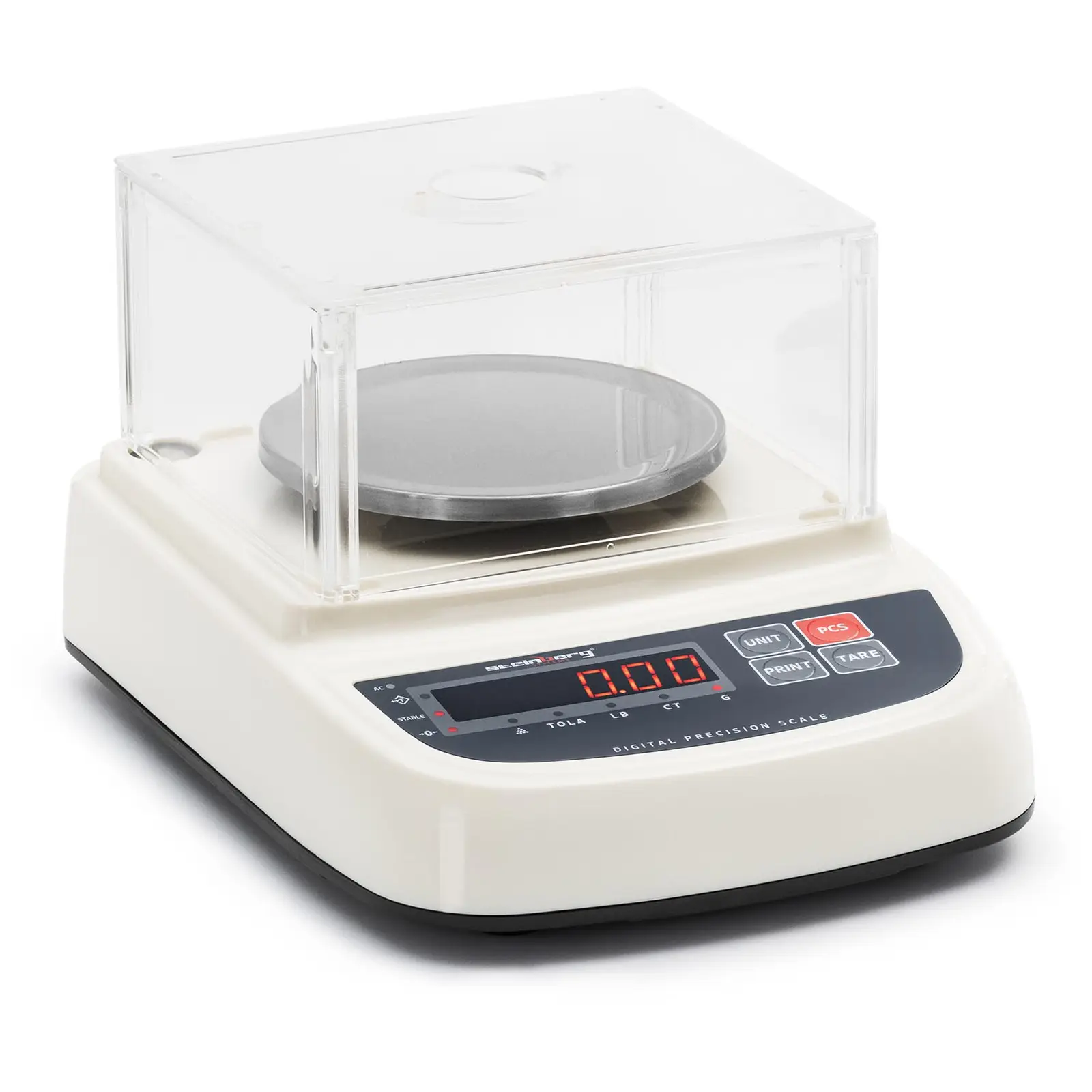 Työskenteletkö laboratoriossa, teollisuudessa tai tutkimuksessa ja punnitusten on tapahduttava gramman tarkkuudella tai oikeastaan vielä tarkemmin? Steinberg Systemsin teollisuustarvikkeisiin lukeutuvalla tarkkuusvaa’alla saat tarkan mittalaitteen, joka täyttää 100 % tarkkuusvaatimuksesi. Vaa’an tarkkuus on 0,01 g ja enimmäispunnituskapasiteetti 500 g. Tuulisuoja takaa tarkat tulokset. Tarpeidesi mukaan voit valita mittauksiisi erilaisia yksiköitä, kuten g tai lb. Intuitiiviselta näppäimistöltä voit valita punnitukseen tarvittavat toiminnot. Voit valita taarauksen, laskun tai nopean yksikön vaihdon. Liitä vaaka tulostimeen RS-232-liitännällä ja tulosta tulos suoraan yhtä nappia painamalla. Suuri LED-näyttö 14 mm korkeilla luvuilla, näyttää kaikki mittaustulokset selvästi ja hyvin luettavasti. Aseta punnittavat tavarat ruostumattomasta teräksestä valmistetulle, halkaisijaltaan 13 cm punnitustasolle. Puhdista tarvittaessa sileät pinnat etukäteen, jotta lika ei vaikuta mittaustuloksiisi. Tuulilasi suojaa punnitustasoa tuloksia vääristäviltä ympäristövaikutuksilta. RS-232-liitännän ansiosta voit liittää asteikon tietokoneeseen tai, kuten edellä mainittu, tulostimeen. Ota tarkkuusvaaka mukaasi! Alhaisen painonsa ja jopa 24 tunnin akkukäytön ansiosta vaakaa voidaan käyttää missä tahansa sähköverkosta riippumatta. Jos virta on vähissä, kytke vaaka virtalähteeseen ja lataa akku täyteen ainoastaan 8 tunnissa. Integroidun vatupassin ja säädettävien kumitassujen ansiosta voit helposti tasapainottaa tarkkuusvaa’an luotettavien mittaustulosten saavuttamiseksi. Lisäksi luistamattomat kumijalat suojaavat alustaansa naarmuilta ja varmistavat turvallisen jalustan.