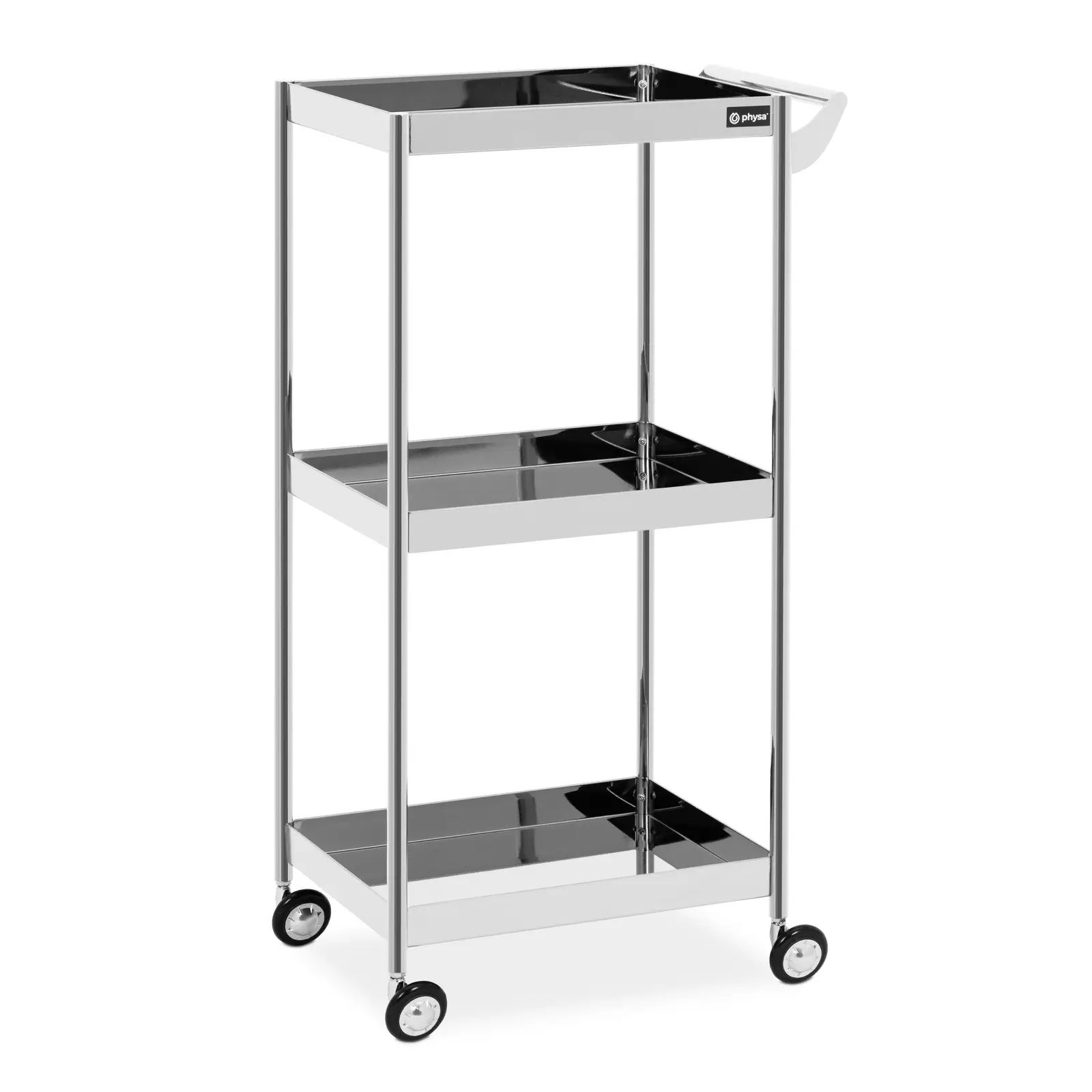 Tämä physan tarvikevaunu on käytännöllinen ja helposti liikuteltava säilytysjärjestelmä. Se tekee vaikutuksen hillityllä eleganssillaan, joka sopii täydellisesti mihin tahansa sisustustyyliin. Kätevällä rullavaunulla työvälineiden kuljettaminen haluttuun paikkaan on vaivatonta ja nopeaa. Neljän kääntyvän pyörän ansiosta voit kuljettaa sitä mukavasti monenlaisilla alustoilla, ja sen kompakti rakenne sujahtaa ongelmitta ahtaampienkin tilojen läpi. Lisäksi vaunu on erittäin kevyt. Sen sivussa on leveä työntökahva, jonka avulla pidät tarvikevaunun aina hallinnassa. Kolme hyllyä tarjoaa runsaasti tilaa työtarvikkeille, kuten pyyhkeille, voiteille tai puhdistusaineille. Niiden reunat ovat hieman korotetut, minkä ansiosta voit kuljettaa kärryssä kaikenlaisia välineitä turvallisesti, ilman että ne pääsevät putoamaan. Hyllytasojen välinen etäisyys on 37 cm. Jokainen hylly kantaa 10 kg painon, joten voit siirtää kärryllä yhteensä 30 kg kuorman kerrallaan. Pienestä painostaan huolimatta rullavaunu on erityisen vakaa ja kestävä. Se on valmistettu 2,5 mm paksusta ruostumattomasta teräksestä, minkä ansiosta se on iskun- ja korroosionkestävä. Materiaali kestää hyvin ulkoisia vaikutuksia, minkä ansiosta tämä työtarvikevaunu tekeekin vaikutuksen virheettömällä ulkonäöllään vielä vuosien käytön jälkeen.