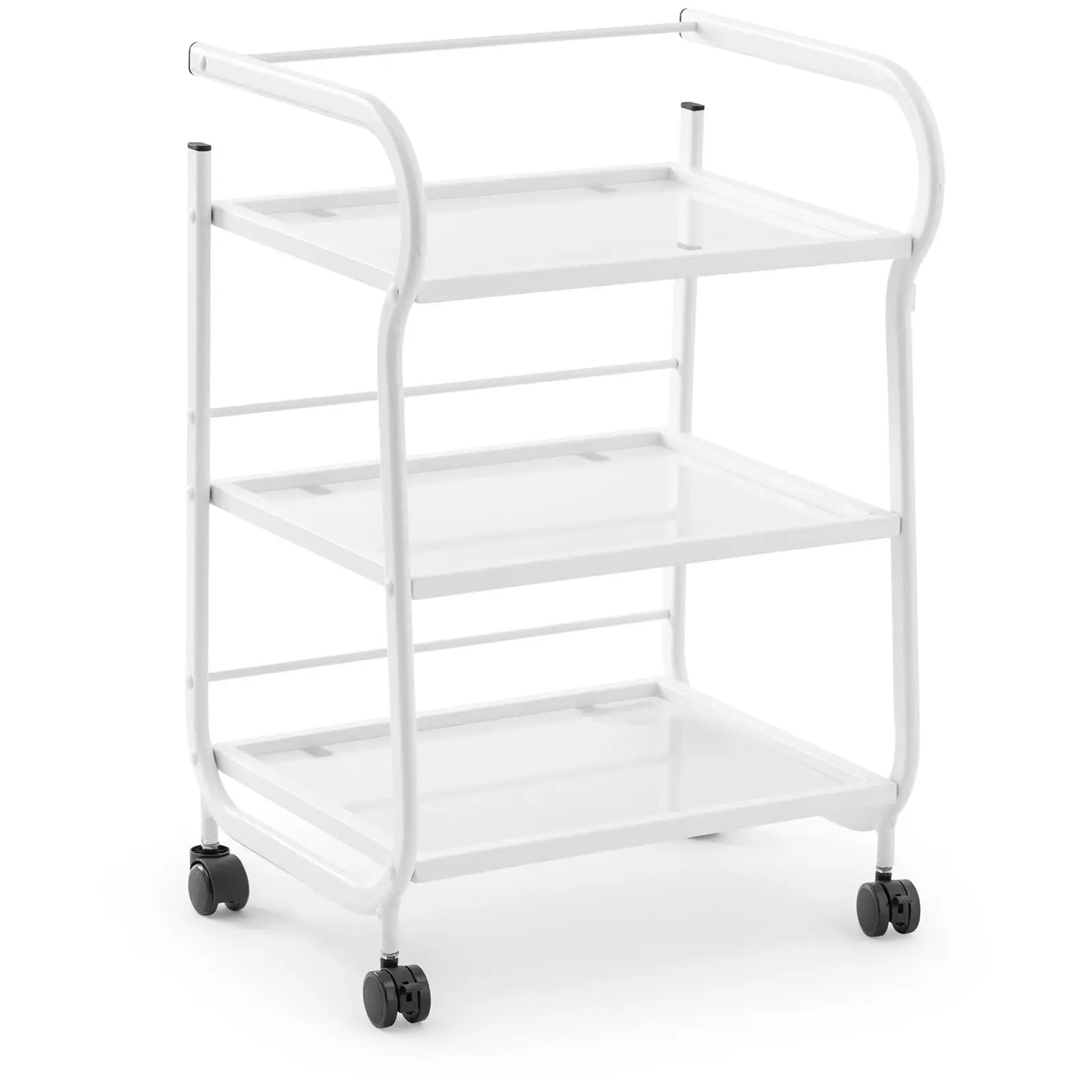 Kauneus- ja terveystuotteiden asiantuntija physa tarjoaa nyt käytännöllisen ja liikuteltavan säilytysjärjestelmän tämän tarvikevaunun muodossa. Tilaa säästävä rullavaunu auttaa optimaalisella tavalla kosmetiikan, pesuaineiden tai pyyhkeiden säilyttämisessä, olipa kyse sitten kauneushoitolasta, kampaamosta tai omasta kylpyhuoneestasi. Tämä malli tekee vaikutuksen hillityllä eleganssillaan, joka sopii täydellisesti jokaiseen sisustustyyliin. Kärryn suunnittelussa on kiinnitetty erityistä huomiota hyvään liikkuvuuteen. Tästä syystä tämä työkärry kampaamoon tai kauneushoitolaan sisältää 4 kevytliikkeistä pyörää. Lisäksi se on erittäin kevyt. Vaunu on helppo työntää haluttuun paikaan myös kaikki 3 hyllyä täyteen lastattuna. Tästä syystä tämä malli on erinomainen työkärry kampaamoon tai kauneushoitolaan, sillä voit kuljettaa sen avulla monenlaisia työvälineitä nopeasti ja tehokkaasti. Pienestä painostaan huolimatta rullavaunu on paitsi erityisen vakaa, myös erittäin kestävä. Sekä 532 x 430 mm:n kokoiset lasihyllyt että teräsrunko ovat kestäviä ja tekevät vaikutuksen virheettömällä ulkonäöllään vuosienkin käytön jälkeen. Laadukkaat materiaalit takaavat myös, että työtarvikevaunu on helppo ja nopea puhdistaa.