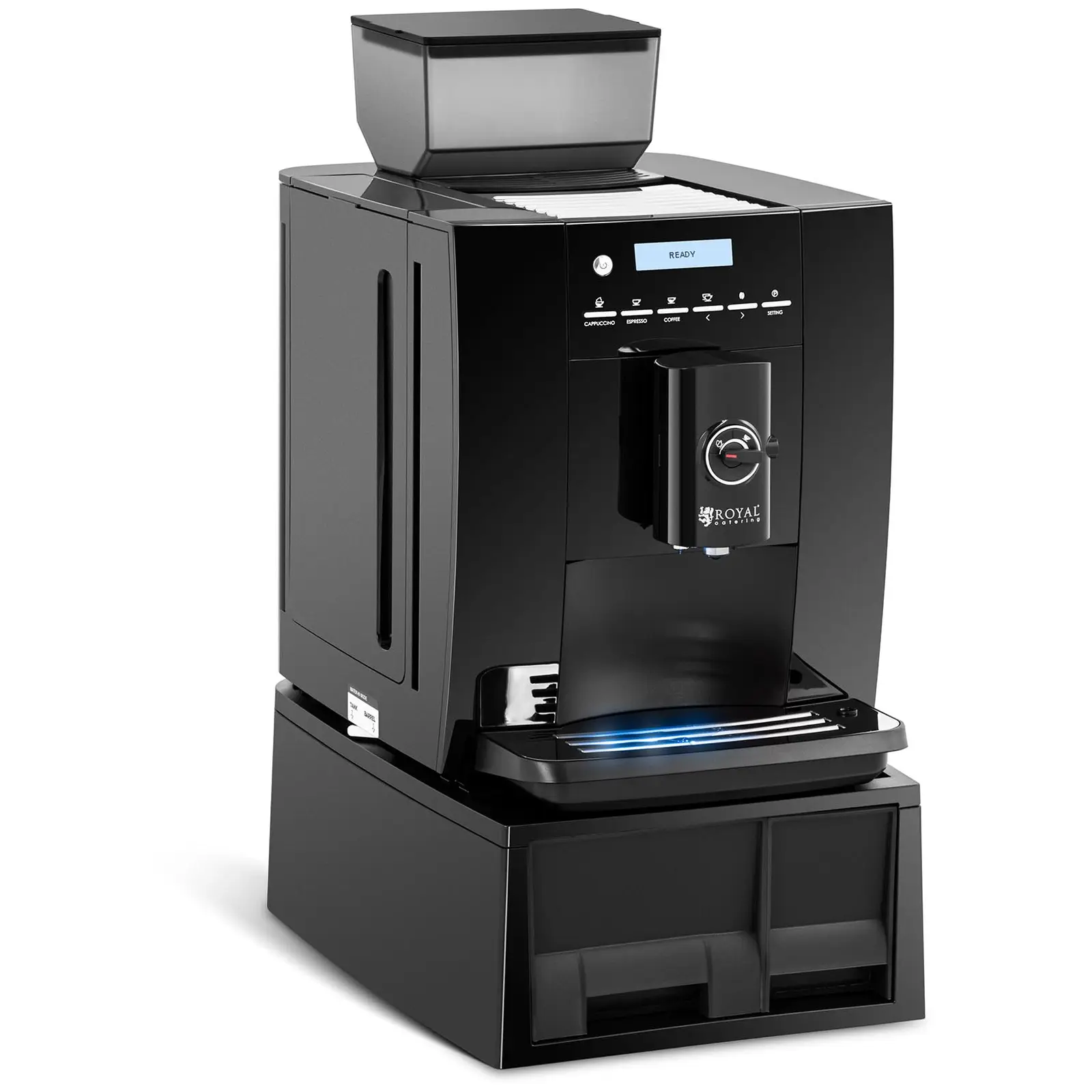 Mikä onkaan aamuisin tai lounastauoilla nautonnollisempaa kuin kuppi kuumaa kahvia? Tai vaikkapa kupillinen espressoa, cappuccinoa tai latte macchiatoa? Päätös on sinun! Ole oma baristasi Royal Cateringin, kahvinkeittimien ammattilaisten korkealaatuisella kahvinkeittimellä RC-FACMP Kahviautomaatti 1,8 l -vesisäiliöllä ja astialla 750 g kahvipapuja varten on myös ihanteellinen hotellien aamiaisbuffeteissa, ravintoloissa tai kioskeissa käytettäväksi. Sisäänrakennetun maitovaahdottimen avulla voit loihtia kuumia herkkuja, kuten latte macchiaton tai cappuccinon sekunneissa. Henkilökohtaisesta maustasi riippuen voit käyttää sisäänrakennettua myllyä kahvin annosteluun 7-14 g:n välillä. Helposti luettavassa LCD-näytössä näkyvät kaikki toiminnot, ohjeet ja virheilmoitukset yhdellä katsauksella. Kuuden ohjelmoitavan muistipaikan avulla suosikkikahvisi valmistetaan sinulle yhdellä napin painalluksella. 8-14 cm:n kupit mahtuvat korkeussäädettävän kahviputken alle niin, että voit asettaa vaikka latte macchiato-lasisi sen alle. Eikä sinun tarvitse huolehtia täysin automaattisten kahvinkeittimien usein niin monimutkaisesta puhdistuksestakaan: Tämä tarkkaan suunniteltu kahvikone ei omaa vain integroitua tippa-alustaa, vaan myös automaattisen puhdistusohjelman, joka pitää huolen säännöllisestä puhdistuksesta. Valitse tänään vielä automaattinen kahvikone ja tee hyvä teko itsellesi, perheellesi tai kollegoillesi.