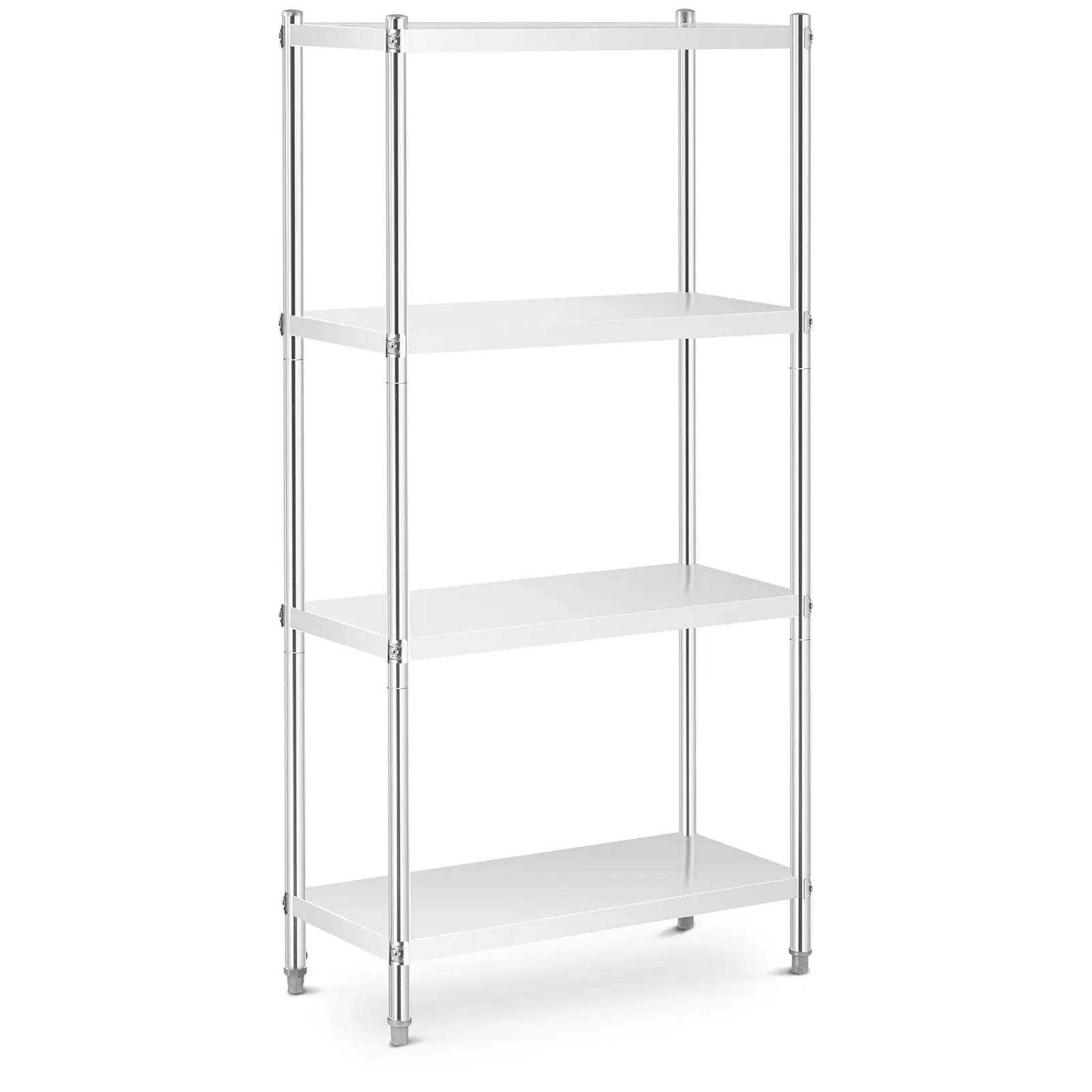 Royal Cateringin RCER-9040-hylly ruostumattomasta teräksestä on välttämätön hankinta kaikenlaisiin varastotiloihin, onpa kyseessä sitten pitopalvelu, hotelli, kauppa tai koti. Hygieeninen ja tukeva hylly soveltuu niin elintarvikkeiden kuin työkalujenkin säilyttämiseen ja kestää raskaitakin kuormia. Teräksinen hylly on täydellinen valinta, sekä ammatti- että yksityiskäyttöön! Keittiöhylly on mitoiltaan 90 x 40 x 180 cm, joten se sopii erinomaisesti suurkeittiöihin tai varastotiloihin. Hyllyn 50 kg:n kuormitettavuus mahdollistaa useiden esineiden samanaikaisen varastoinnin. Hyllyssä on yhteensä 4 tasoa. Hyllyn teräksinen rakenne on paitsi erittäin vakaa ja kestävä, myös erityisen helppo puhdistettava. Hylly on valmistettu hyvälaatuisesta ruostumattomasta teräksestä ja on täten erittäin pitkäikäinen ja kestävä, koska tämä lujatekoinen materiaali on korroosionkestävää sekä helposti puhdistettavaa. Lisäksi se täyttää alan vaatimat standardit eikä elintarvikkeiden säilytys ole ongelma. Hopeinen väri antaa hyllylle erityisen jalon ulkomuodon ja se soveltuu käytettäväksi kaikenlaisissa tiloissa, aina ravintoloista ja hotelleista yksityistiloihin. Ruostumattomasta teräksestä valmistetun hyllyn kokoaminen käy erittäin helposti ilman erillisiä työkaluja.