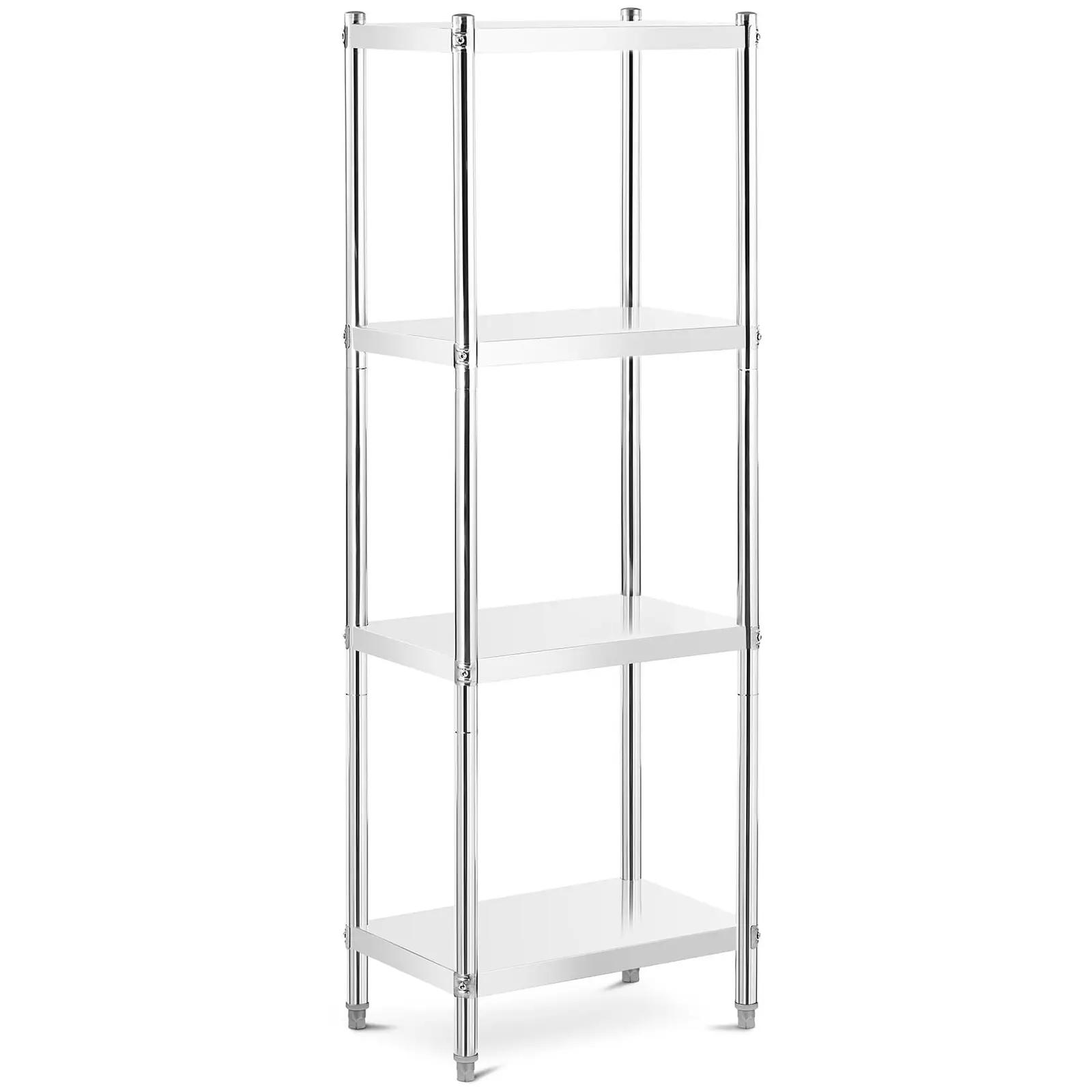Royal Cateringin RCER-6040-hylly ruostumattomasta teräksestä on välttämätön hankinta kaikenlaisiin varastotiloihin, onpa kyseessä sitten pitopalvelu, hotelli, kauppa tai koti. Hygieeninen ja tukeva hylly soveltuu niin elintarvikkeiden kuin työkalujenkin säilyttämiseen ja kestää raskaitakin kuormia. Teräksinen hylly on täydellinen sinulle, sekä ammatti- että yksityiskäyttöön! Keittiöhylly on mitoiltaan 60x40x180 cm, joten se sopii erinomaisesti suurkeittiöihin tai varastotiloihin. Hyllyn 50 kg: n kantavuus mahdollistaa useiden esineiden samanaikaisen varastoinnin. Hyllyssä on yhteensä 4 tasoa. Hyllyn teräksinen rakenne on paitsi erittäin vakaa ja kestävä, myös erityisen helppo puhdistettava. Hylly on valmistettu hyvälaatuisesta ruostumattomasta teräksestä ja on täten erittäin pitkäikäinen ja kestävä, koska tämä lujatekoinen materiaali on korroosionkestävää sekä helposti puhdistettavaa. Lisäksi se täyttää alan vaatimat standardit eikä elintarvikkeiden säilytys ole ongelma. Hopeinen väri antaa hyllylle erityisen jalon ulkomuodon ja se soveltuu käytettäväksi kaikenlaisissa tiloissa, aina ravintoloista ja hotelleista yksityistiloihin. Ruostumattomasta teräksestä valmistetun hyllyn kokoaminen käy erittäin helposti ilman erillisiä työkaluja.