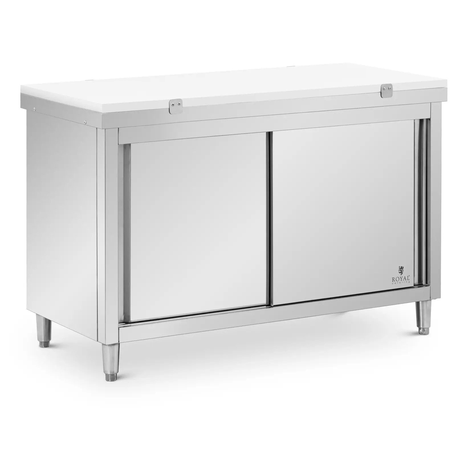 Olipa kyse ravintolasta, ruokalasta, hotellista, leipomosta, sairaalasta tai suurkeittiöstä: rst-kalusteet muodostavat perustan siistille keittiölle ja kaikenlaisten elintarvikkeiden hygieeniselle käsittelylle. Royal Cateringin työkaappi leikkuutasolla kuuluu jokaisen ammattikeittiön vakiovarusteisiin ja täyttää erityisesti ravintola-alan korkeat vaatimukset. Modernin 140 x 60 cm teräskaapin laaja työpinta-ala tarjoaa runsaasti tilaa päivittäiseen työhösi tuoreiden elintarvikkeiden ja keittiökoneiden kanssa. MDF-levystä valmistetun 30 mm paksun leikuutason, kestävän muovitiivisteen ja säilytyskaapin nerokas yhdistelmä mahdollistaa monenlaisia käyttömahdollisuuksia ja helpottaa keittiösi siisteyden ylläpitämistä. Työkaappi on varustettu kahdella käytännöllisellä ja tilaa säästävällä liukuovella, jotka tekevät siitä ihanteellisen apuvälineen etenkin ahtaisiin keittiöihin. Kaapissa säilytät keittiölaitteitasi turvallisesti ja siististi helppokäyttöisten liukuovien takana. Sisäosa on jaettu tukevalla välitasolla, joka varmistaa selkeän järjestyksen. Voit asettaa sen haluamallesi korkeudelle, ja se kantaa 70 kg painon. Kokonaisuudessaan tämä terässeinäkaappi kantaa jopa 500 kg kuorman. Ruostumattomasta teräksestä valmistettu metallikaappi on erittäin luja ja pitkäikäinen. Lisäksi se kestää loistavasti korroosiota ja mekaanisia vaurioita, kuten naarmuja. Materiaali on helppo puhdistaa perusteellisesti, joten se täyttää täydellisesti elintarvikkeiden kanssa työskentelyn hygieniavaatimukset.