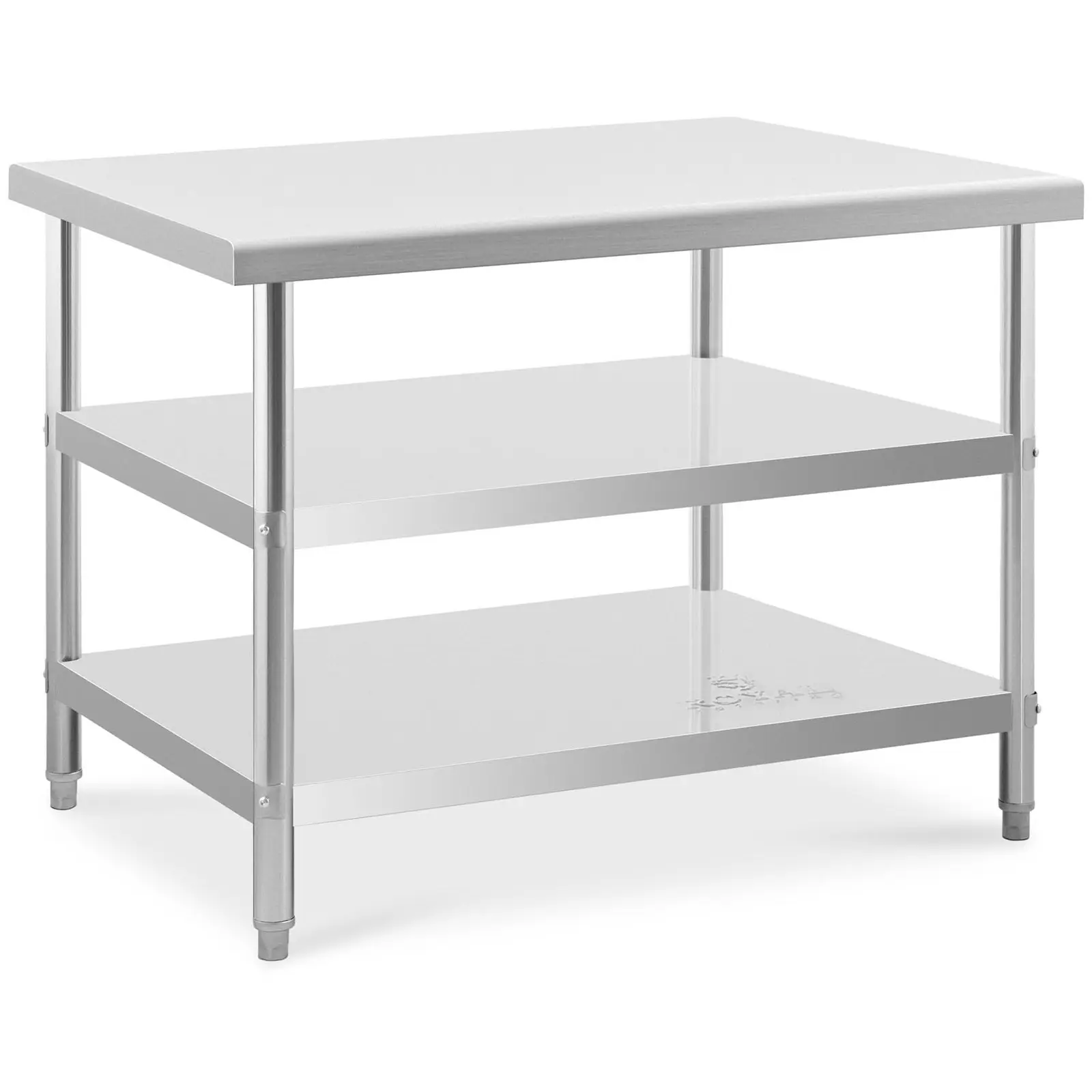 Ruostumattomasta teräksestä valmistetut huonekalut ovat perusta hygieeniselle keittiölle ja kaikenlaisten elintarvikkeiden puhtaalle käsittelylle. Royal Cateringin ravintolalaitteisiin lukeutuva ruostumattomasta teräksestä valmistettu pöytä sopii jokaiseen ammattikeittiöön. Se on suunniteltu vastaamaan erityisesti ravintola-alan korkeita vaatimuksia ja tarjoaa kolmitasoisella rakenteellaan ylimääräistä säilytystilaa. RST-pöydän työpinta-ala on 120 x 90 x 5 cm ja se tarjoaa runsaasti tilaa päivittäiseen työhösi. Toiset, alemmat tasot tarjoavat ylimääräistä säilytystilaa, mikä mahdollistaa järjestelmällisen ja selkeän työnteon. Suurempia, korkeintaan 29 / 26 cm korkuisia esineitä voidaan säilyttää näillä tasoilla. Teräspöytä on ihanteellisen vakaa 50 – 60 mm säädettävien jalkojensa ansiosta, epätasaisellakin lattialla. RST-työpöytä on nopeasti ja yksinkertaisesti koottava mukana tulevan kokoamismateriaalin ansiosta ja on näin hetkessä käyttövalmis. Kiinteät, halkaisijaltaan 48 mm pyöreät pöydän jalat vakauttavat pöytää ja lisäävät myös sen maksimikuormitusta, joka on 209 kg.