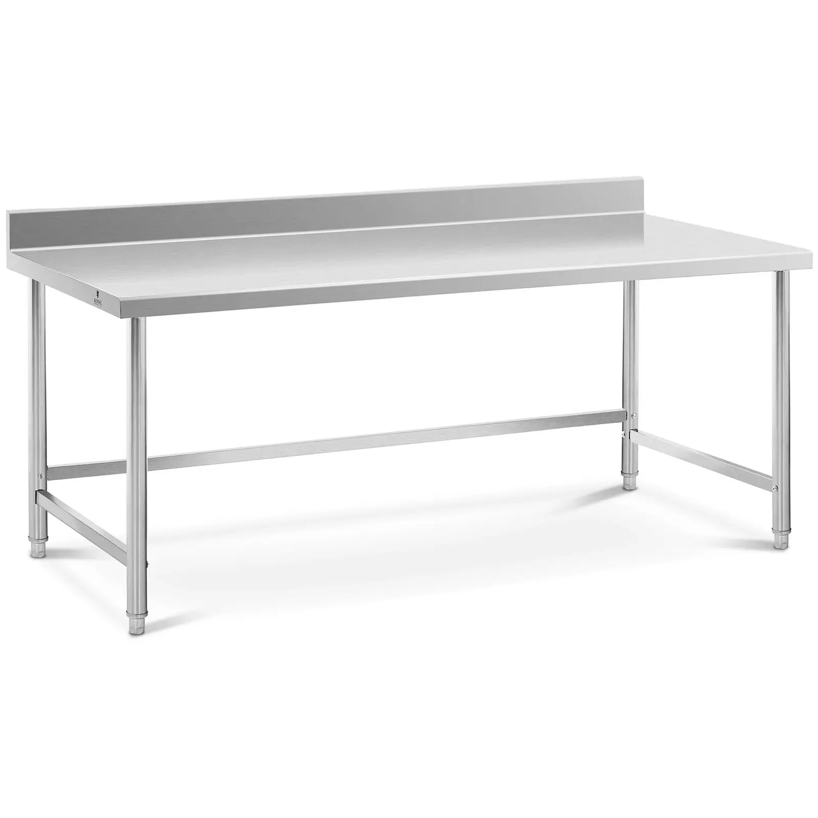 Ruostumattomasta teräksestä valmistetut huonekalut ovat perusta hygieeniselle keittiölle ja kaikenlaisten elintarvikkeiden puhtaalle käsittelylle. Royal Cateringin ravintolalaitteisiin lukeutuva ruostumattomasta teräksestä valmistettu pöytä sopii jokaiseen ammattikeittiöön. Se on suunniteltu erityisesti ravintola-alan korkeisiin vaatimuksiin ja tarjoaa pelkistetyllä rakenteellaan reilusti jalkatilaa ja mahdollisuuden alakaappien integroimiseen tai työvälineiden säilyttämiseen. RST-pöydän työpinta-ala on 200 x 90 cm ja se tarjoaa runsaasti tilaa päivittäiseen työhösi. 110 mm korkea roiskesuoja suojaa takaseinää ja ympäröivää aluetta vesiroiskeilta, lialta ja vaurioilta. Kiinteät, halkaisijaltaan 48 mm pyöreät pöydän jalat vakauttavat pöytää ja lisäävät myös sen maksimikuormitusta, joka on 100 kg. Korkealaatuinen suunnittelu takaa vakauden ja turvallisuuden. Pöytä on valmistettu kiillotetusta ruostumattomasta teräksestä, ja se on erittäin luja ja pitkäikäinen. Lisäksi se kestää loistavasti korroosiota ja mekaanisia vaurioita (esim. naarmuja). Materiaali on helppo puhdistaa perusteellisesti, joten se tarjoaa siten täydelliset olosuhteet hygieeniselle työskentelylle elintarvikkeiden parissa. Mukana toimitetun kokoamismateriaalin ja yksityiskohtaisen käyttöohjeen avulla ruostumaton teräspöytä on helppo ja nopea koota.