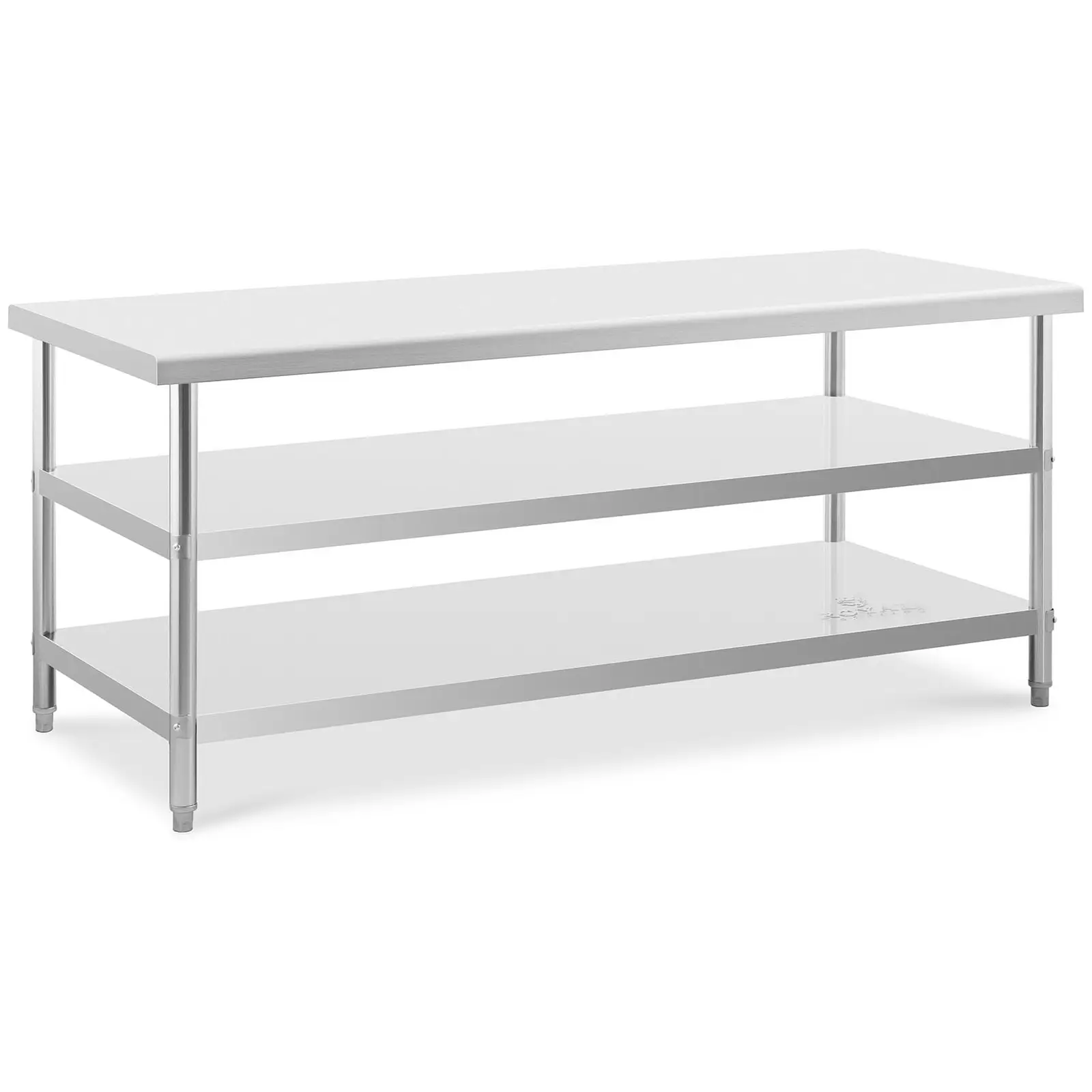 Ruostumattomasta teräksestä valmistetut huonekalut ovat perusta hygieeniselle keittiölle ja kaikenlaisten elintarvikkeiden puhtaalle käsittelylle. Royal Cateringin ravintolalaitteisiin lukeutuva ruostumattomasta teräksestä valmistettu pöytä sopii jokaiseen ammattikeittiöön. Se on suunniteltu vastaamaan erityisesti ravintola-alan korkeita vaatimuksia ja tarjoaa kolmitasoisella rakenteellaan ylimääräistä säilytystilaa. RST-pöydän työpinta-ala on 200 x 90 x 5 cm ja se tarjoaa runsaasti tilaa päivittäiseen työhösi. Toiset, alemmat tasot tarjoavat ylimääräistä säilytystilaa, mikä mahdollistaa järjestelmällisen ja selkeän työnteon. Suurempia, korkeintaan 29 / 26 cm korkuisia esineitä voidaan säilyttää näillä tasoilla. Teräspöytä on ihanteellisen vakaa 50 – 60 mm säädettävien jalkojensa ansiosta, epätasaisellakin lattialla. RST-työpöytä on nopeasti ja yksinkertaisesti koottava mukana tulevan kokoamismateriaalin ansiosta ja on näin hetkessä käyttövalmis. Kiinteät, halkaisijaltaan 48 mm pyöreät pöydän jalat vakauttavat pöytää ja lisäävät myös sen maksimikuormitusta, joka on 240 kg.