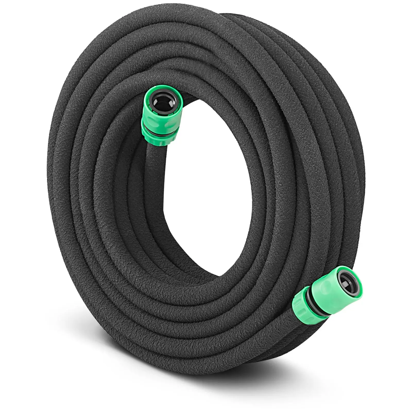 Tämä letku vuotaa ja hyvä niin. Sillä tällä tavalla letku jakaa veden tasaisesti kasveillesi. Monien kasvilajien, kuten tomaattien tai kurpitsojen tapauksessa on parempi, että niiden lehdet kastuvat mahdollisimman vähän. Hillvertin tihkuletku jakaa veden koko letkun pituudelta suoraan maahan. Tällöin vesi päätyy suoraan juurille, ilman että se vahingoittaa lehtiä. Tihkukasteluletkun pituus on 15 m. Kahden liitoskappaleen avulla voit sopeuttaa sen tarkasti omalle kasvimaallesi sopivaksi. Katkaise letku yksinkertaisesti kohdasta, josta letkun tulee kääntyä ja luo uusi liitos liitoskappaleiden avulla. Liitoskappaleiden ja muiden tihkuletkujen lukumäärästä riippuen voit laajentaa tihkukastelusysteemiäsi haluamallasi tavalla. Toimituksen sisältöön kuuluu kaksi pikaliitintä vesihanaan liittämistä varten ja yksi hanaosa. Tihkuletku toimii 4 bar maksimipaineella. Näin aikaansaadaan jopa 840 – 1 200 l/h läpivirtaus. Optimaalista kastelua varten voit pienentää painetta tarpeen mukaan vähentäen samalla vedenkulutusta jopa 70 %. Kumia ja polyetyleeniä oleva letku on erittäin lujatekoinen ja notkea. Täten se voidaan asettaa maahan helposti ja vankasti myös vedenpaineen ollessa korkea. Letku soveltuu erityisen hyvin käytettäväksi kasvihuoneissa, joissa kasteluun tarjolla oleva tila on rajoittunut ja kasteluratkaisu on toteutettava ahtaassa tilassa.