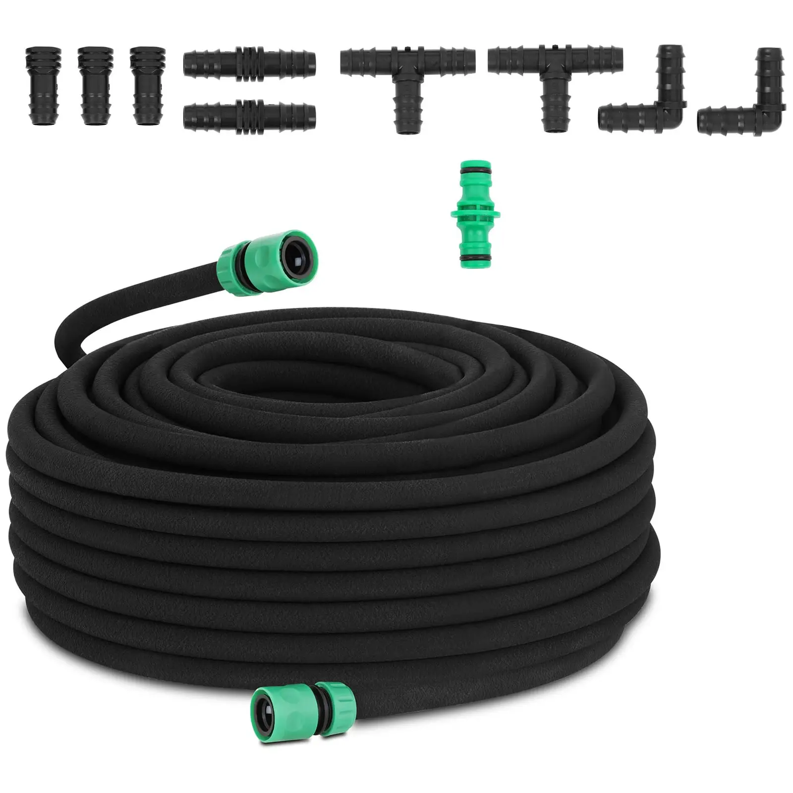 Tämä letku vuotaa ja hyvä niin. Sillä tällä tavalla letku jakaa veden tasaisesti kasveillesi. Monien kasvilajien, kuten tomaattien tai kurpitsojen tapauksessa on parempi, että niiden lehdet kastuvat mahdollisimman vähän. Hillvertin tihkuletku jakaa veden koko letkun pituudelta suoraan maahan, jolloin vesi päätyy suoraan juurille, ilman että se vahingoittaa lehtiä. Tihkukasteluletkun pituus on 50 m. liitoskappaleiden avulla voit sopeuttaa sen tarkasti omalle kasvimaallesi sopivaksi. Tätä varten settiin kuuluu T- ja kulmaliitoskappaleita. Katkaise letku yksinkertaisesti kohdasta, josta letkun tulee kääntyä ja luo uusi liitos liitoskappaleiden avulla. Liitoskappaleiden ja muiden tihkuletkujen lukumäärästä riippuen voit laajentaa tihkukastelusysteemiäsi haluamallasi tavalla. Toimituksen sisältöön kuuluu kaksi ½“-pikaliitintä vesihanaan liittämistä varten ja yksi hanaosa läpivientitiivisteellä. Tihkuletku toimii 4 bar maksimipaineella, jolla aikaansaadaan jopa 240 l/h läpivirtaus. Täydellisen kastelun aikaansaamiseksi painetta tulisi alentaa mahdollisimman pieneksi. Kumia ja polyetyleeniä oleva letku on erittäin lujatekoinen ja notkea. Täten se voidaan asettaa maahan helposti ja vankasti myös vedenpaineen ollessa korkea. Letku soveltuu erityisen hyvin käytettäväksi kasvihuoneissa, joissa kasteluun tarjolla oleva tila on rajoittunut ja kasteluratkaisu on toteutettava ahtaassa tilassa. Toimituksen sisältöön kuuluu myös koon L kokoiset puutarhahanskat, jotka kädessä letkun asettelu onnistuu siististi.