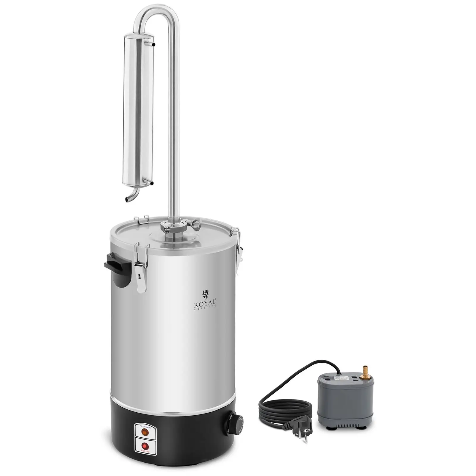 Royal Cateringin RCAD 20B -tislauslaitteella vedestä voidaan luotettavasti erottaa suolat, hivenaineet, mikro-organismit, lääkejäämät, kalkki tai lyijy ja muut epäpuhtaudet. Tällä tavalla puhdistettu vesi soveltuu erityisen hyvin siivoukseen, koska se poistaa lian tehokkaammin vedestä poistettujen ainesosien ansiosta ja kalkkitahrojen muodostus voidaan näin estää. Sähkölaitteiden, kuten silitysraudan, täyttämiseen tulisi käyttää vain tislattua vettä. Säästä itseltäsi rasittava pullojen kantaminen sekä puhdasta rahaa, mutta älä luovu puhtaasta vedestä. 2 000 W:n teholla vedentislauslaite saavuttaa nopeasti asetetun lämpötilaan aina 130 °C:seen asti. Termostaatti ylläpitää tislaukseen käytettävän lämpötilan turvallisesti. 20 litran tilavuudella tislauslaite on erittäin tehokas ja pystyy luotettavasti puhdistamaan suuriakin määriä epäpuhtauksia ja likaa vedestä. Laadukkaasta ruostumattomasta teräksestä valmistettu kotelo takaa parhaat hygieniavaatimukset puhdistusprosessin aikana. Tislattu vesi tulee ulos letkusta, jossa se voi jäähtyä hitaasti. Tislauslaite toimii aina turvallisesti ja vakuuttaa erityisen pitkällä käyttöiällään. Tämän takaa myös laitteen korkealaatuinen työstö. Laitteen mukana toimitetaan kaikki tislaustarvikkeet ja näin voit ottaa sen välittömästi käyttöön. Sivukahvojen ansiosta säiliötä on helppo kuljettaa. Valitse tislauslaite ja nauti puhtaudesta ilman haitallisia aineita ja epäpuhtauksia!