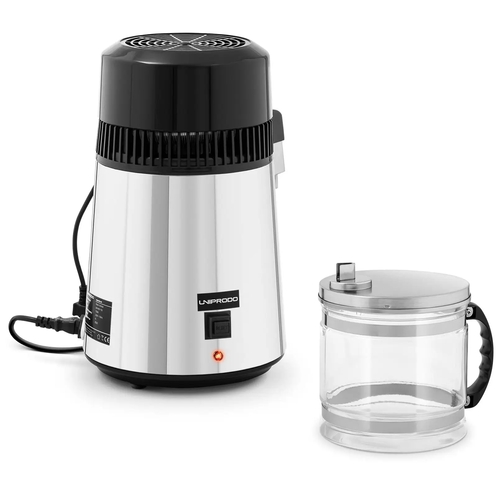 Uniprodon tislauslaitteella UNI-WD-150 suolat, hivenaineet, mikro-organismit, lääkejäämät, kalkki, lyijy ja muut epäpuhtaudet voidaan poistaa luotettavasti vedestä. Tällä tavalla puhdistettu vesi soveltuu erityisen hyvin siivoukseen, koska se imee paremmin likaa poistettujen ainesosien ansiosta ja kalkkitahrojen muodostus voidaan estää. Sähkölaitteiden, kuten silitysraudan, täyttämiseen tulisi käyttää vain tislattua vettä. Viimeisenä mutta ei vähäisimpänä, puhdistettu vesi sopii myös juomiseen – jotkut uskovat sen laihduttavaan vaikutukseen tai paremman kahvin tai teen maun aikaansaamiseen. Se, että tislattu vesi on haitallista, on nyt osoitettu vääräksi tiedoksi; sitä ei kuitenkaan pidä juoda ainoastaan eikä liikaa. Säästä itseltäsi rasittava pullojen kantaminen sekä puhdasta rahaa, mutta älä luovu puhtaasta vedestä! 820 W: n teho ja 4 l:n tilavuus tekevät laitteesta erittäin tehokkaan. Vesitislaus poistaa epäpuhtaudet ja lian luotettavasti jopa 1 litrasta vettä tunnissa. Laadukkaasta ruostumattomasta teräksestä valmistettu sisäseinä takaa parhaat hygieniavaatimukset puhdistusprosessin aikana. Tislattu vesi kerätään tyylikkääseen kannuun, joka on valmistettu lasista. Automaattisen virrankatkaisun ansiosta yli 160 °C:n lämpötilassa tislauslaite toimii aina turvallisesti ja sen käyttöikä on erityisen pitkä. Tämän takaa myös laitteen korkealaatuinen työstö. Valitse vedentislauslaite ja hyödy puhtaudesta ilman haitallisia aineita ja epäpuhtauksia!