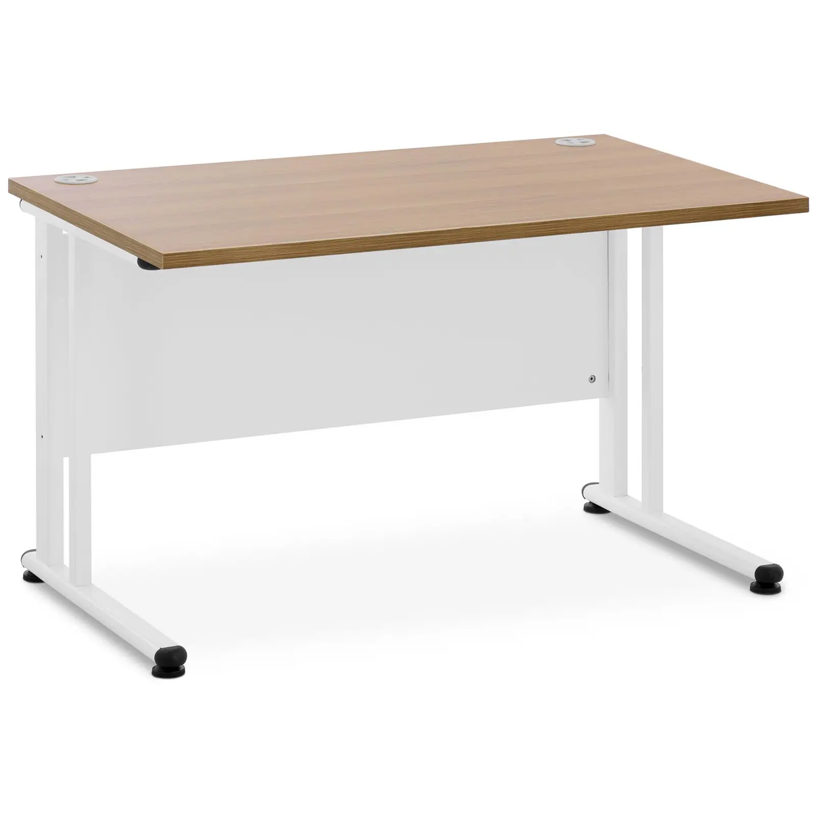 Olitpa sitten toimistossa tai kotona: Fromm & Starckin monipuolinen toimistopöytä STAR_DESK_28 on työskentelysi perusta. Se tarjoaa tilaa tietokoneille, monitoreille, piirtoalustalle tai muille tarvikkeille. Toiminnallinen ja hillitty muotoilu sopii mihin tahansa työympäristöön. Käytä ajattoman modernia pöytää, jossa on suuri työtaso kirjoittamiseen, käsitöiden tekemiseen tai tietokoneellesi! Toimistopöytä vakuuttaa vankalla ja kompaktilla rakenteellaan, joka kestää jopa 100 kiloa. Teräksiset pöytäjalat ja 27 mm paksu pöytälevy muodostavat vakaan perustan kaikille tarvikkeillesi. Käyttöohjeiden ja kokoamismateriaalin avulla työpöytä on koottu käden käänteessä. Kompakteilla mitoillaan (120 x 73 cm) kirjoituspöytä mahtuu melkein mihin tahansa ja hienovaraisella muotoilullaan se takuulla sopeutuu melkein mihin tahansa sisustustyyliin. 72 cm korkeus on ihanteellinen mukavaan työskentelyyn pöydän ääressä. Kaksi syvennystä johdoille mahdollistavat hienovaraisen johtojen ohjauksen sähkölaitteista virtalähteeseen. Ruskea pinta on valmistettu melamiinilla päällystetystä lastulevystä ja on yhtä helposti puhdistettava kuin vankat, valkoiset teräsjalat. Käytetty materiaali osoittautuu erityisen kestäväksi ja pitkäikäiseksi, joten voit käyttää toimistopöytää vuosien ajan. Muoviset (PP) suojatulpat varmistavat vankan jalustan ja estävät lisäksi lattian naarmuuntumisen.