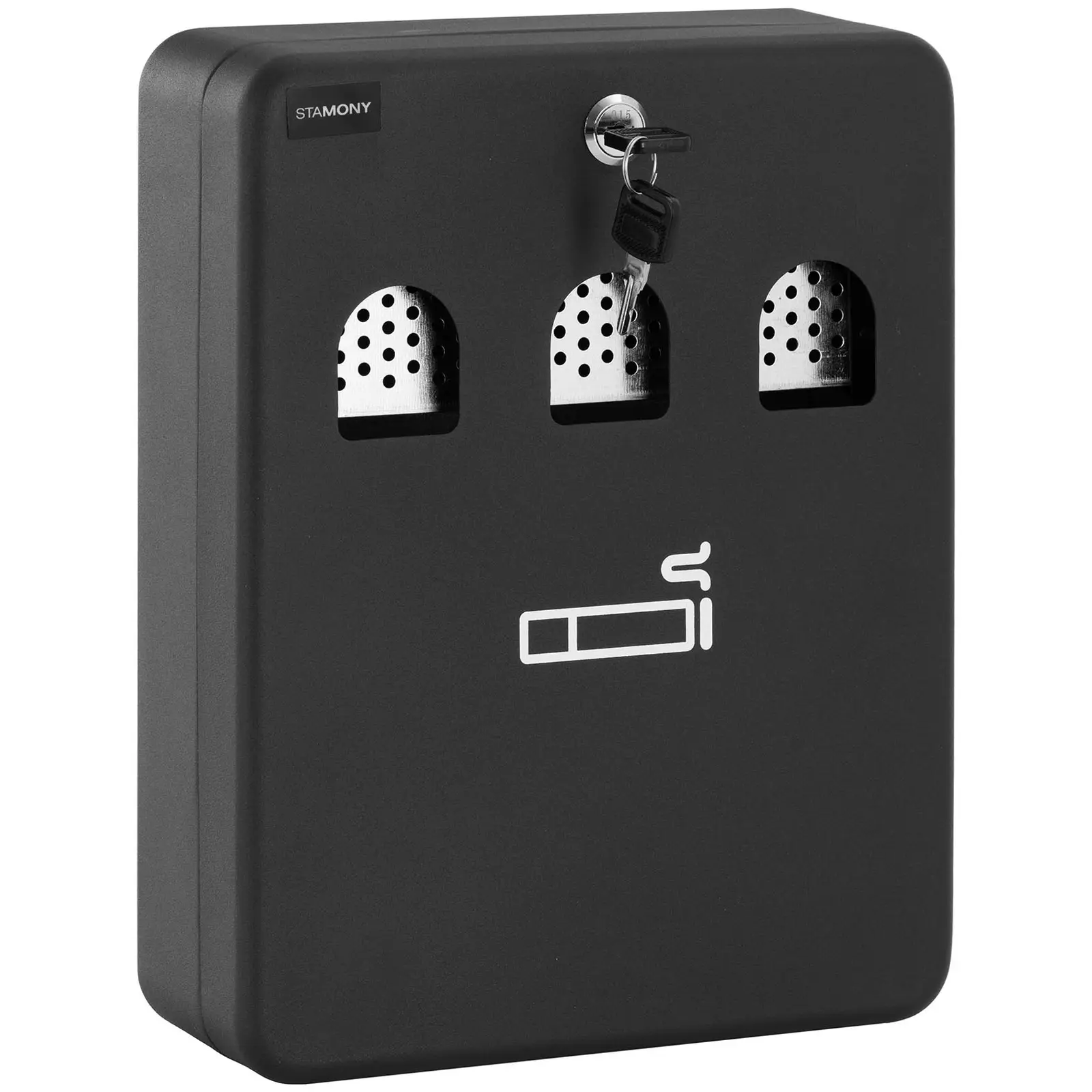 Onko koko terassi taas täynnä tupakantumppeja? Ärsyttävätkö tulvivat tai kaatuneet jäteastiat? Stamonyn tuhkakuppi seinälle on ratkaisu ongelmaan. Sen avulla pidät terassit ja muut tupakoinnin sallivat tilat siisteinä julkisilla paikoilla, ravintoloissa tai toimistoissa. Helposti koottava ja seinään kiinnitettävä tuhkakuppi selkeällä savukekuvalla tarjoaa asiakkaille, vierailijoille ja työntekijöille mahdollisuuden hävittää savukkeet oikein. Ulkotuhkakuppi on myös lukittavissa (sis. 2 sopivaa avainta). Erillisen tuhka-astian ansiosta voit tyhjentää tuhkakupin nopeasti, helposti ja siististi. Kokonaismitoiltaan 30 x 23 x 8 cm suuri tuhkakuppi ulos on erittäin tilava ja vähentää siten tyhjennyskertojen tiheyttä. Tämä tuhkakuppi ulkokäyttöön on valmistettu kylmävalssatusta teräksestä. Siinä on musta jauhemaalattu pinta, joka on ruosteen- ja säänkestävä. Sen hienovarainen, musta retromuotoilu sopii kuitenkin hyvin myös sisäkäyttöön. Käytit sitä sitten sisällä tai ulkona, toimitukseen sisältyvän asennusmateriaalin ansiosta tuhka-astian kiinnittäminen haluttuun paikkaan sujuu nopeasti ja vaivattomasti.