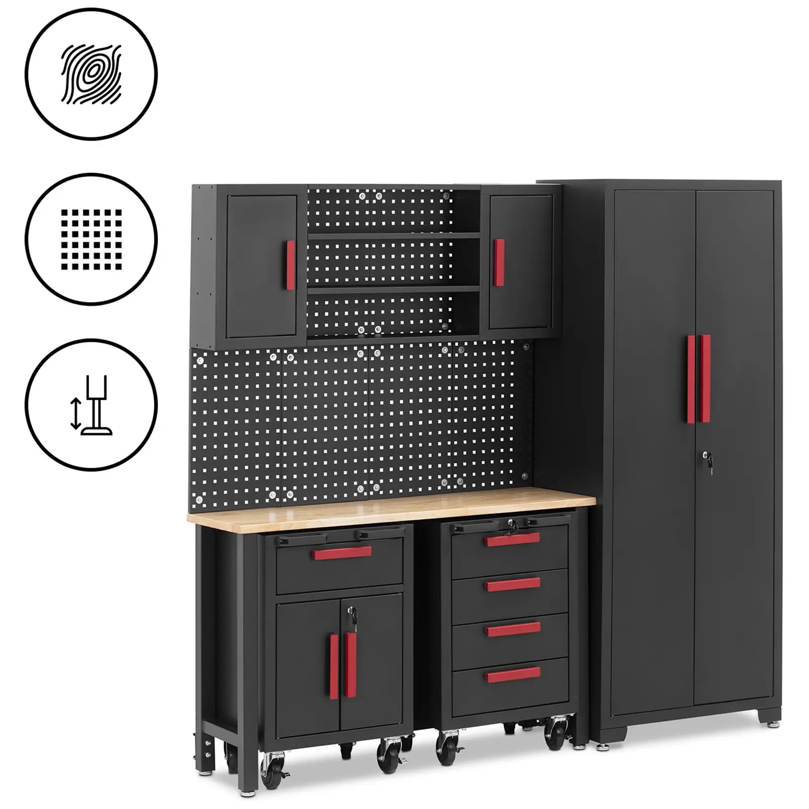 MSW:n lukittava työkalukaapisto tarjoaa käyttöösi suuren säilytystilan, rei’itetyn seinäpaneelin, 4 tilavaa vetolaatikkoa ja erikokoisia kaappeja, joissa säilytät kaikki tarvitsemasi työtavarat. Kaappi ja rullakot ovat lukittavia, joten voit varastoida työkalusi niihin turvallisesti. Metallista ja puusta valmistettu työasema kestää raskaitakin töitä. Työtason kantavuus on 200 kg, hyllyjen 50 kg ja käytännöllisissä seinäkaapeissa voit säilyttää jopa 30 kg painavia työkaluja. Kaapit on valmistettu pitkäikäisestä teräksestä. Puinen työtaso on erittäin kestävä. Työtason koko on 132 x 42,7 x 2,5 cm, joten se tarjoaa reilusti tilaa työkaluille ja materiaaleille. Voit myös vetää esiin kestävästä kovapuusta valmistetun pöytälevyn milloin tahansa ja käyttää sitä liikuteltavana työasemana. Tämä modulaarinen työkalukaappi sisältää kaksi metallisäiliötä. Säiliöt seisovat neljällä pehmeästi pyörivällä pyörällä, joista kahdessa on jarrut. Säiliöitä siirtämällä saat käyttöösi vapaata tilaa työpöydän ääressä työskentelyyn. Työtason alle sijoitettuna ne tarjoavat puolestaan käyttöösi erityisen tilaa säästävän säilytysratkaisun. Peltikaappi sisältää 3 hyllyä, jotka voit asentaa joustavasti haluamallesi korkeudelle. Koko järjestelmän rakenne on modulaarinen, joten voit sijoittaa kaikki yksittäiset elementit sinulle parhaiten sopivaan paikkaan. Modulaarinen työkalukaappi seisoo säädettävillä jaloillaan jopa 25 mm:n korkeudella. Näin se seisoo tukevasti myös epätasaisilla alustoilla ja varmistaa vaakasuoran linjauksen. Koko työasema onkin erityisen vankkarakenteinen. Jos kuitenkin kaipaat tätäkin enemmän vakautta, voit kiinnittää kaapiston seinään. Näin se ei pääse kaatumaan kovemmassakaan käytössä.