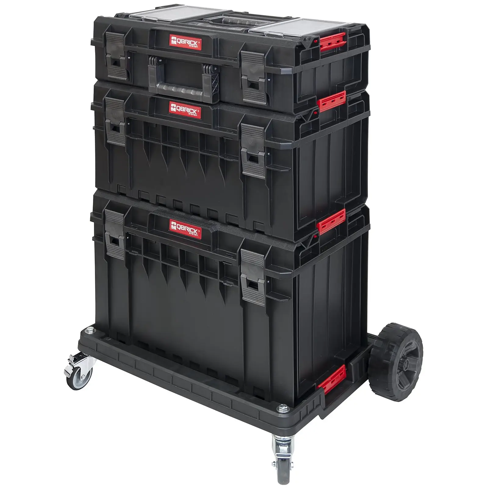 Qbrick System tarjoaa liikkuvia, monipuolisia ja yhdisteltäviä säilytysjärjestelmiä, kuten työkalupakkeja, työkalulaatikoita, kuljetusalustoja ja muita vaihtoehtoja erikokoisten työkalujen ja materiaalien turvalliseen sijoittamiseen ja optimaaliseen järjestämiseen. Tämän sarjan mukana saat Profi-sarjan kuljetusalustan ja kolme erikokoista työkalusalkkua. System ONE säilyttää kaikki työkalusi varmasti käden ulottuvilla, olipa kyseessä sitten työpaja, työmaa tai harrastushuone. Työkalusalkut ovat älykäs ratkaisu työvälineiden kuljettamiseen ja säilyttämiseen turvallisesti jopa kuluttavissa olosuhteissa. Haluatko säilyttää työkalusi kätevästi yhdessä paikassa, aina käden ulottuvilla? Tällöin Qbrick Systemin työkalupakit 200, 350 ja 450 Profi ovat juuri se, mitä tarvitset! Pienen koon ja ergonomisen kahvan ansiosta voit kuljettaa työkalut ja materiaalit helposti työpaikallesi ja säilyttää ne käyttövalmiina pilaamatta työkalujesi järjestystä. Kolme työkalusalkkua eroavat toisistaan pääasiassa kooltaan, joten ne tarjoavat aina oikean säilytystilan erikokoisille työkaluille. Työkalulaatikoiden kannessa on kaksi järjestelijää ruuveja tai muita pieniä lisätarvikkeita varten. Työkalusalkkujen sisätilassa on lisäksi kaksi tilanjakajaa, joten voit lajitella työkalusi juuri haluamallasi tavalla. Kiinnitysjärjestelmä takaa salkkujen helpon yhteenliittämisen ja kiinnittämisen kuljetusalustaan kuljetusta varten. Muovista (polypropyleeni) valmistetun vankan rakenteen ansiosta työkalulaatikot ovat erittäin vakaita ja pitkäikäisiä, joten voit olla varma, että työkalusi säilyvät turvallisesti myös silloin, kun niitä kuljetetaan pikkubussissa tai työmaalla. Jokaisessa salkussa on kaksi voimakasta suljinta, jotka pitävät kannet tiiviisti suljettuna kaikissa tilanteissa, kun taas tiivistysrenkaat varmistavat, ettei vesi tai pöly pääse salkkuihin sisälle. Ergonominen kahva mahdollistaa käyttömukavuuden paikasta huolimatta. Kuljetusalusta, johon kolme työkalusalkkua on kiinnitettävissä vakaasti, parantaa liikuteltavuutta. Kumista ja muovista valmistetut pyörät sekä metalliset akselit antavat tukevan jalustan. Polypropeenialusta on myös erittäin vankka, muttei kuitenkaan liian painava, joten sitä voidaan liikutella ongelmitta korjaamossa. Kaksi liikkuvaa ja kaksi staattista pyörää takaavat optimaalisen ohjattavuuden ja liikuteltavuuden. Kiinteä pyöräjarru takaa täydellisen ja luotettavan paikallaan pysymisen.