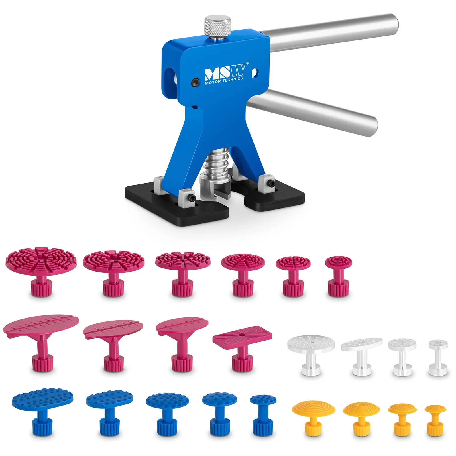 Lommonoikaisu maalipintaa säästäen – MSW:n työkalusarja lommonoikaisuun on juuri tätä varten suunniteltu. Ennen kaikkea pienet lommot saadaan oikaistua tällä työkalusarjalla mitä helpoiten. Näin vähennät kuluja, säästät aikaa ja vältät autojen, kuorma-autojen ja moottoripyörien peltien rasittavia ja usein laaja-alaisia maalaustöitä. Helppo käsiteltävyys tekee työkalusarjasta sopivan niin ammattilaisille kuin harrastelijoillekin. Lommonoikaisija voidaan sopeuttaa mitä erilaisen muotoisille lommoille niiden suoristamiseksi. Tätä varten oikaisija on varustettu 19 kumisella ja neljällä alumiinisella vetonupilla. Oikaisunuppien suuren lukumäärän ansiosta väline on hellävarainen ratkaisu jokaisen lommon poistoon. Lommonoikaisijalla pienten lommojen ammattimainen poisto on mahdollista ilman, että aikaa vievä maalaus on tarpeellista. Varsinkin, kun maalipinta ei ole alun perin vaurioitunut, on tämä hellävarainen oikaisumenetelmä ihanteellinen valinta pienten peltivaurioiden korjaamiseen tehokkaasti ja edullisesti. Poista lommot ilman, että sen jälkeen pinta on maalattava. Käytä PDR-sarjan (Paintless Dent Repair) työkaluja ja säästä korjauksen vaativaa aikaa ja rahaa. Kun maalipinta on vielä virheetön on PDR-työkalut ihanteellisia ajoneuvon arvon säilyttämiseksi. Lisäksi PDR-työkalujen kompakti koko mahdollistaa vaivattoman kuljettamisen asiakkaiden luo.