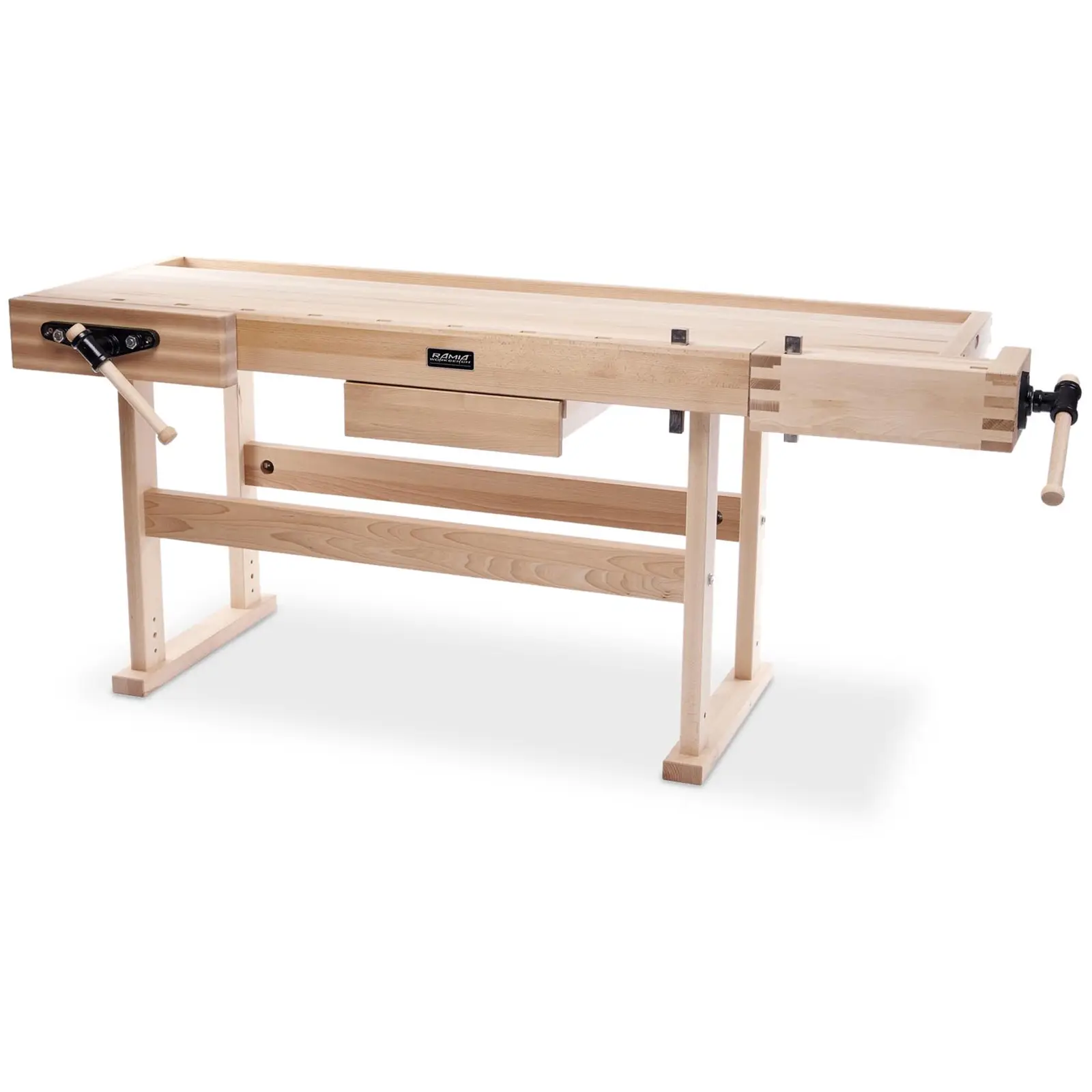RAMIAn ammattimaisella työpenkillä voit kätevästi käsitellä monenlaisia työkappaleita. Kaksi ruuvipuristinta, integroitu laatikko ja erikoiskara helpottavat työskentelyä jokaisessa työpajassa. Työpöytä ruuvipuristimella on valmistettu jykevästä pyökkipuusta. Vaalea puu tekee vaikutuksen kovalla, erittäin tiheällä pinnallaan, joten se on ihanteellinen materiaali työtasoille. 40 mm paksuinen ja mitoiltaan 2 120 x 760 mm oleva taso tarjoaa paljon tilaa erilaisiin projekteihin. Työpenkki koostuu luotettavilla sormiliitoksilla toisiinsa kiinnitetyistä puuosista Laadukas puu ja perinteiset liitokset tekevät työpenkistä erittäin vankan ja pitkäikäisen. Työpöydän etupuolella on laatikko. Siellä voit kätevästi säilyttää eniten käytettyjä työkalujasi aina käden ulottuvilla ja suojata ne pölyltä ja lialta. Työpenkissä on 2 ruuvipuristinta. Edessä oleva ruuvipuristin on kooltaan 500 x 55 mm. Sivussa oleva ruuvipuristin on kooltaan 470 x 120 mm ja siinä on erikoiskara työkappaleiden kiinnittämiseksi. Molemmat puristimet on avattavissa 190 mm leveydelle.