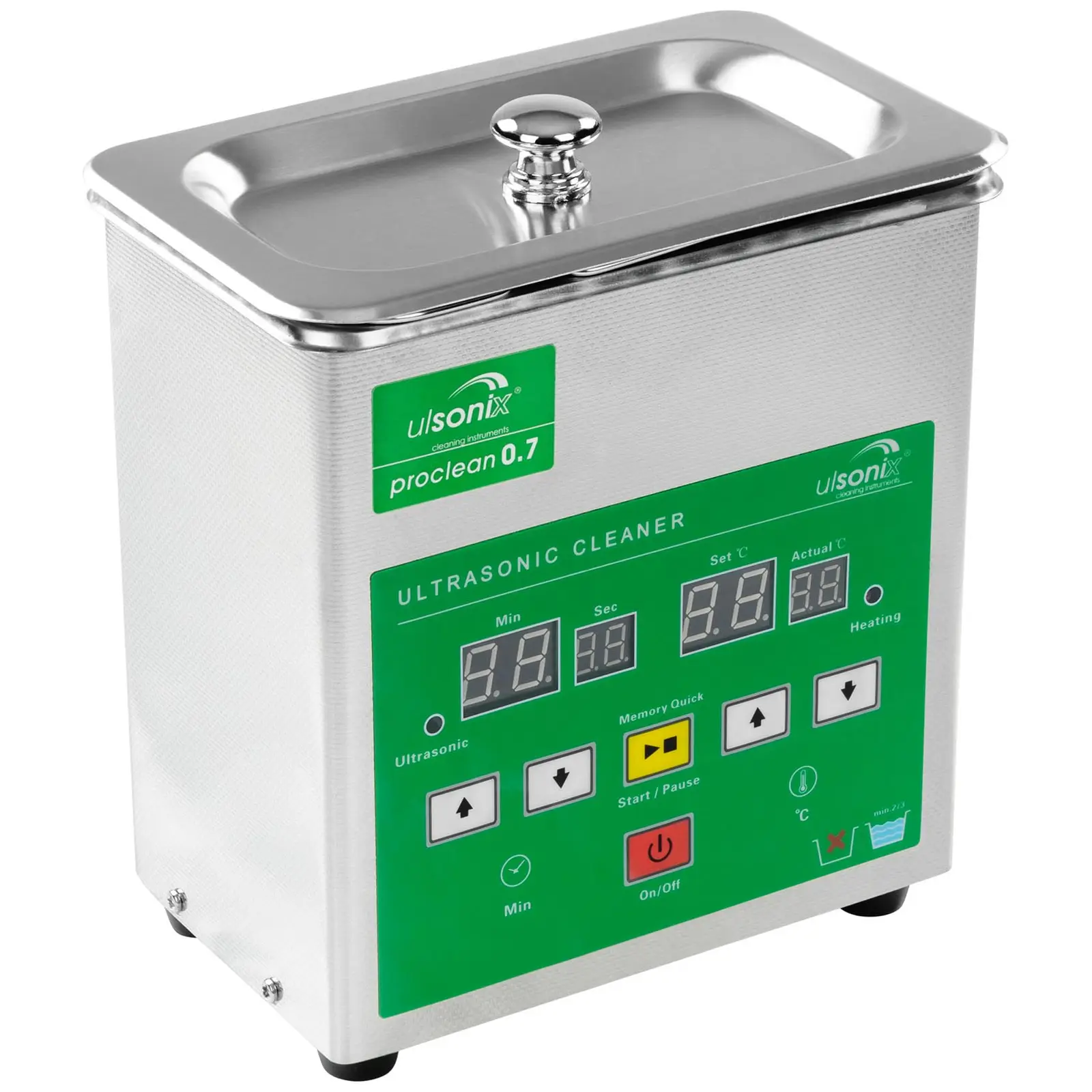 Tämä Ulsonixin ultraäänipesuri PROCLEAN 0. 7 on välttämätön kaikkialla, missä halutaan puhdistaa erittäin herkkiä instrumentteja, kuten kultasepän työkaluja tai mekaanisia ja elektronisia osia perusteellisesti: olipa kyseessä sitten lääkärin vastaanotto, laboratorio, tatuointistudio, koruliike, kellosepänliike tai optikko. Pesurilla puhdistat lisäksi korut, jalokivet, kolikot, ruokailuvälineet tai silmälasit luotettavasti myös yksityiskäytössä. Pesurissa on yksi ultraäänilähetin, jolla se saavuttaa jopa 60 watin ultraäänitehon. Tämä takaa tasaisen, voimakkaasti jakautuvan ultraäänen ja täten erinomaiset puhdistustulokset. Lämmitysteho saavuttaa jopa 60 wattia. Pesusäiliön tilavuus on 700 millilitraa ja veden lisäksi siihen voidaan lisätä myös puhdistusnestettä. Memory Quick -toiminto yksinkertaistaa ultraäänipesurin käyttöä, sillä voit koska tahansa keskeyttää puhdistuksen tai soveltaa jo aiemmin säädettyjä aikoja. Keskeytyksen yhteydessä voit tarkastaa puhdistuksen etenemisen tai vaihtaa puhdistuneet esineet puhdistettaviin. Puhdistus jatkuu saumattomasti keskeytyksen jälkeen. Puhdistuksen päätyttyä voit hakea Memory-Quick-painikkeella viimeisimmän aika-asetuksen käyttöön ja käynnistää sen. Sinun ei tarvitse erikseen taas säätää puhdistusaikaa. Selkeästä digitaalisesta ohjauspaneelista voit säätää yllämainitun toiminnon lisäksi myös puhdistusajan ja lämmitystehon. Aika voidaan säätää portaattomasti ajastimella välille 0 ja 60 minuuttia. Lämpötila on säädettävissä tarkasti optimaalista puhdistusta varten välille 0 – 80 °C. Ultraäänipesu on erittäin hellävarainen menetelmä, joten arvokkaimmatkin pinnat voi huoletta puhdistaa joutumatta pelkäämään niiden vaurioitumista. Tässä puhdistustavassa ultraääni yhdessä veden tai puhdistusaineliuoksen kanssa poistaa lian kitkattomasti ilman mitään hankausta. Lika ei pysty puhdistuksen yhteydessä enää uudelleen tarttumaan puhdistettavan esineen pintaan. Pieninkin lika poistetaan perusteellisesti puhdistettavasta kappaleesta. 60 watin tehollaan ja 40 kHz:n taajuudeltaan ultraääni puhdistaa vaikeapääsyisetkin kohteet huolellisesti sellaisistakin paikoista, joissa lika ei edes ole havaittavissa paljaalla silmällä. Ultraäänipesuri PROCLEAN 0. 7 koostuu 0,7-litran säiliöstä, korista ja kannesta, jotka kaikki on valmistettu ruostumattomasta teräksestä. Hyvälaatuinen valmistusmateriaali tekee pesurista vankkuuden lisäksi myös helposti puhdistettavan. Se on pitkäikäinen investointi, joka toimii aina hygieenisesti moitteettomasti vaarantamatta millään tavalla käyttäjänsä terveyttä. Tämä kompakti ultraäänipesuri on ergonomisesti suunniteltu ja erittäin kätevä jokapäiväisessä käytössä. Kansi estää puhdistusnesteen haihtumisen. Kumitassut vähentävät tärinää ja pitävät laitteen tukevasti paikoillaan kaikilla pinnoilla.