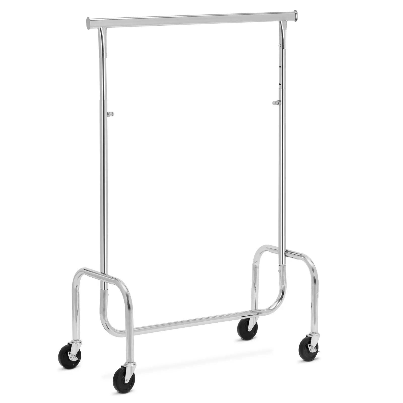 Royal Cateringin rullaavalla vaatetelineellä luot järjestystä kaaokseen. Vaaterekki on kätevä tapa sinulle ja vieraillesi ripustaa monenlaiset vaatteet nopeasti ja pitää ne käden ulottuvilla. Olipa kyseessä ravintola, kahvila tai vaatekauppa – tee asioinnista yrityksessäsi helppoa ja tarjoa vieraillesi miellyttävä ostokokemus. Tämä tukeva vaateteline pyörillä kestää jopa 150 kg painon, joten se on ihanteellinen ratkaisu raskaille vaatekappaleille, kuten takeille tai puvuille. Vaateteline on erityisen kompakti, joten se sopii ihanteellisesti pieniin tiloihin. Jos sinulla on kuitenkin käytössäsi enemmän tilaa, sen kokoa voidaan helposti muuttaa. Vaatetanko on pidennettävissä välillä 100 – 170 cm, jolloin se tarjoaa tilaa suuremmallekin määrälle vaateripustimia. Myös korkeus on säädettävissä välillä 129 – 181,5 cm. Näin tämä tukeva metallinen vaateteline voidaan mukauttaa erilaisille vaatteille sopivaksi – ripustit siihen sitten pitkiä mekkoja ja housuja tai paitoja ja takkeja. Teline tekee vaikutuksen neljällä kevyesti rullaavalla pyörällään. Erityisesti vähittäismyynnissä, messuilla, pop-up-kaupoissa, elokuvateattereissa sekä narikoissa ja tilapäisissä tapahtumissa voit sijoittaa ketterän vaatekärryn nopeasti ja helposti haluttuun paikkaan. Kaksi jarrullista pyörää pitävät vaatetelineen tukevasti paikallaan. Lisäksi telineen jalusta on todella helppo koota. Metallinen vaaterekki sopii erinomaisesti monenlaisten vaatteiden esittelyyn ja säilytykseen. Samalla se sopii kuitenkin myös tekstiilien kuivaamiseen. Se myös pitää vaatteesi kätevästi käden ulottuvilla valmistautuessasi juhliin, tai jos joudut siirtämään niitä pois remontin tieltä. Vaateteline on valmistettu kromiteräksestä, joten se on kestävä, ruostumaton ja helppo puhdistaa.