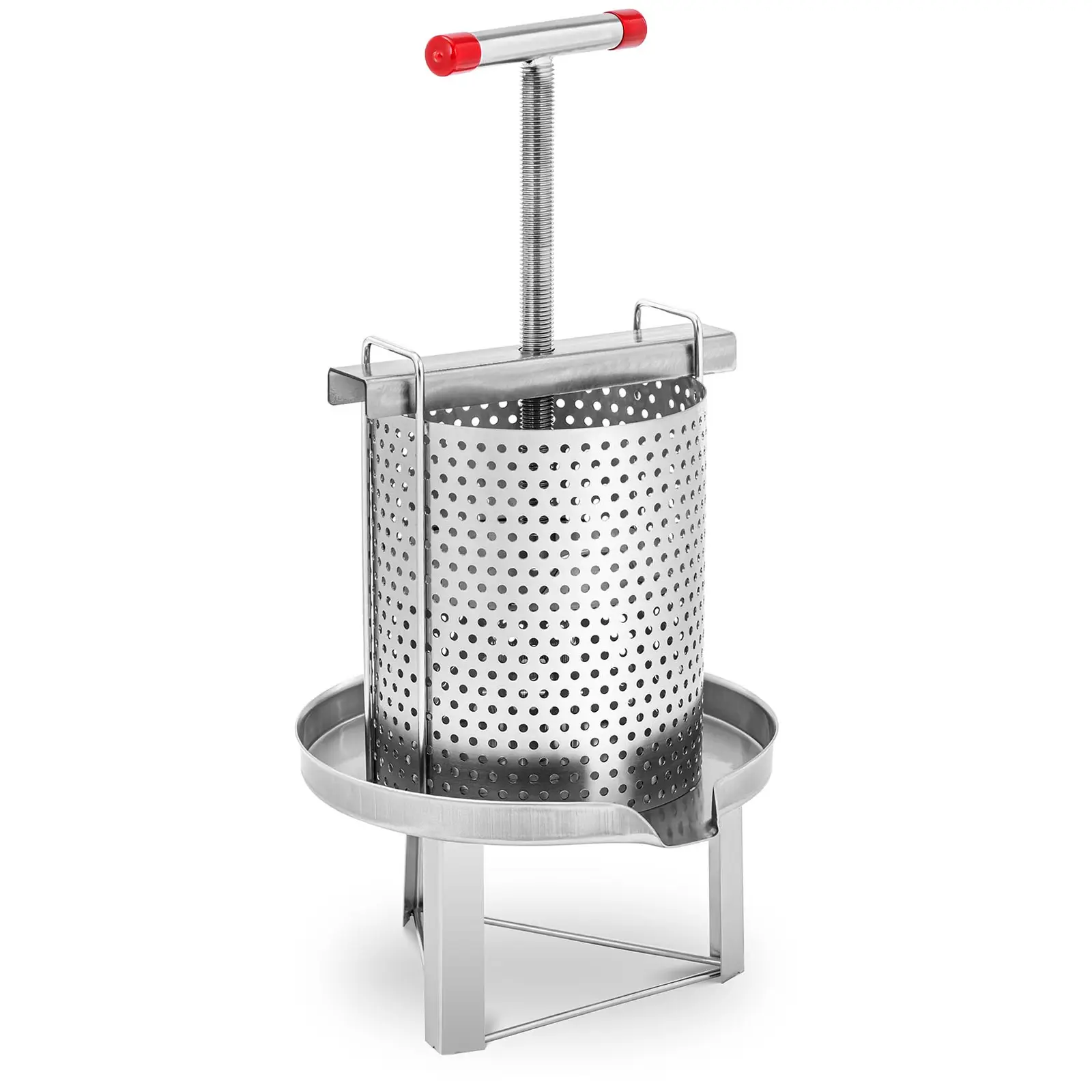 Wiesenfieldin vahapuristimen avulla keräät arvokkaan hunajan talteen viimeistä pisaraa myöten. Vankka malli erottaa hunajan aiemmin kuorituista kennoista käsikäyttöisesti. Voit käyttää tällaista hellävaraista kylmäpuristusta niin ammatti- kuin harrastuskäytössä. Tämä käsikäyttöinen vahapuristin sopii erityisen hyvin linkoamiseen sopimattomille kennoille. Lisäksi puristin soveltuu myös kiteytyneelle hunajalle. Jotta hunaja erottuu siististi vahasta, mehiläishoitoon tarkoitetun vahapuristimen toimitukseen sisältyy repeytymätön nylonverkko. Tällä keräät talteen vahajäämät samalla kun hunaja valuu 275 mm korkean astian aukoista. Malli on valmistettu vankasta ruostumattomasta teräksestä ja kestää optimaalisesti sekä mehiläishoidon korkeita hygieniavaatimuksia että raskasta puristuspainetta.