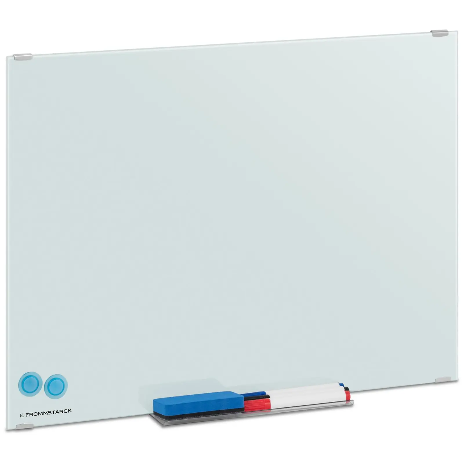 Fromm & Starckin valkotaulun STAR_WBM_04 avulla kaikki toimistotilat ja esittelyhuoneet päivitetään visuaalisesti ja toiminnallisesti. Käytännöllinen magneettitaulu sopii mihin tahansa sisustustyyliin ajattomalla muotoilullaan ja valkoisella pinnallaan. Mukana toimitettavan kiinnitysmateriaalin ansiosta se on myös nopeasti ja helposti kiinnitettävissä. Aivoriihi, ajatuskartat tai parhaat kuvat edellisistä yritysjuhlista: ideat voidaan kirjata ylös nopeasti tai tiedot esittää houkuttelevalla tavalla magneettisella valkotaululla. Mitoiltaan 60 x 45 x 0,4 cm oleva valkotaulu tarjoaa tarpeeksi tilaa muistiinpanoille, muistutuksille, viesteille, kuville tai kalenterille. Taulun erityinen temperoitua lasia oleva pintapäällyste estää sen värjäytymisen tai naarmuuntumisen myös intensiivisessä käytössä. Takaosa on valmistettu kestävästä materiaalista (galvanoitu teräs), joka takaa valkotaulun hyvän vakauden ja pitkäikäisyyden. Yksinkertaisen kokoonpanon ansiosta tämä malli on käyttövalmis käden kääntessä. Lisäksi mukana toimitetaan magneetteja ja joustava muovinen kynäteline, jotta taulu voidaan ottaa käyttöön heti saapumisen ja kiinnityksen jälkeen.