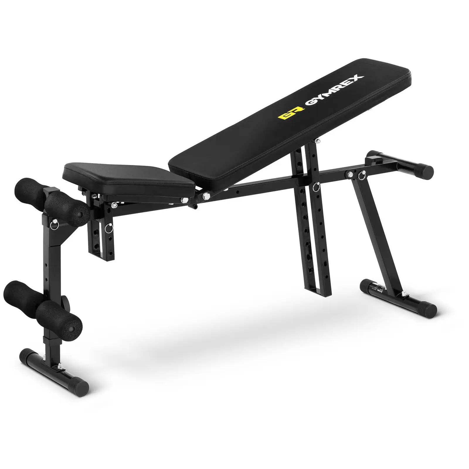Käsipainoharjoite „perhonen“, istumaannousut tai selkäsoutu – vatsa- ja vinopenkki GR-SI50 tarjoaa sinulle mahdollisuuden harjoittaa lihaksiasi kotona monella eri tapaa. Säädä penkki haluamaasi asentoon, sekä selkänojan että istuimen kulma on säädettävissä. Monitoimipenkki tarjoaa sekä tasa- että vinopenkin edut. Näin sinun on mahdollisuus suorittaa lukuisia lihasharjoituksia ja harjoittaa koko kehon lihaksia. Urheilu & terveys ovat aina tärkeämpiä elämässämme – tasapainottamaan arkea sekä ennalta ehkäisemään sairauksia. Tästä syystä Gymrex tarjoaa sinulle laadukkaita kuntoilulaitteita. Säädät istuimen, selkänojan ja jalkatuen vain muutamalla käden käänteellä. Istuin voidaan säätää neljään eri asentoon ja jopa 40° kulmaan. Selkänojalle on mahdollisuus valita 10 eri asentoa ja jopa 90° kulma istuvaltaan tehtäville harjoituksille, kuten käsipainoilla suoritettu pystypunnerrus. Jalkatuki on korkeudesta säädettävä ja siinä on viisi eri säätöasentoa. Vatsa- ja vinopenkin istuin ja selkänoja on pehmustettu mukavaksi ja päällystetty PVC-nahalla. Tämä materiaali on erittäin kestävä ja helppo puhdistaa. Penkin runko on lujatekoista terästä. Täten penkki kestää jopa 120 kg kuormitusta. Huomioithan kuormituksessa oman painosi lisäksi käyttämiesi punttien painon!